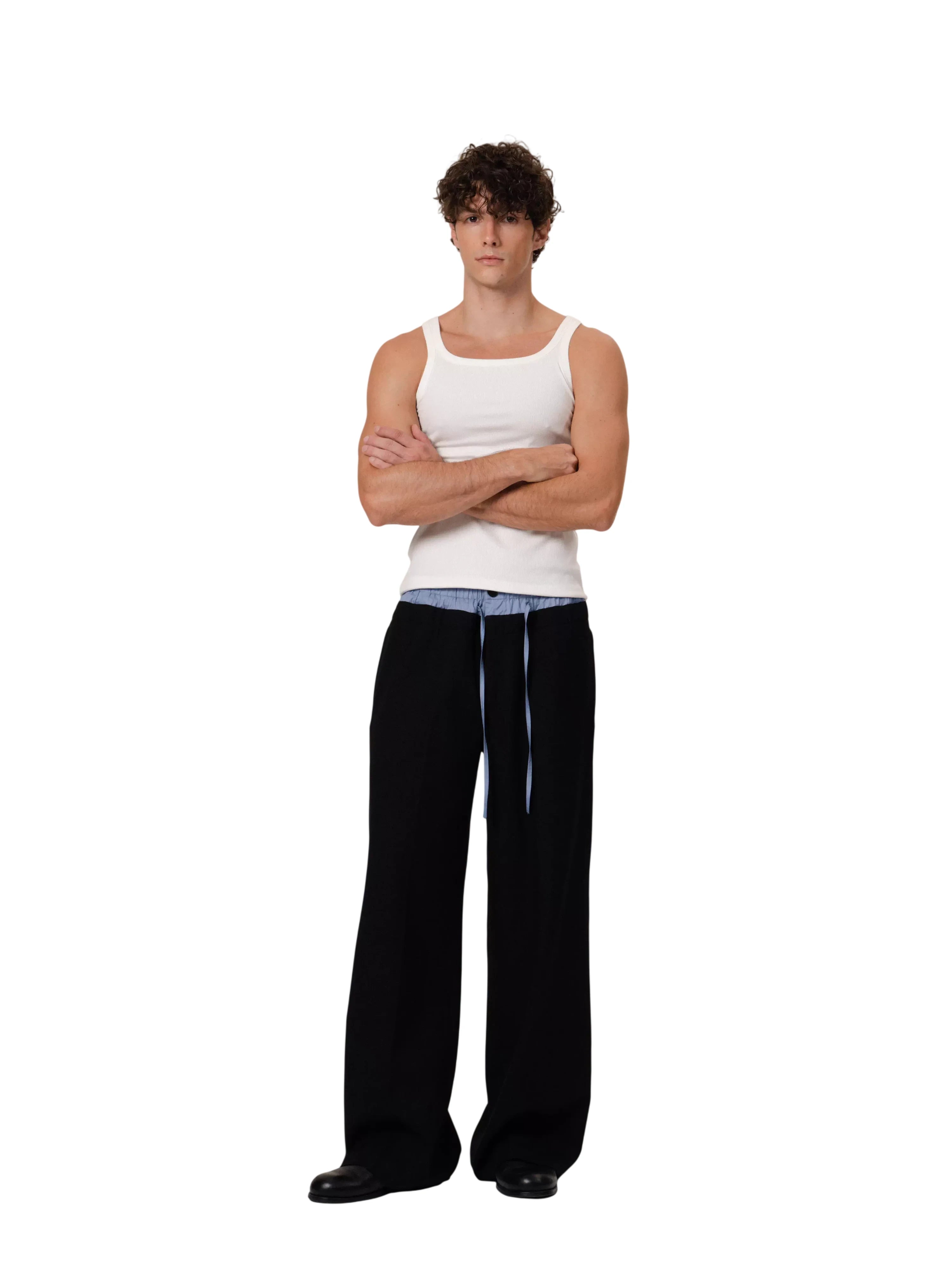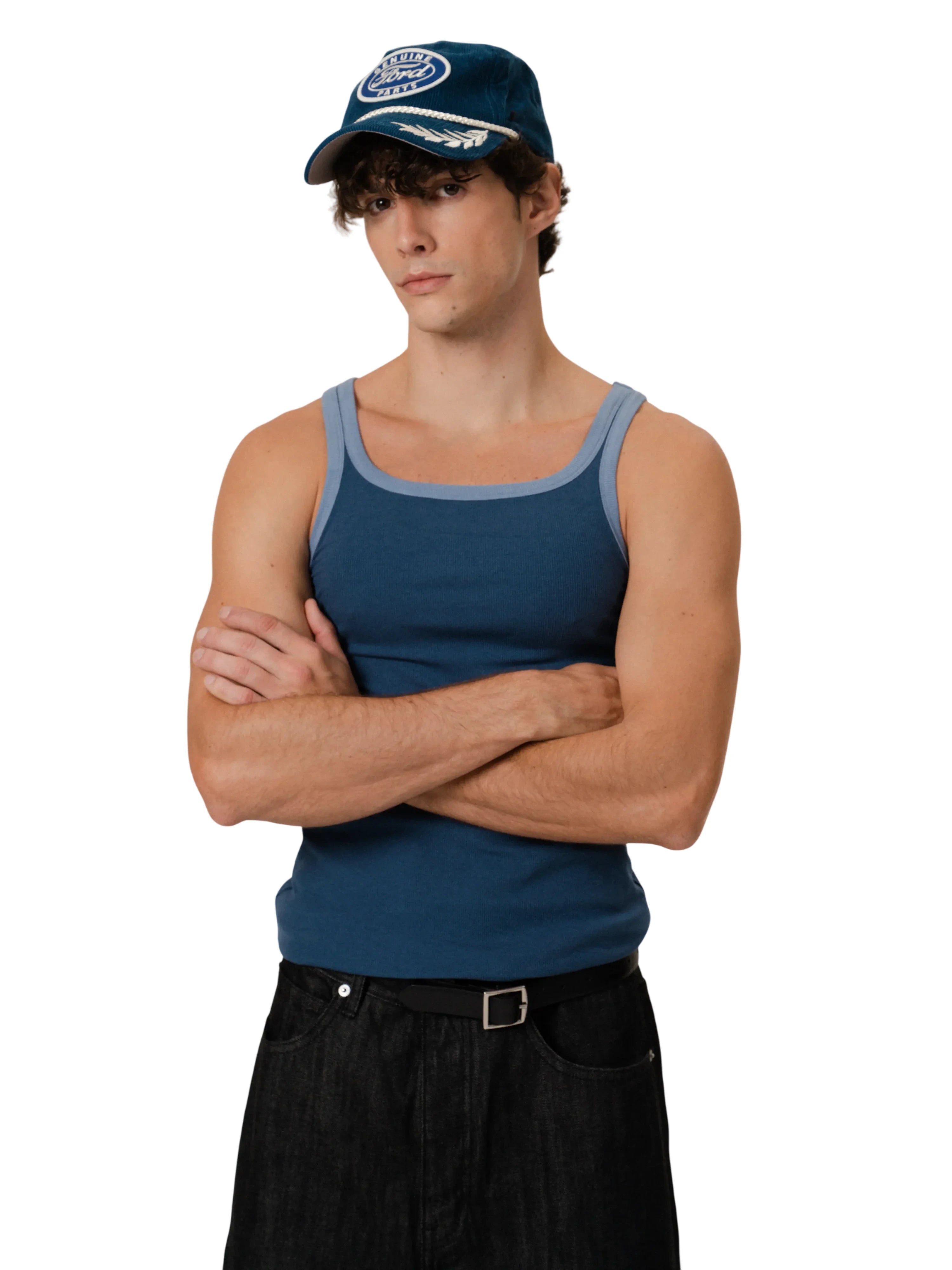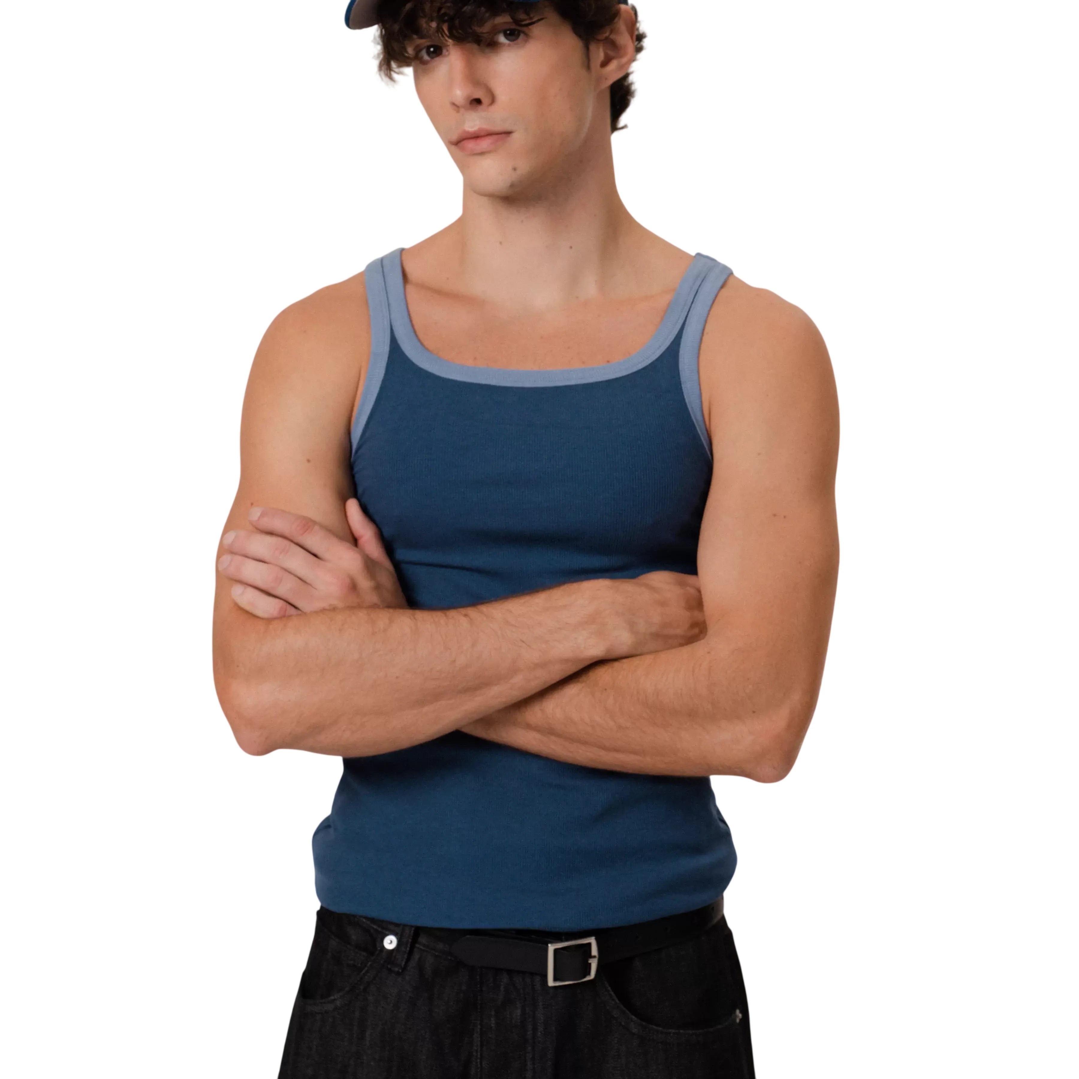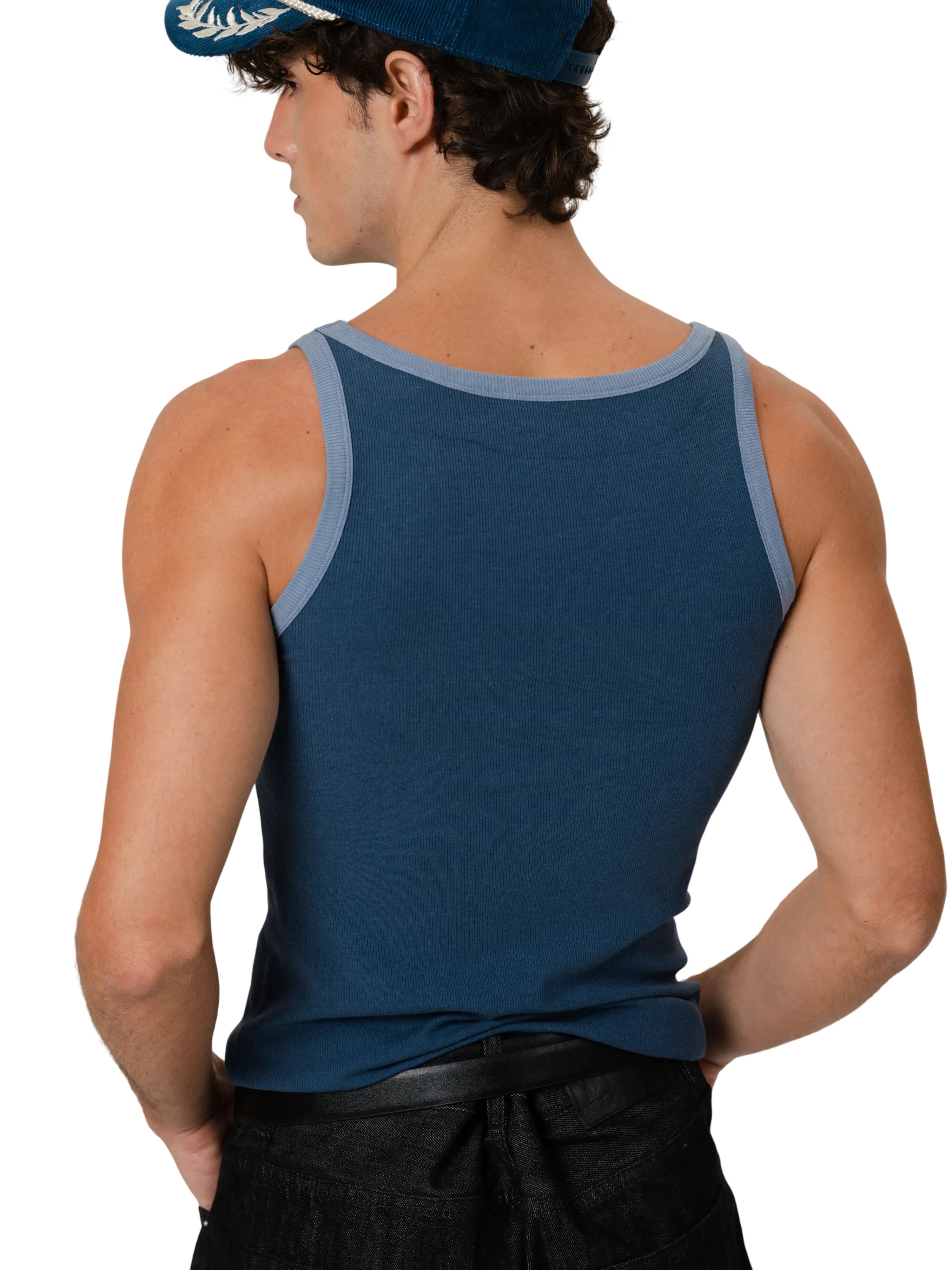 This men's slim fit tank top features a ribbed texture and a modern narrow shoulder design. Crafted from stretchy, form-fitting fabric, it offers both comfort and style. The dark blue color is accented with light blue contrast trim along the neckline and armholes for a sporty finish. Ideal for layering or wearing solo in warm weather.