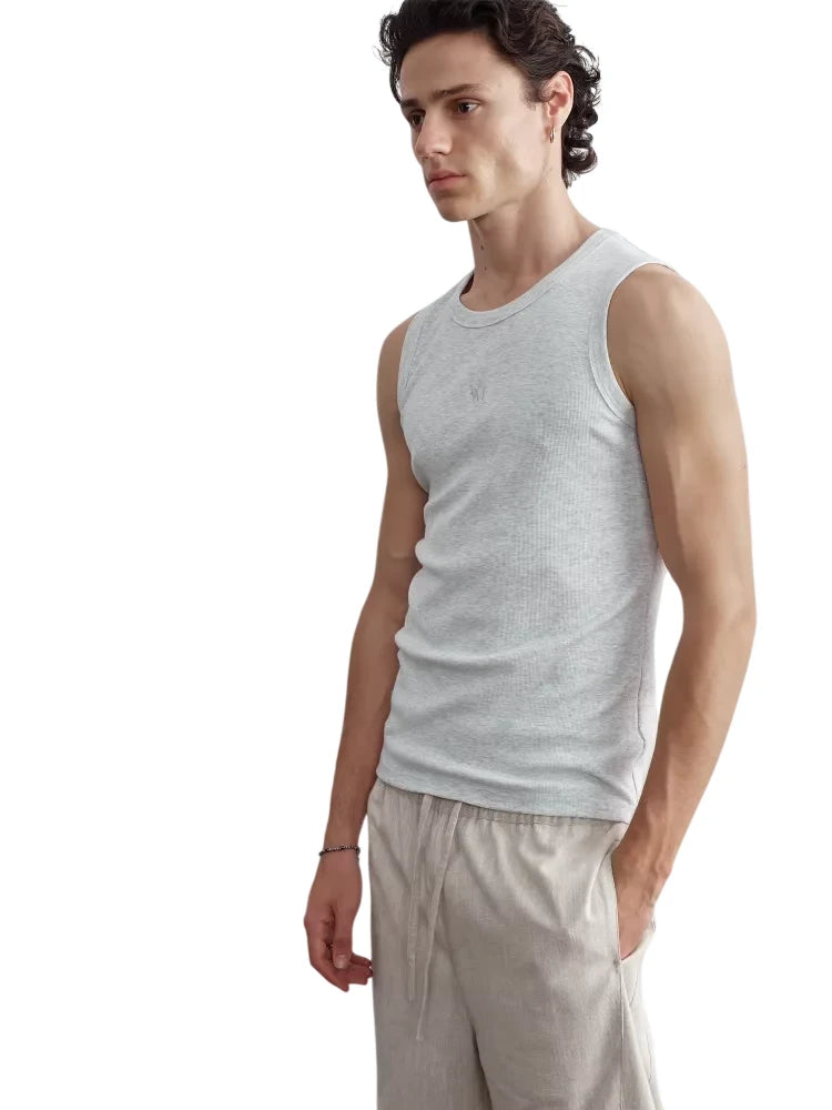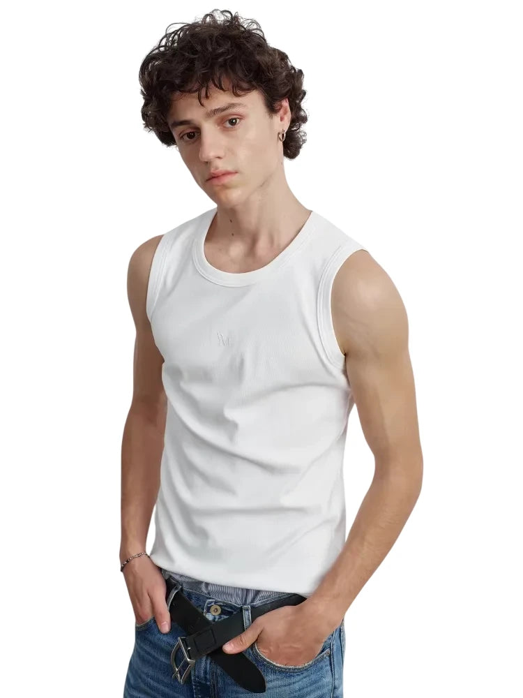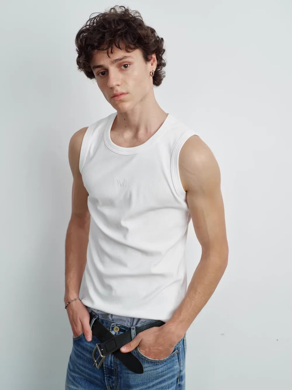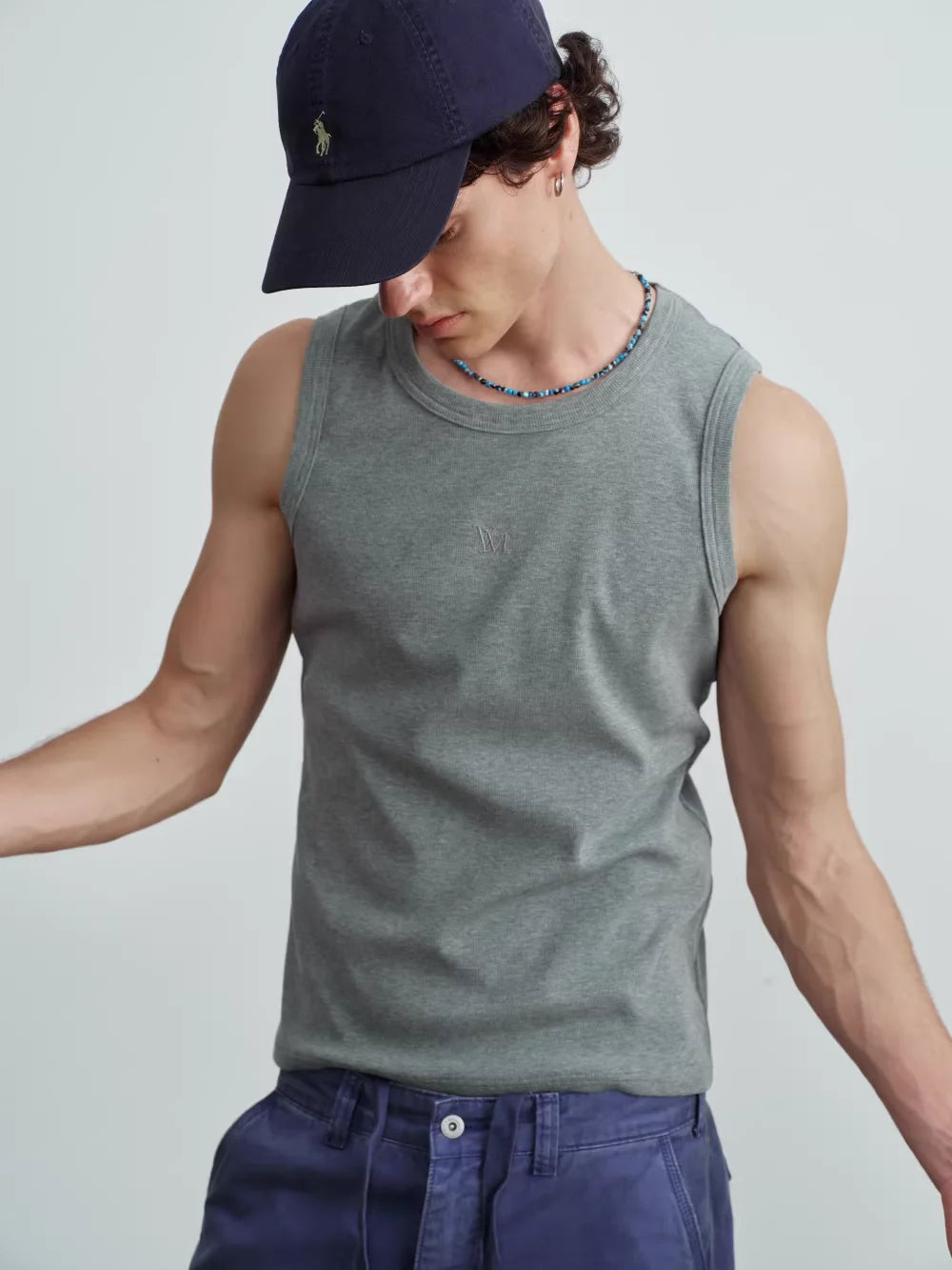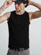 This men's sleeveless training tank top is designed for both comfort and style. Crafted from heavyweight 300g fabric, it features a ribbed texture and stretchable material for a snug, athletic fit. The embroidered detailing adds a subtle retro aesthetic, making it ideal for gym workouts or casual everyday wear.