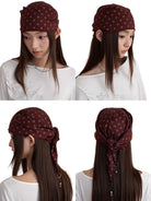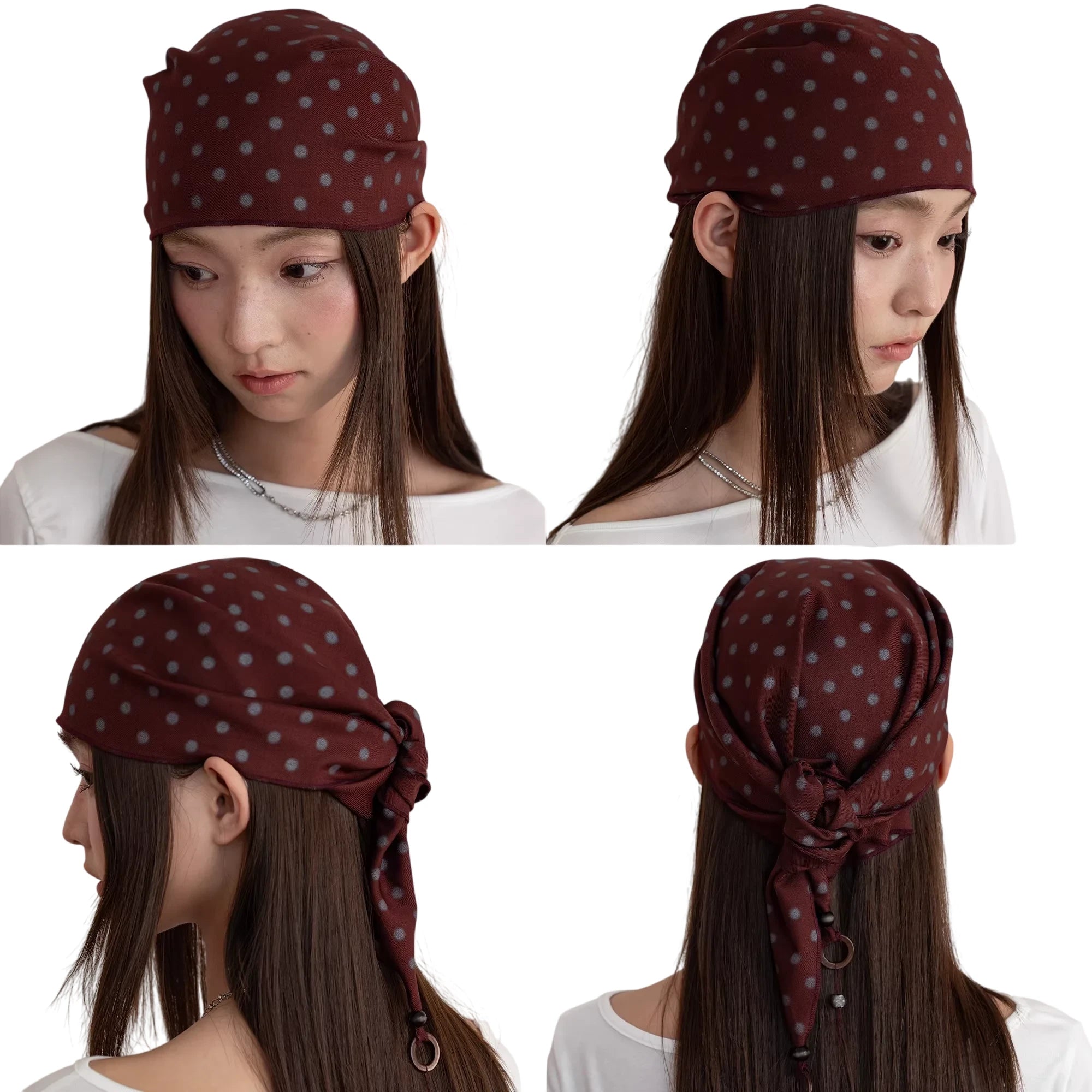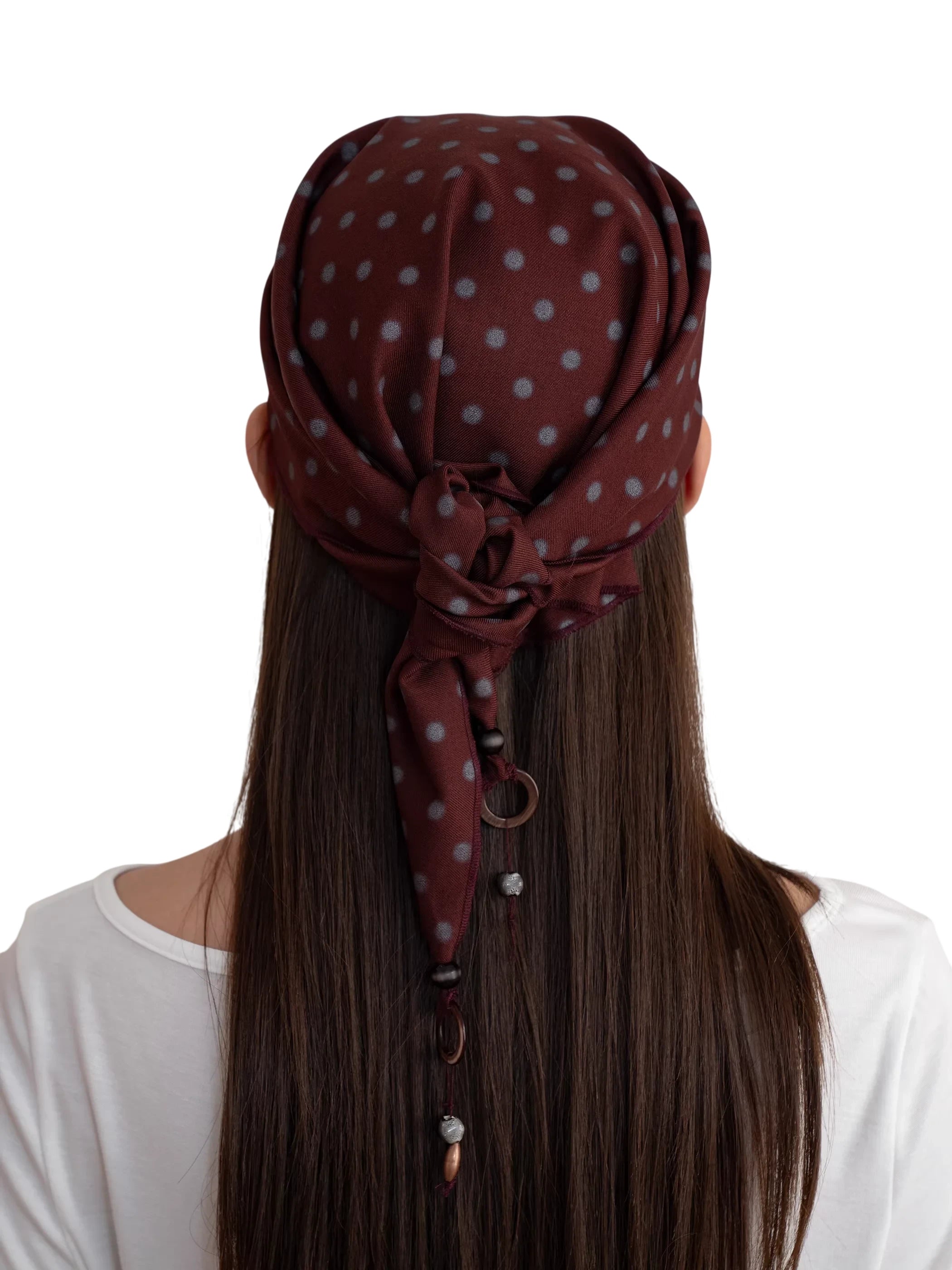 Elevate your seasonal wardrobe with this elegant dark red triangle headscarf, designed for women. Featuring a classic polka dot pattern in subtle grey, this vintage-inspired accessory ties comfortably at the back and is finished with a unique pendant detail. Its soft texture and literary style make it a perfect complement to autumn and winter outfits.
