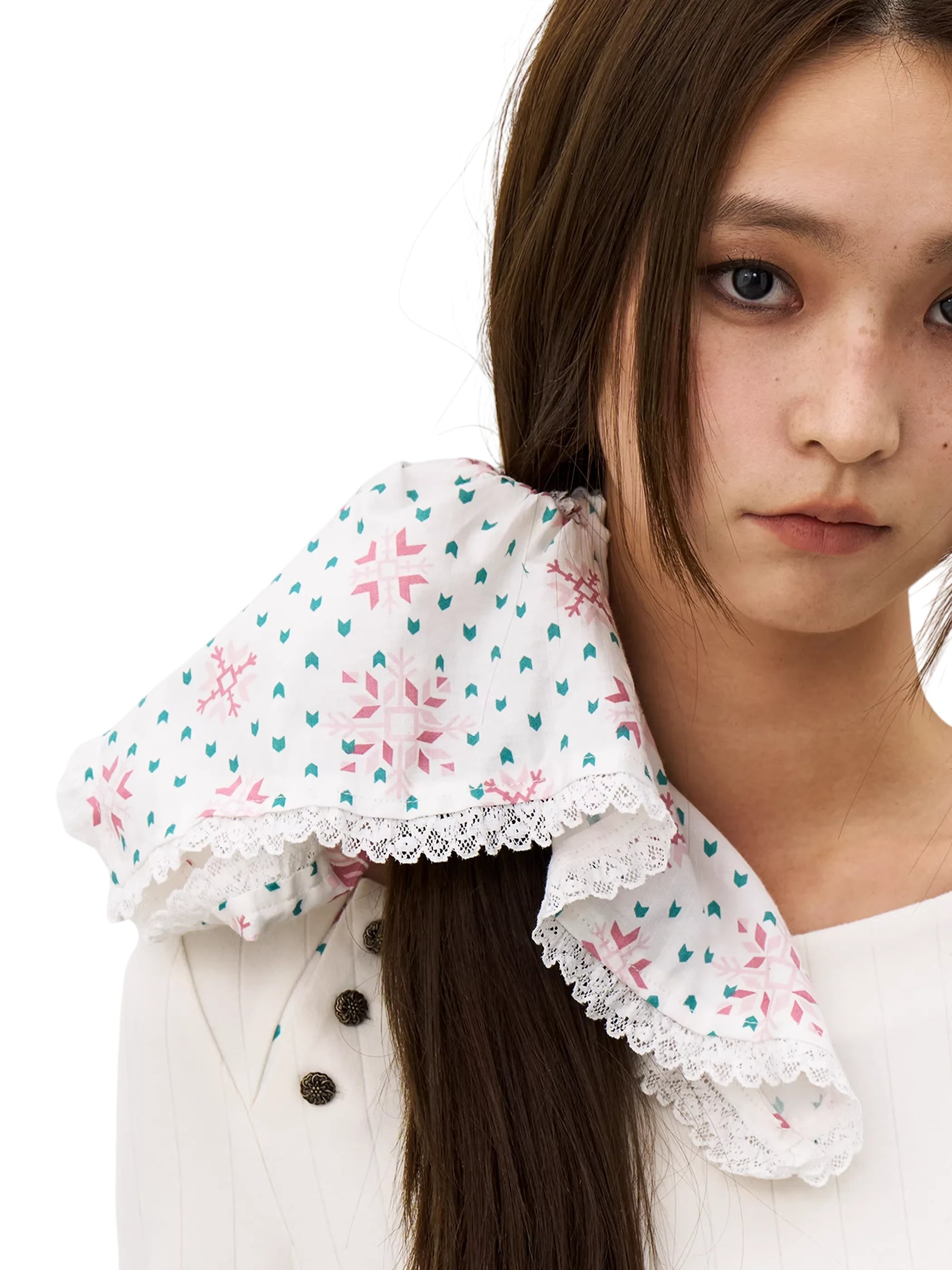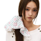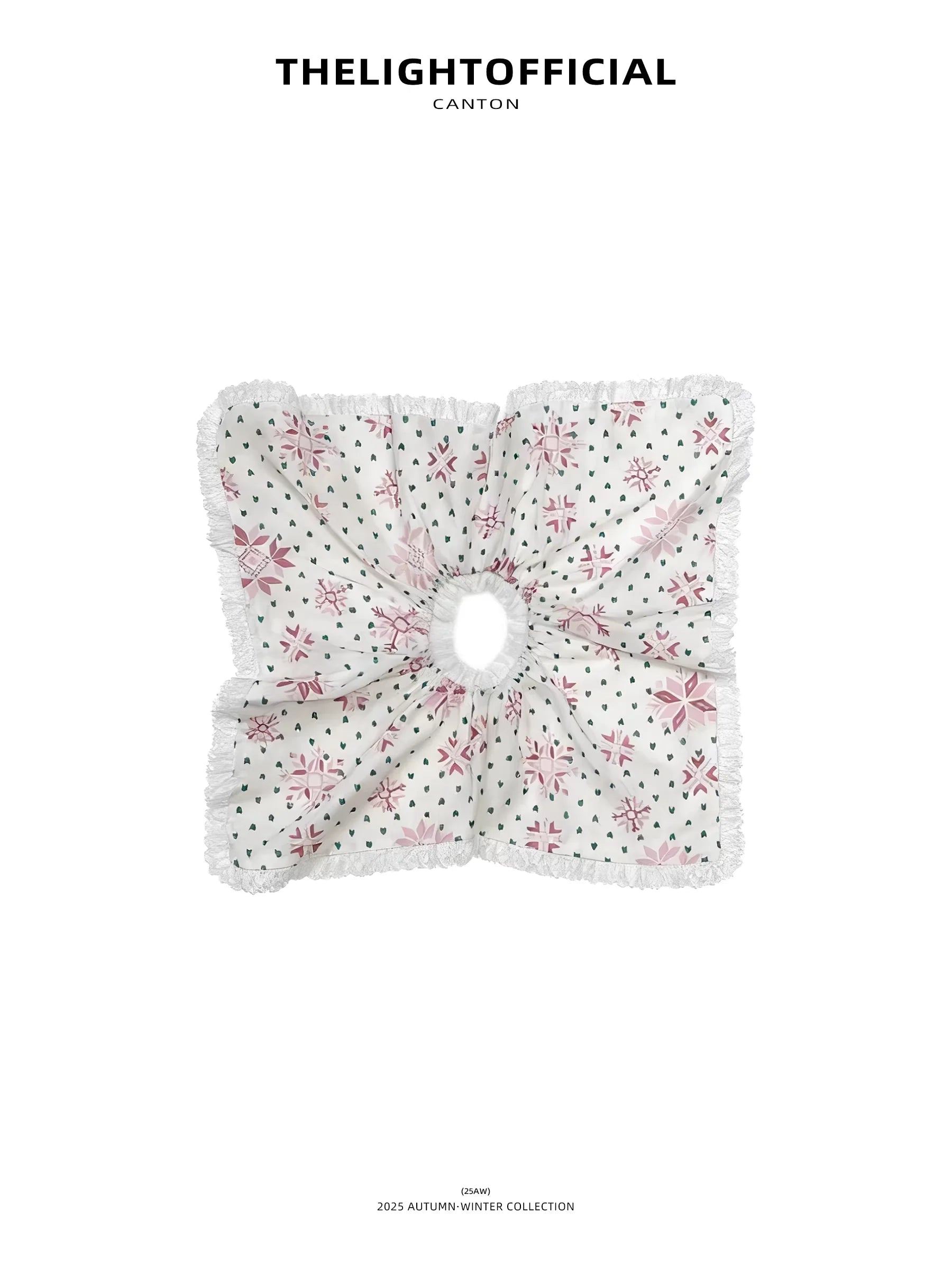This elegant hair accessory combines the charm of a scarf with the versatility of a scrunchie. Featuring a delicate white lace trim, it showcases a scattering of teal floral accents and pink snowflake-inspired motifs. Designed in a Korean style, this elastic scrunchie scarf creates a soft, feminine touch to any hairstyle, making it a stylish choice for young women.