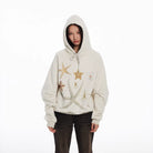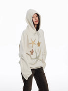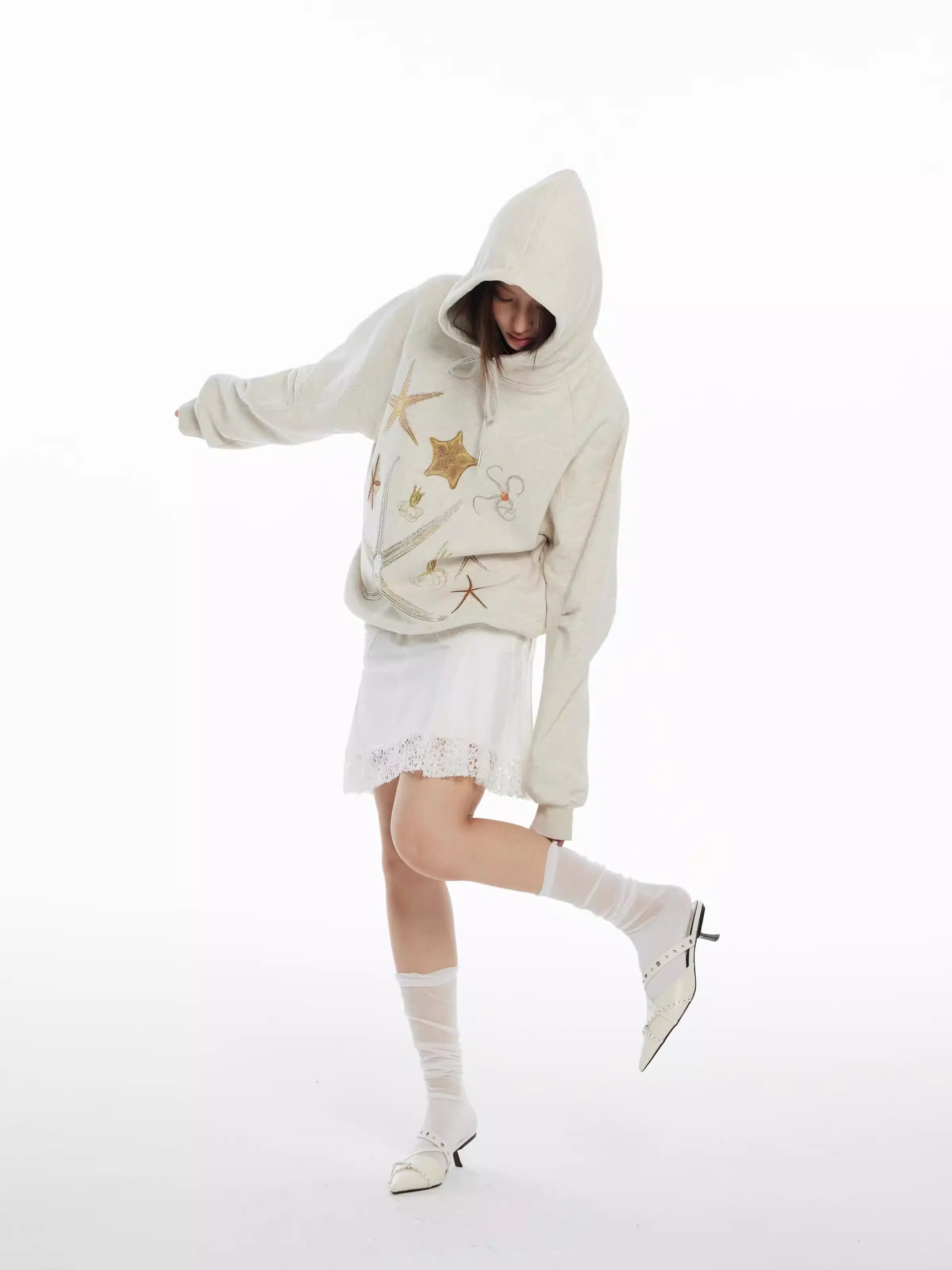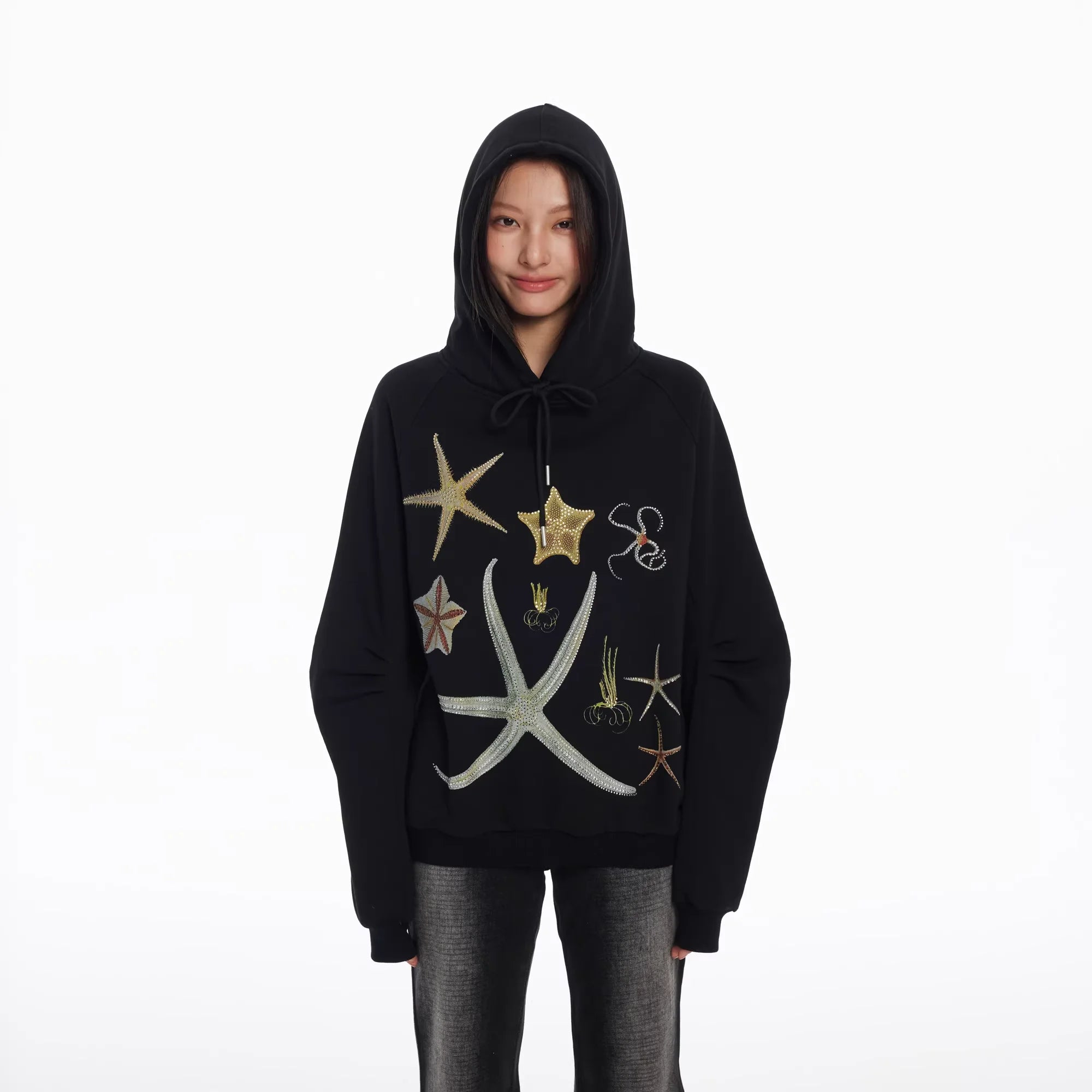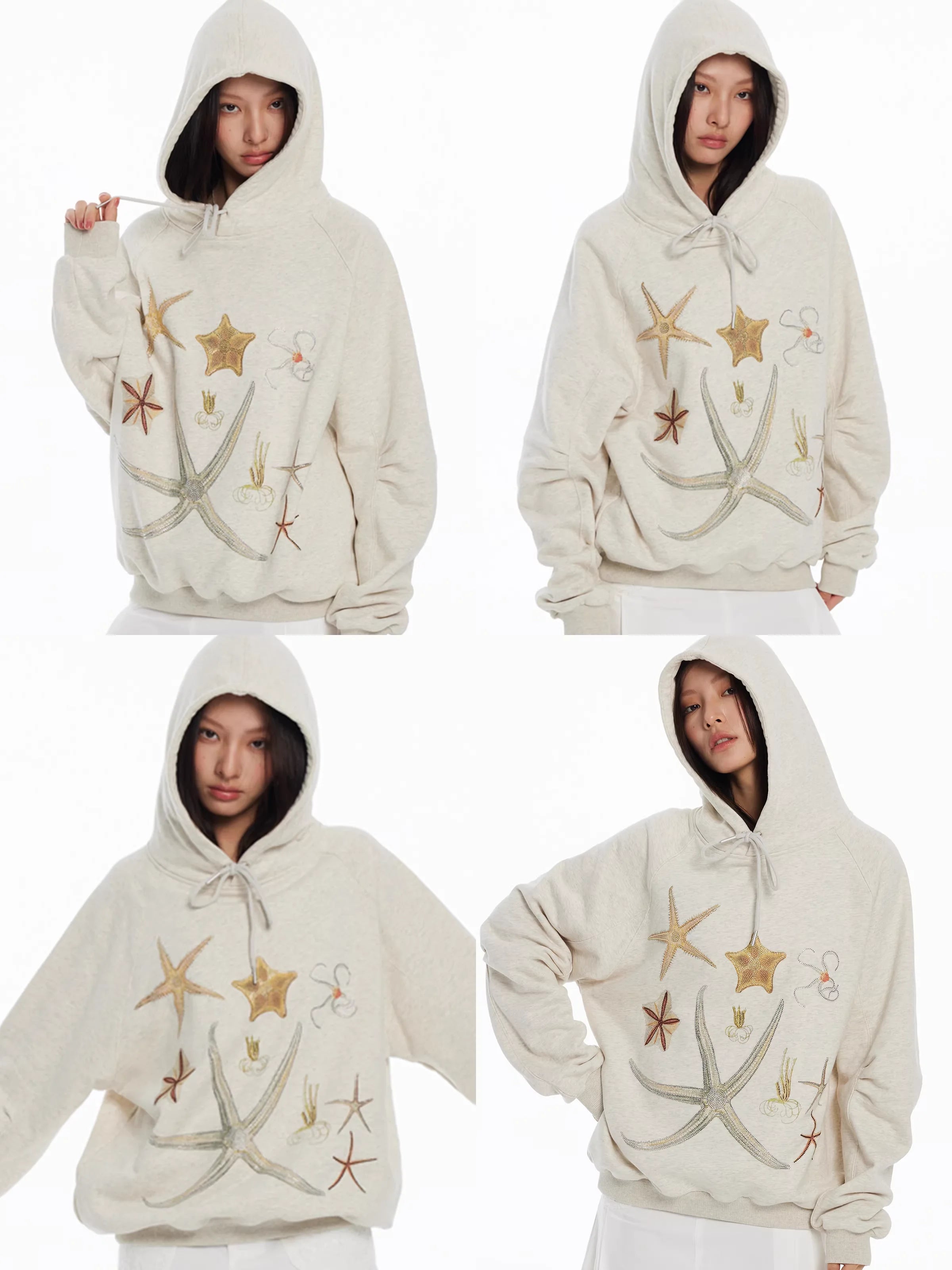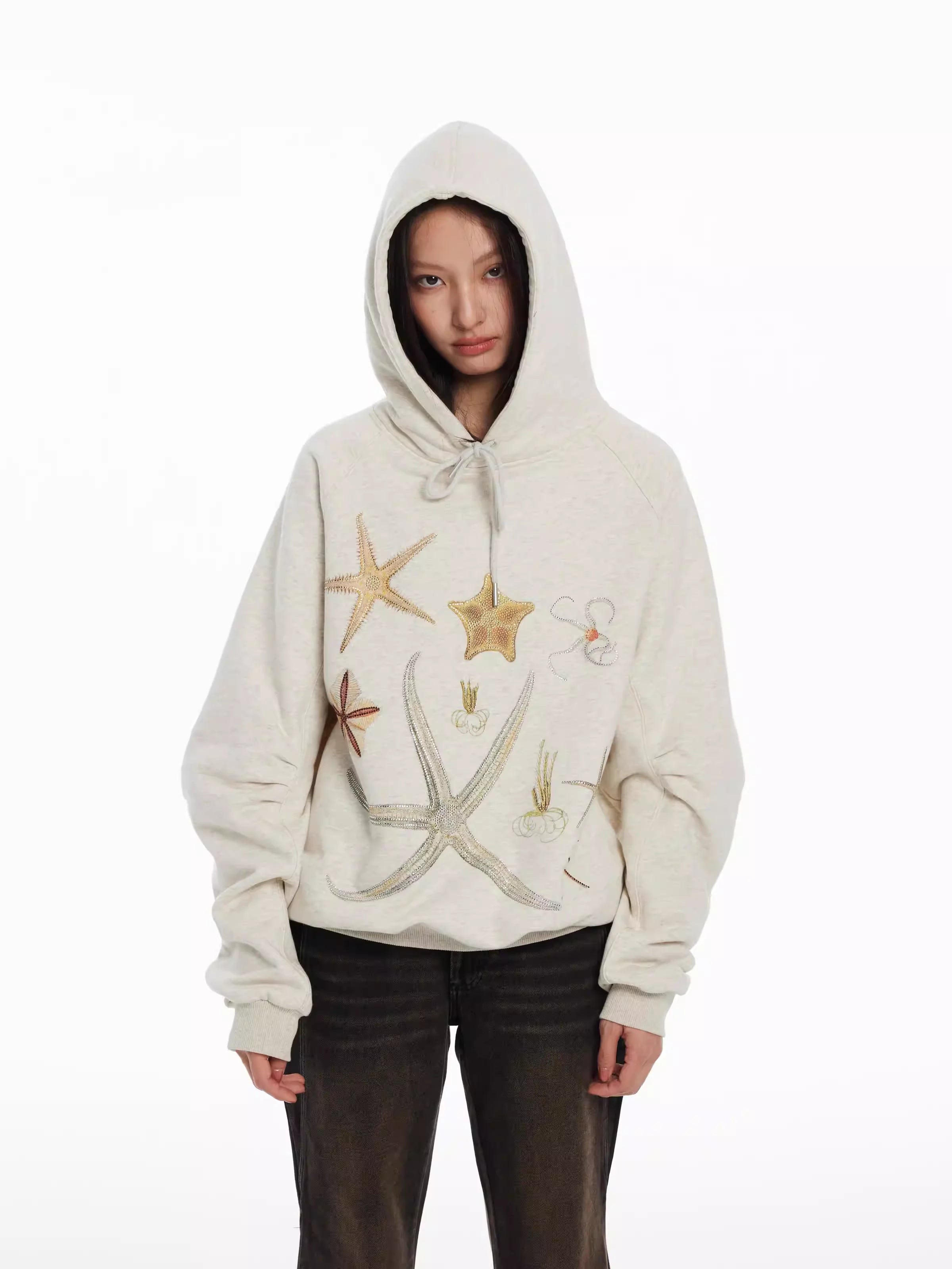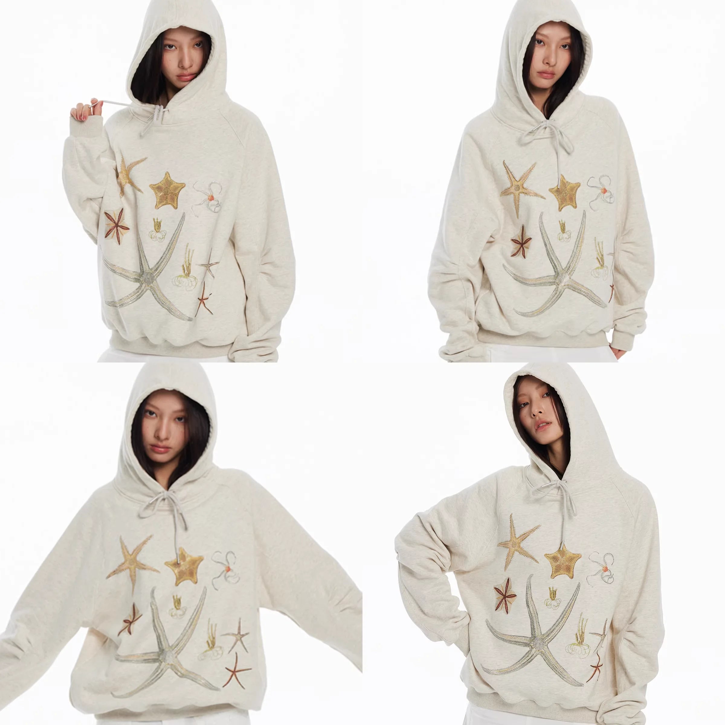Adorned with embroidered sea-inspired elements such as starfish, coral, and anemone motifs in earthy tones of gold, brown, and white, it offers a unique and original look. The design is completed with a drawstring hood and ribbed cuffs and hem for added warmth and style. Shown here modeled by a female model, this hoodie is an ideal choice for effortless seasonal layering.