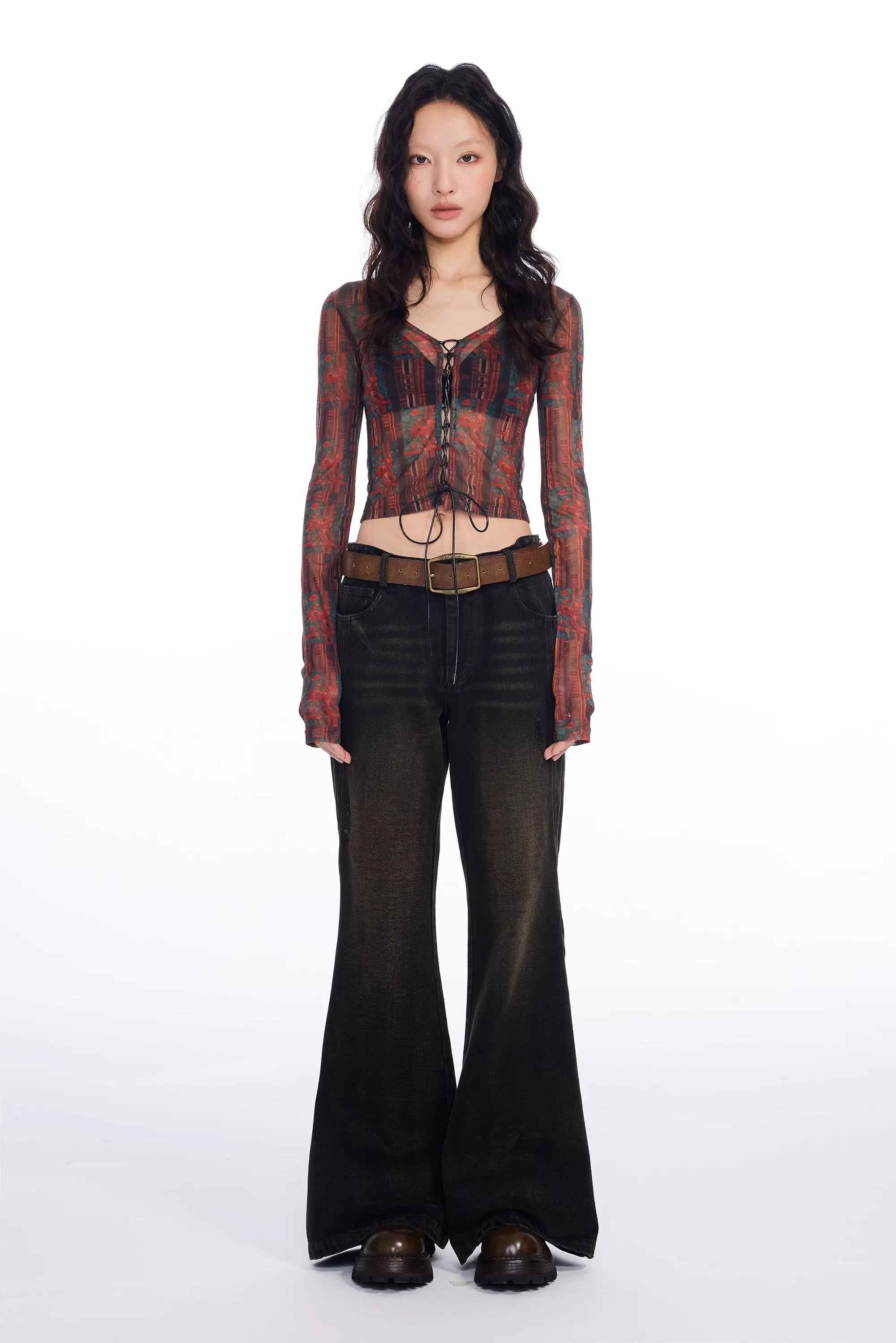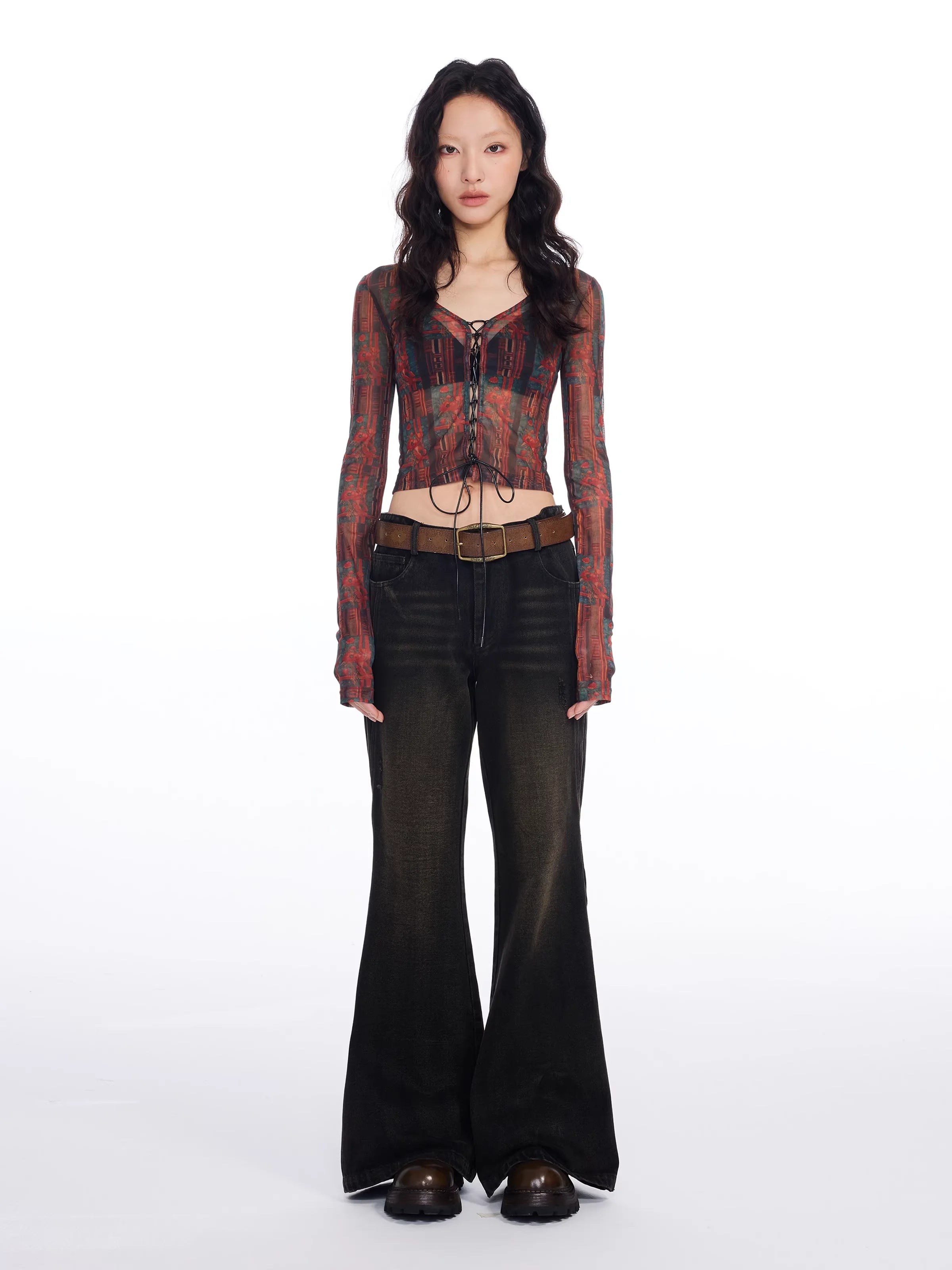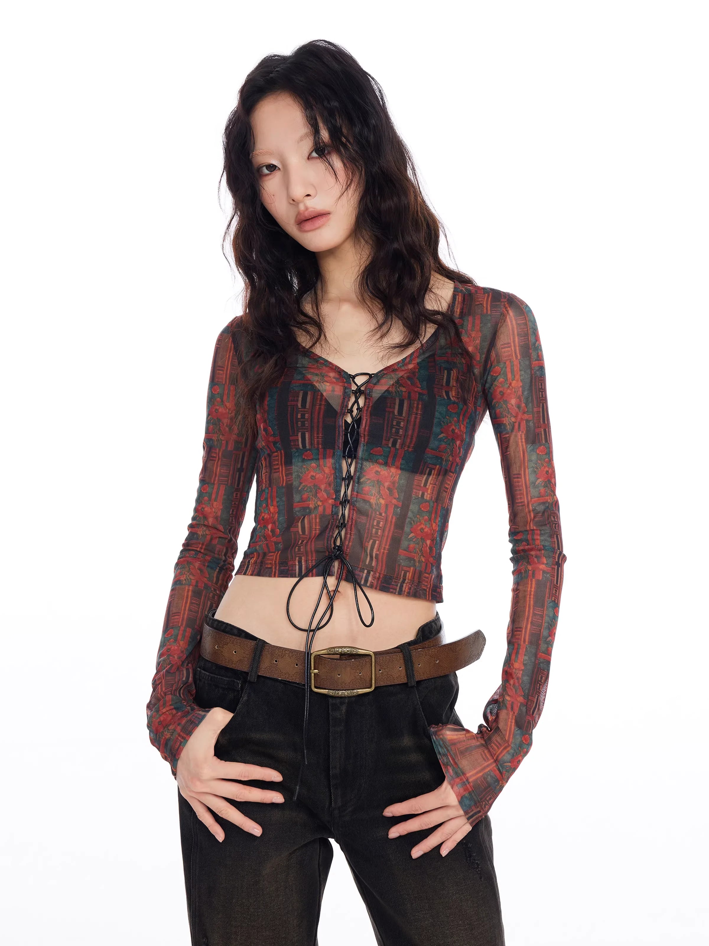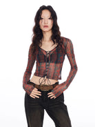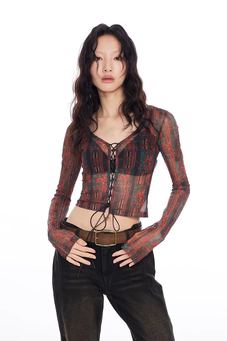 This stylish women's crop top features a striking red and black totem print on sheer mesh fabric that creates a bold, retro-inspired look. Designed with a slim fit and long sleeves, it includes lace-up front detailing and subtle ruffled hems for a sensual, figure-enhancing silhouette. The lingerie-inspired aesthetic is perfect for fashion-forward styling, making it an ideal piece for pairing with high-waisted bottoms or vintage denim.