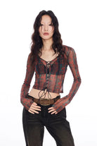 THELIGHT OFFICIAL Retro Lace-Up Mesh Crop Top with Totem Print - Slim Fit for Women