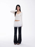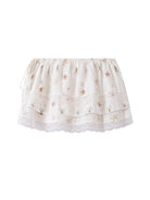 This whimsical white mini skirt features a delicate layered lace design with starfish and seashell embroidery in soft orange, beige, and grey tones. Designed with a tiered ruffle structure and finished with scalloped lace trim, it adds playful charm to any outfit. The skirt sits comfortably above the hips with a gathered elastic waistband, offering both style and ease. Modeled by a female, it's styled over wide-leg denim for a unique streetwear look.