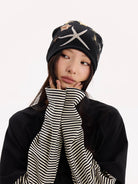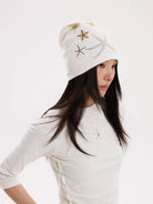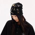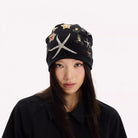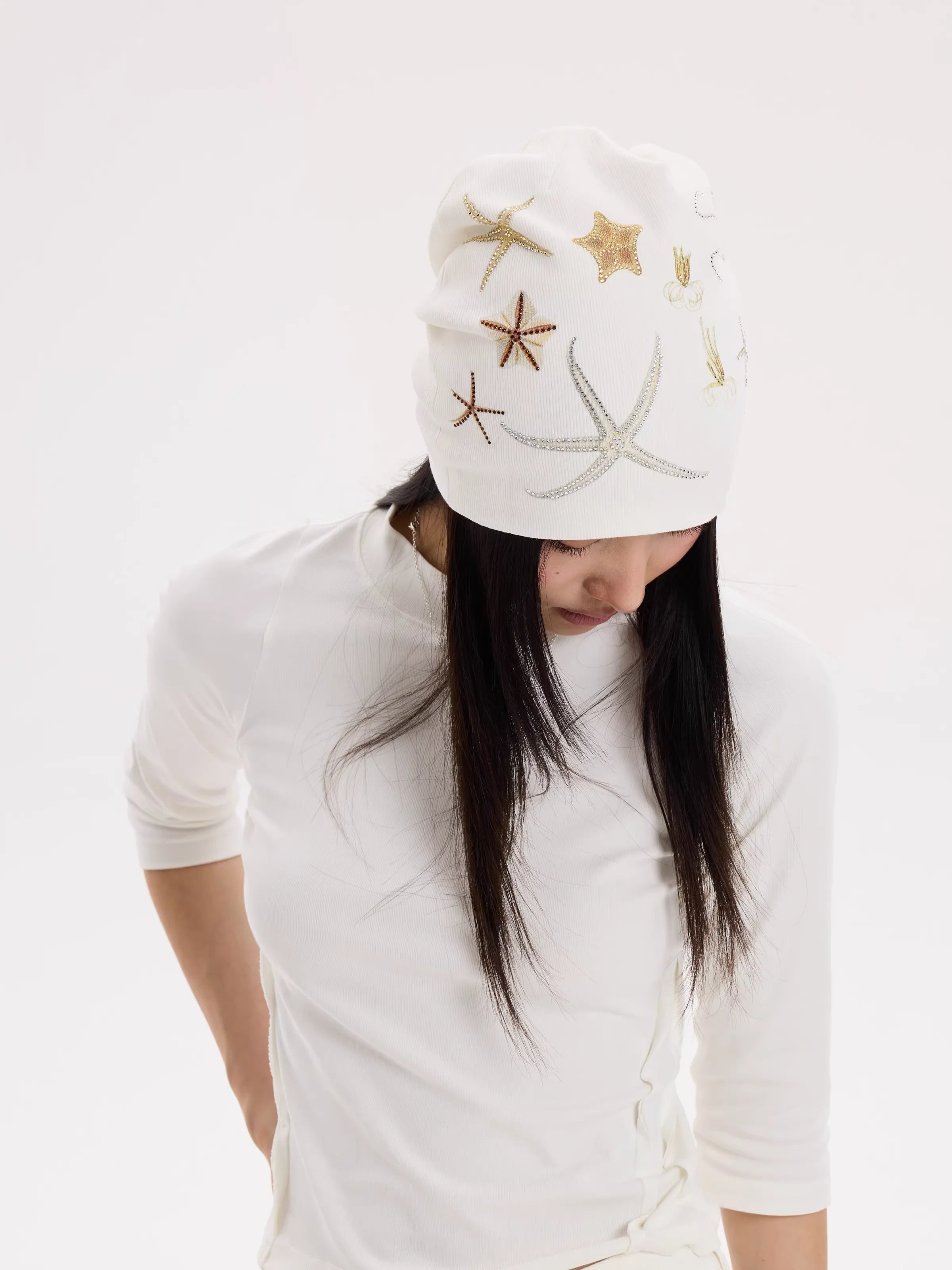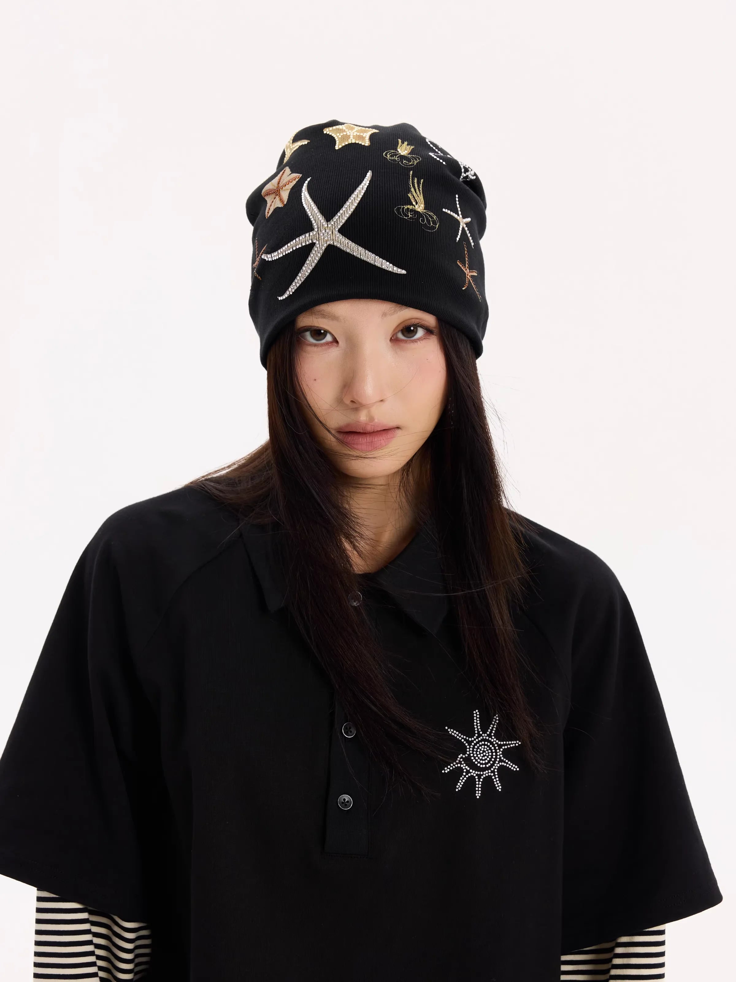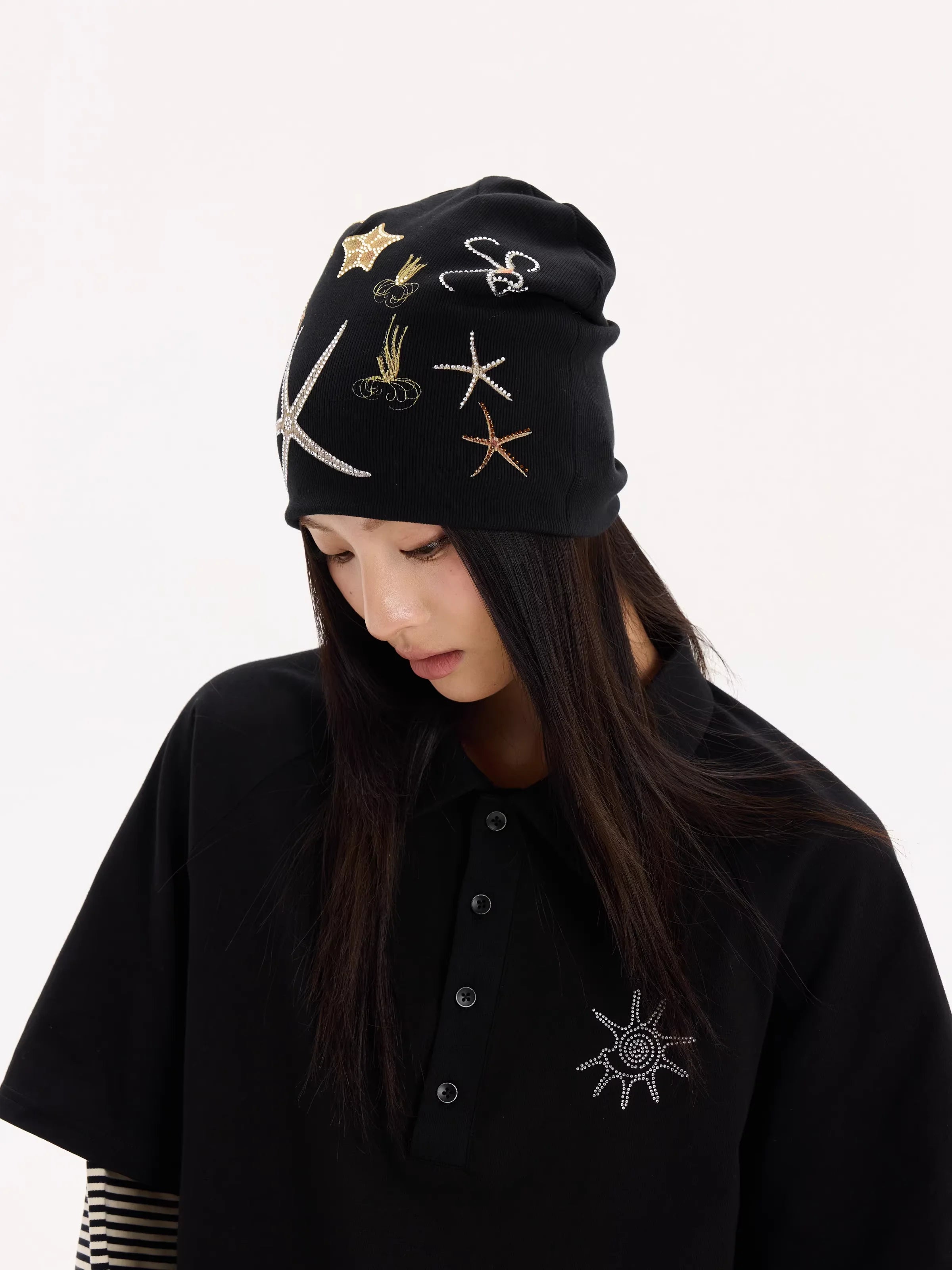 Stay warm in style with this winter-ready slouch beanie, featuring whimsical rhinestone and embroidered sea-themed accents including starfish and marine motifs. Designed in versatile black and white tones, this snug-fitting hat complements a variety of outfits while offering a flattering face-slimming effect. Perfect for adding a touch of charm to your cold-weather wardrobe.