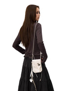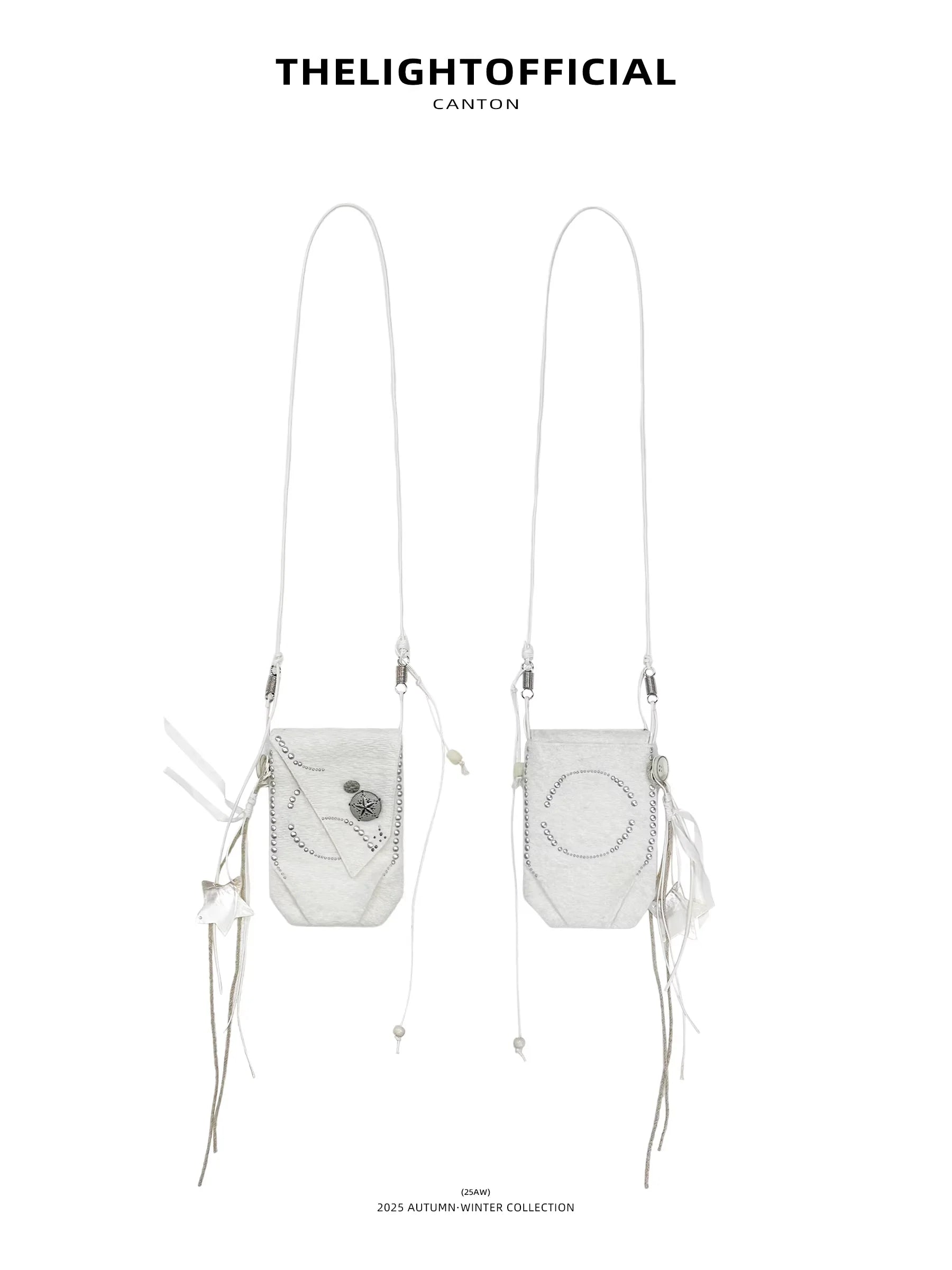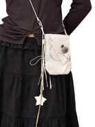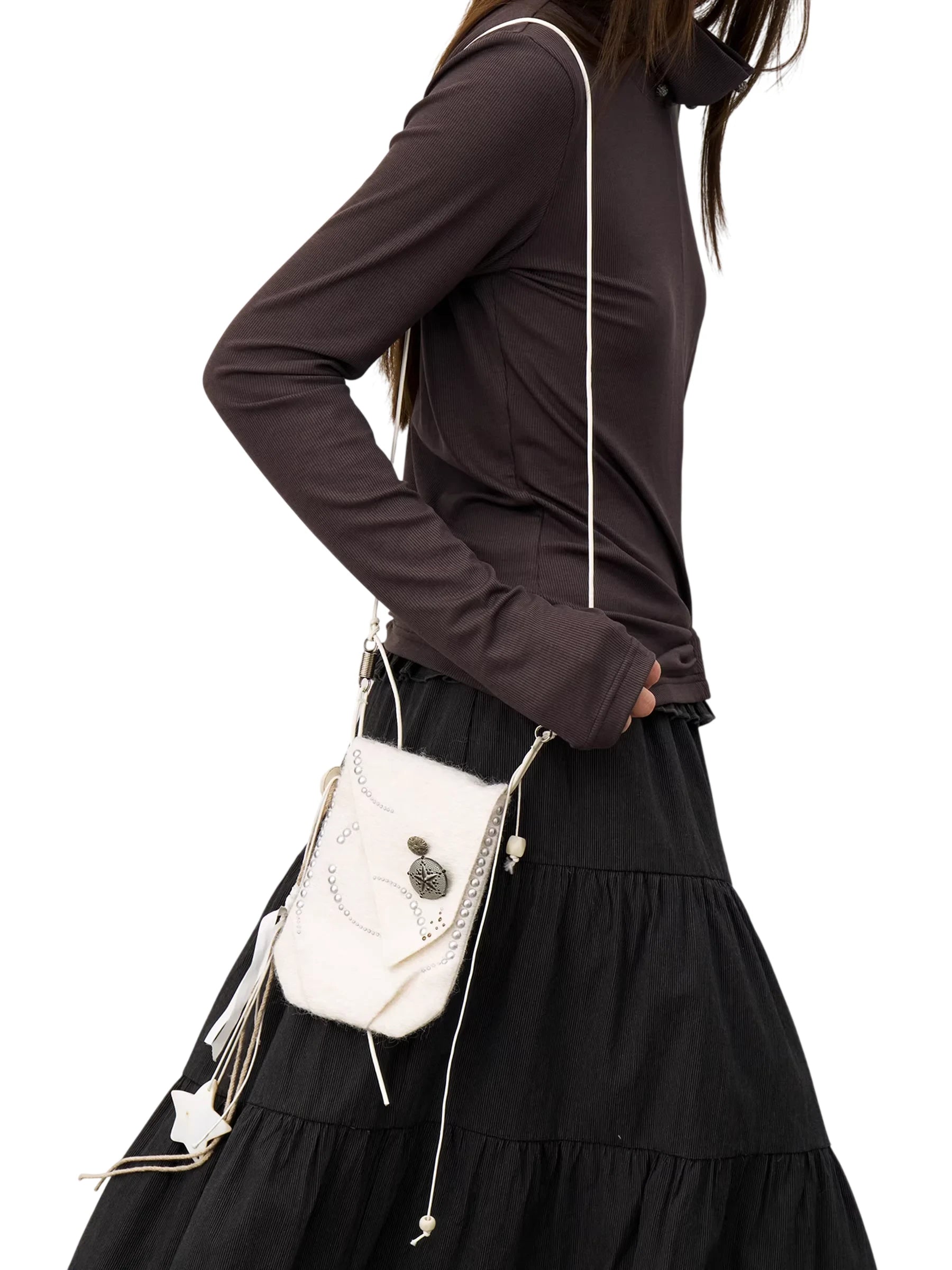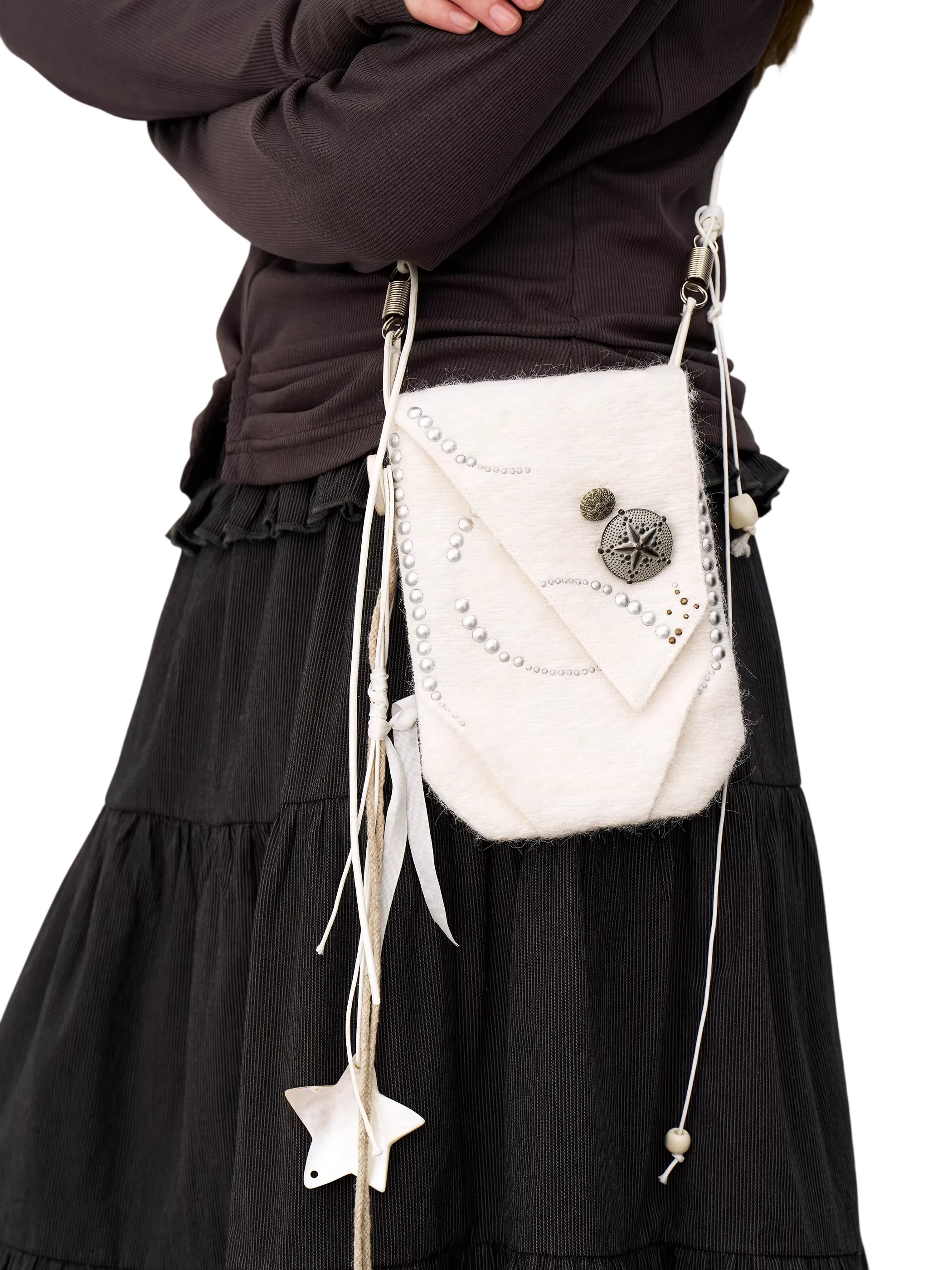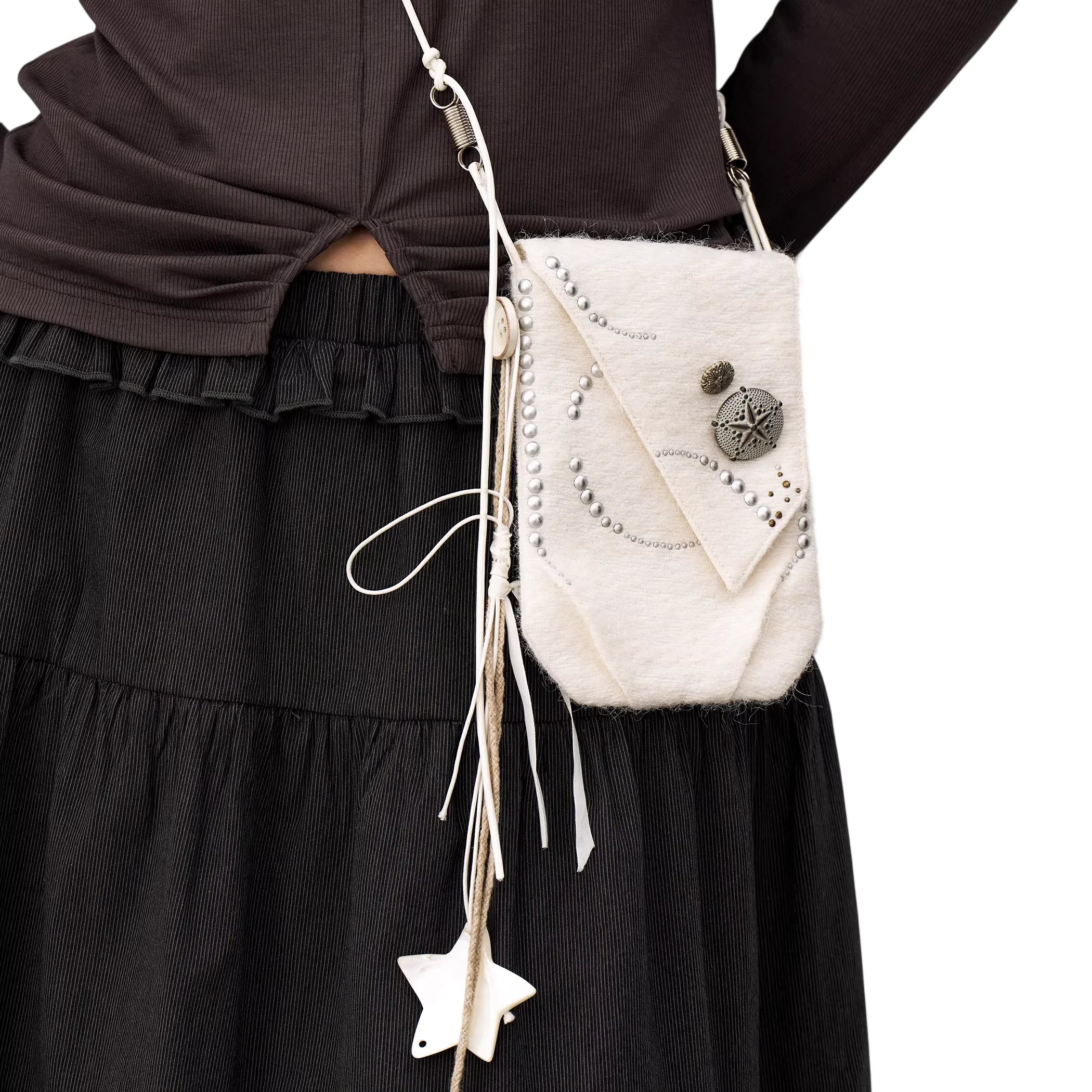 This elegant women's crossbody bag features a vintage-inspired design crafted from soft, cream white wool-like fabric. The asymmetrical flap is adorned with silver-tone studs and metallic buttons, including a unique starfish accent. A white string tie closure adds a handmade charm, while whimsical details like a twine-wrapped star-shaped charm and ribbon accents hang from the strap. Stylish and compact, this small shoulder bag offers a distinctive look perfect for casual or creative outfits.