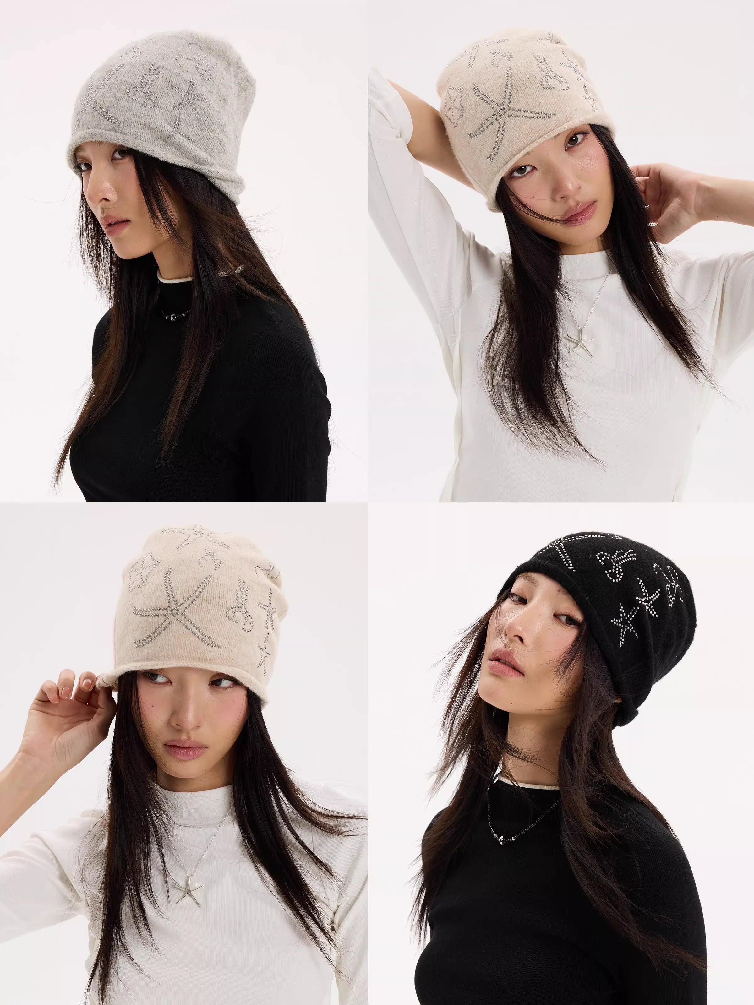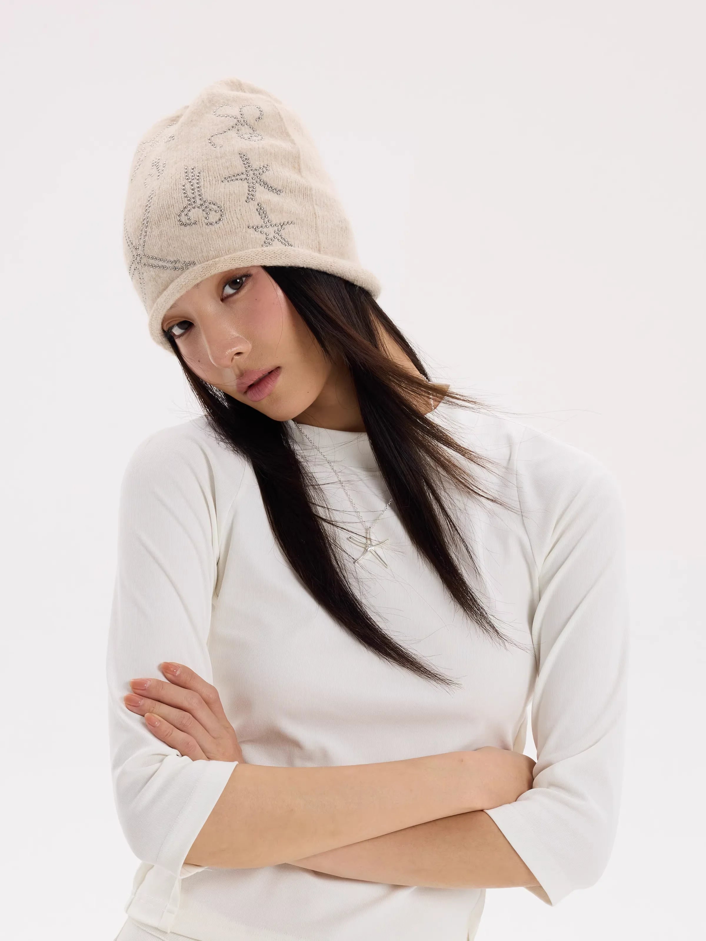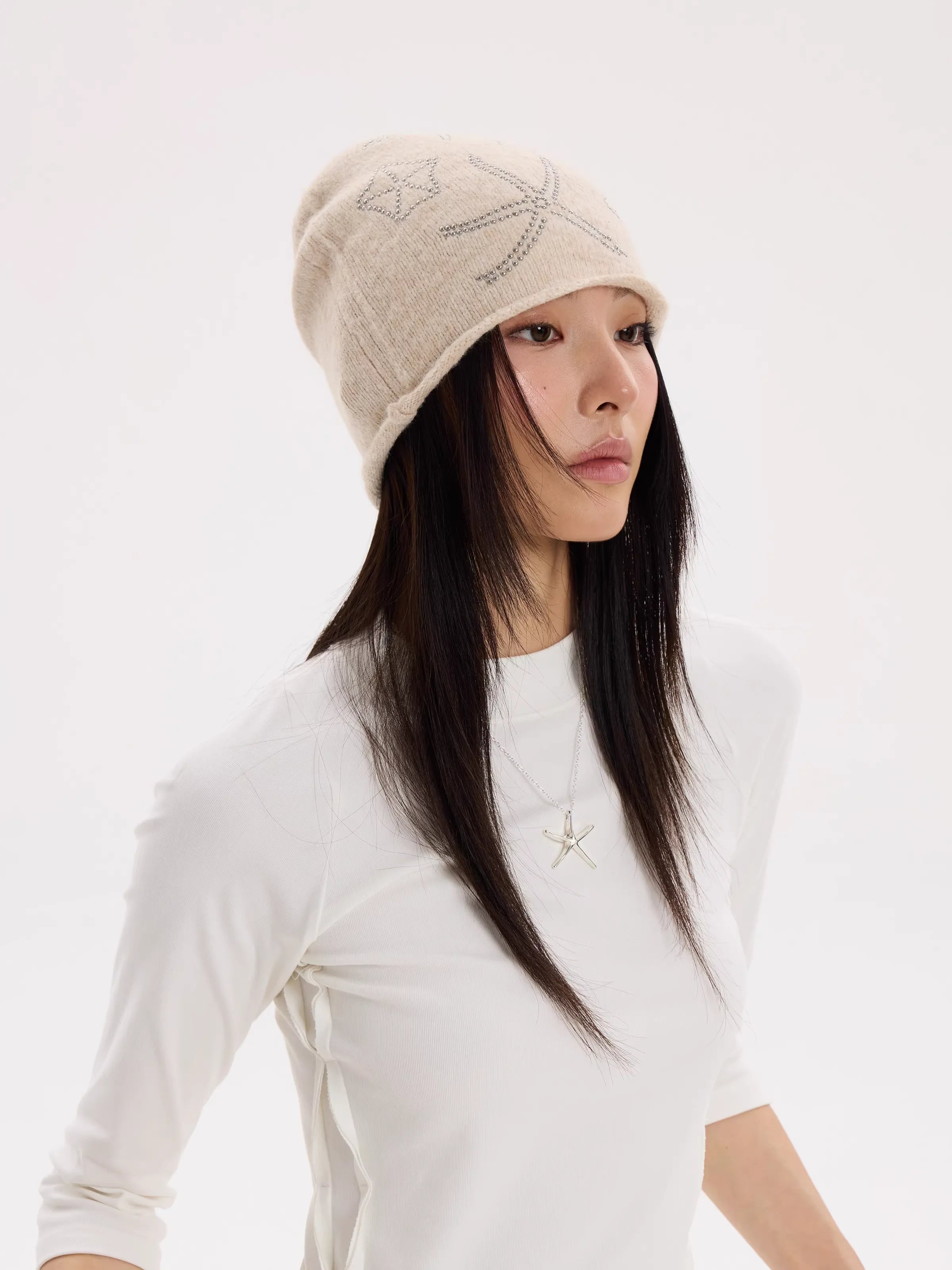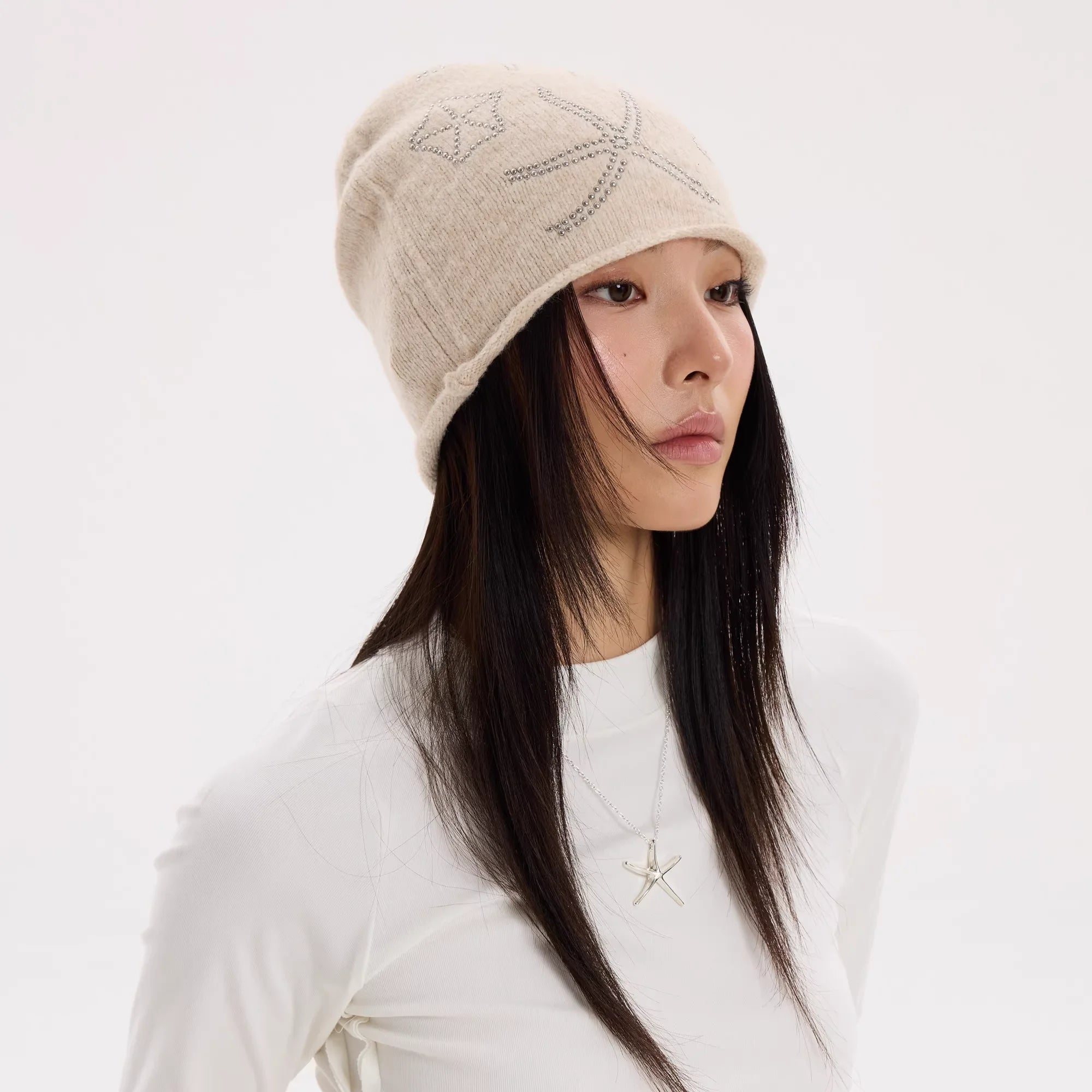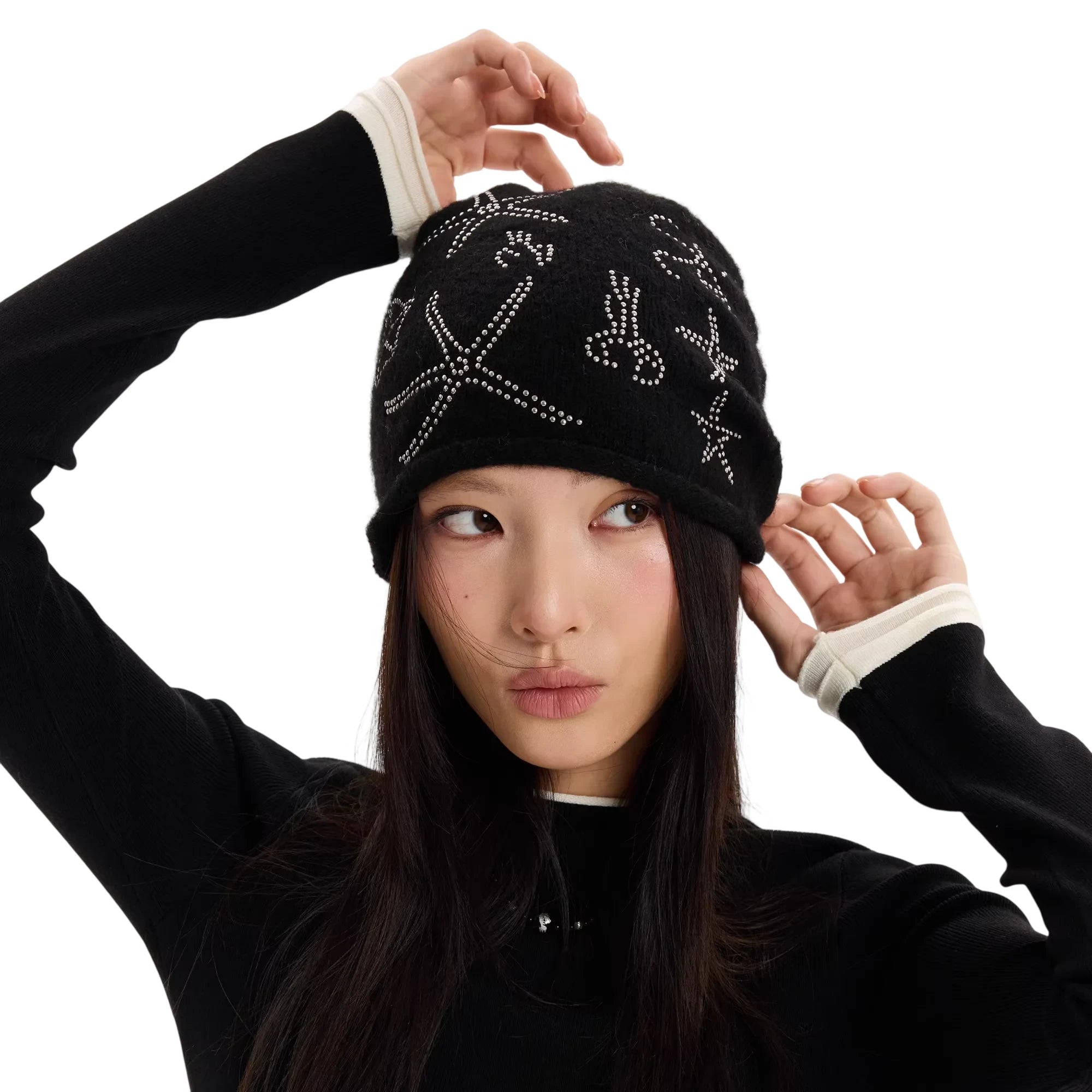 THELIGHT OFFICIAL Vintage Wool Beanie with Rhinestone Graphics and Rolled Brim