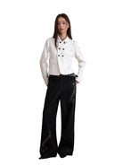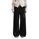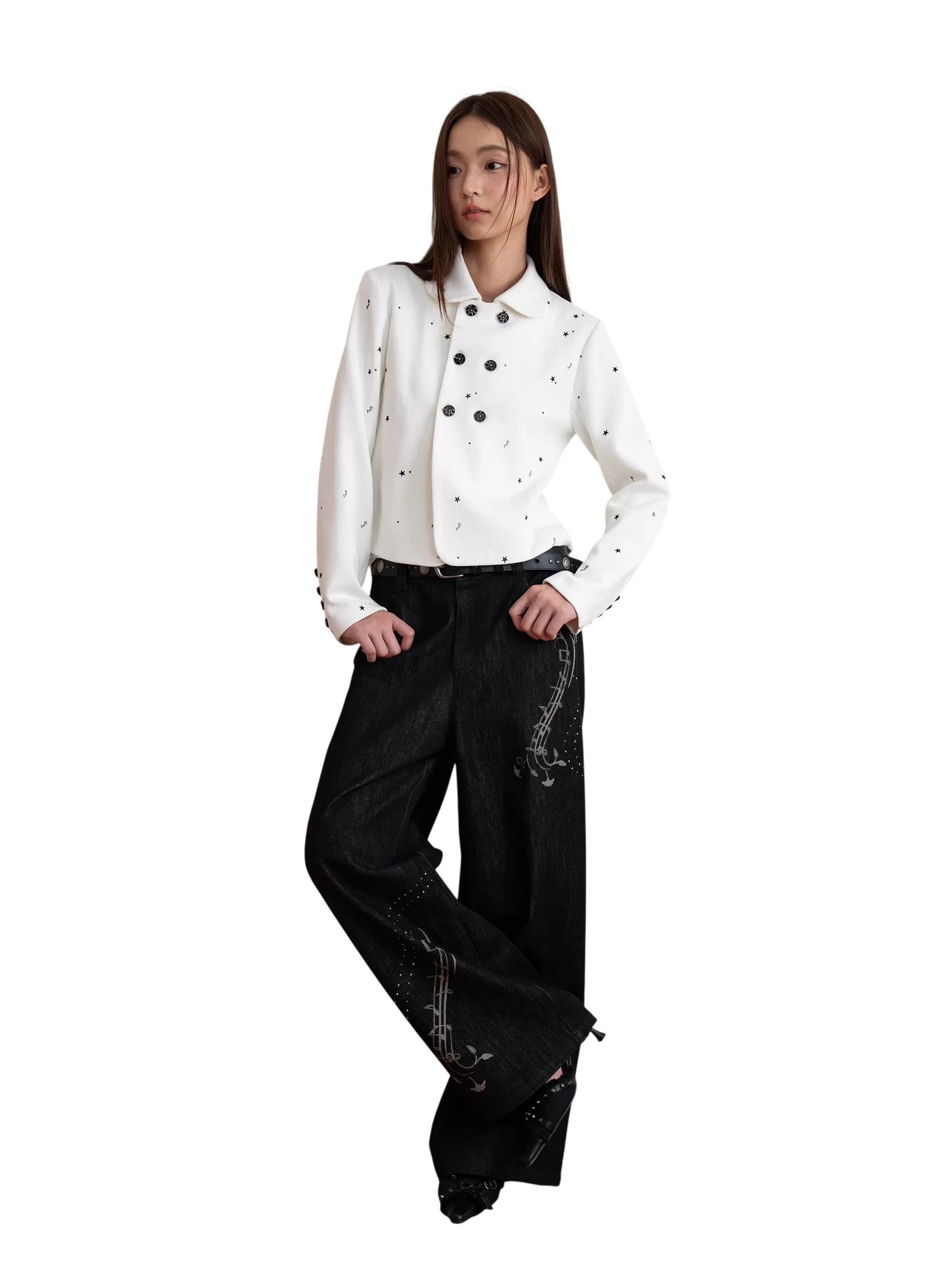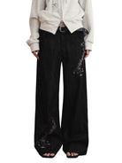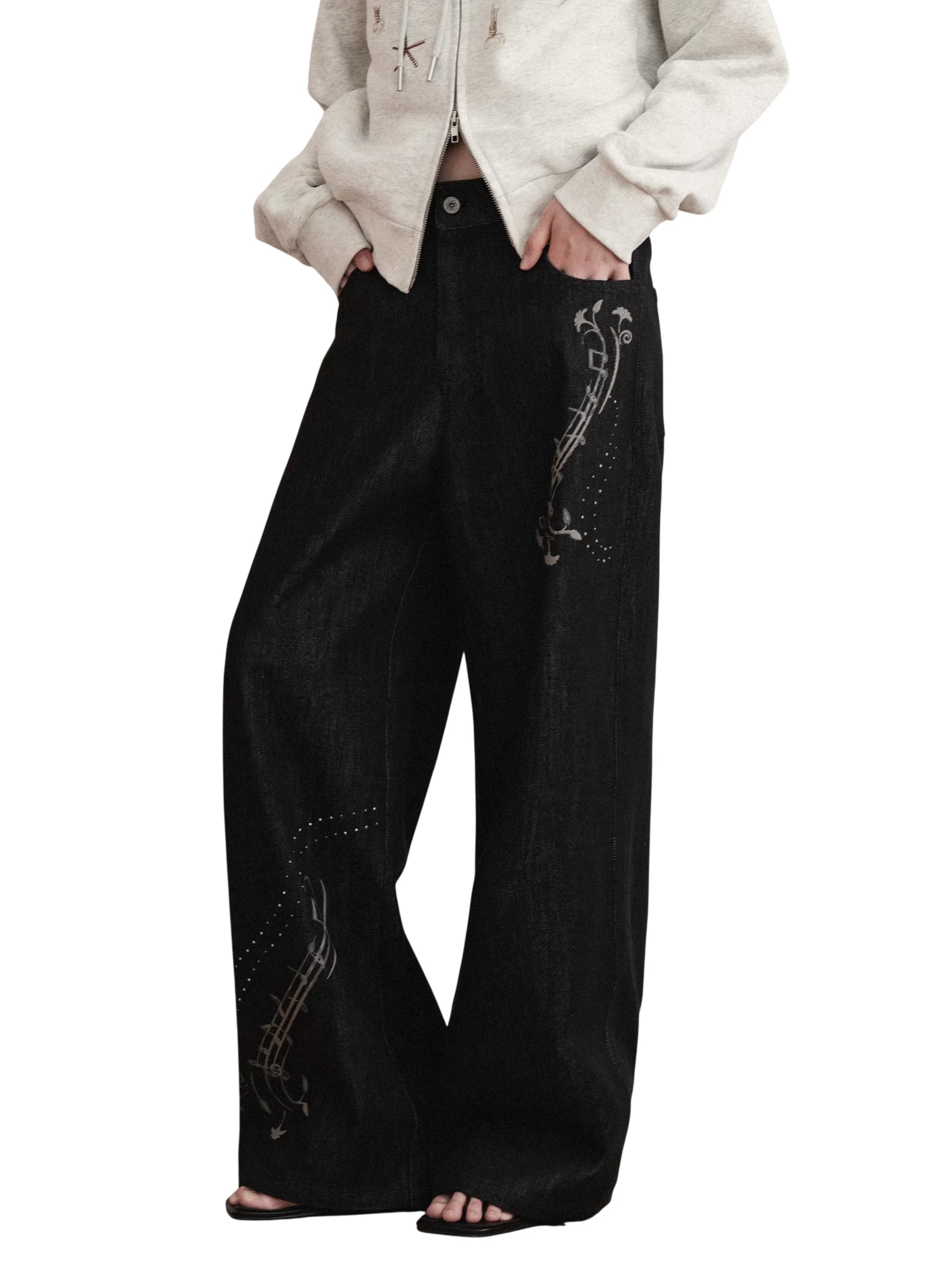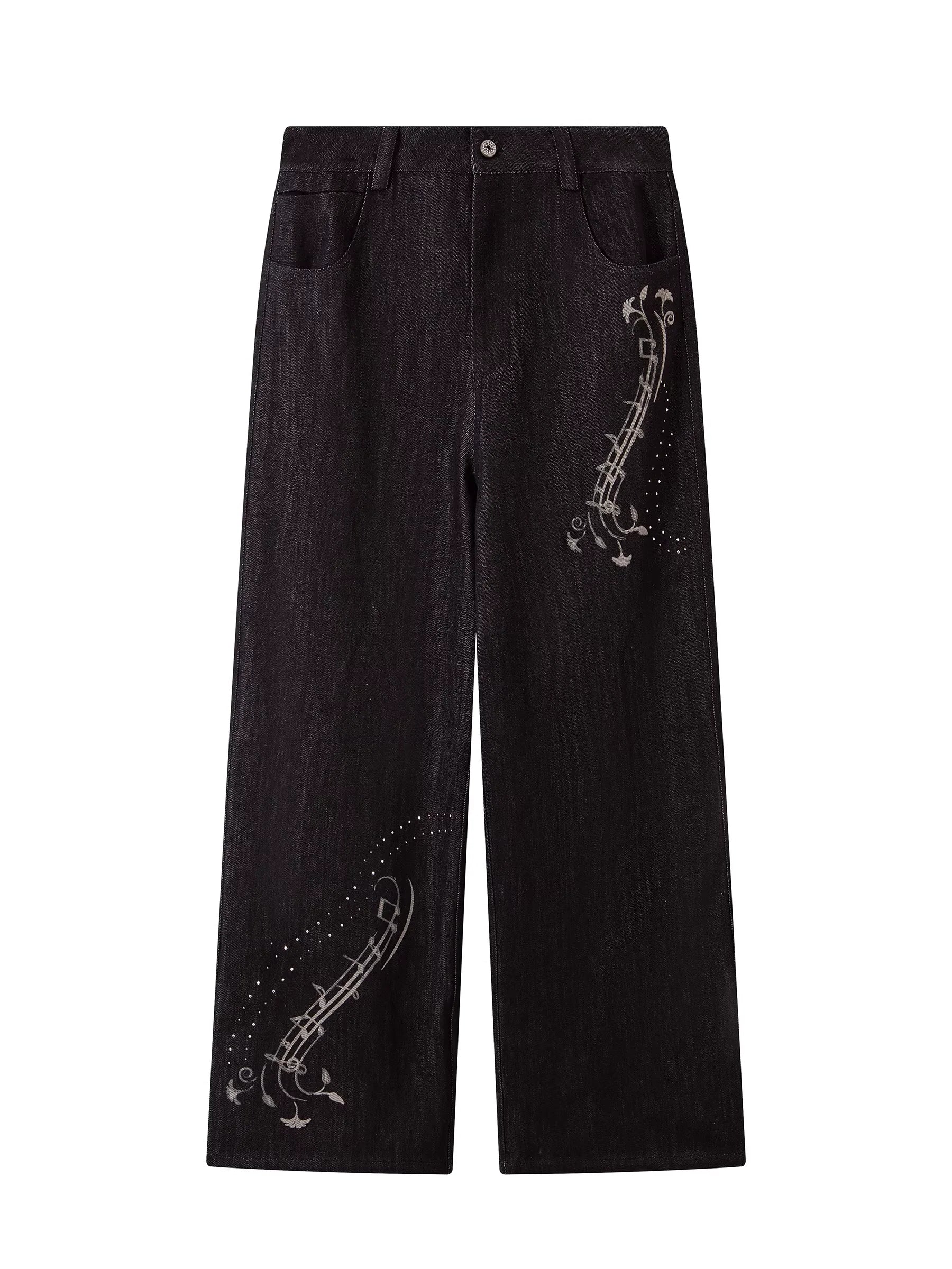 Elevate your seasonal wardrobe with these women's black wide-leg jeans, designed for both comfort and creativity. Featuring a high-waisted fit and a relaxed, straight-leg silhouette, these jeans are adorned with striking white music note prints on the right thigh and lower left leg. Perfect for autumn and winter styling, they bring a playful yet artistic flair to your look.