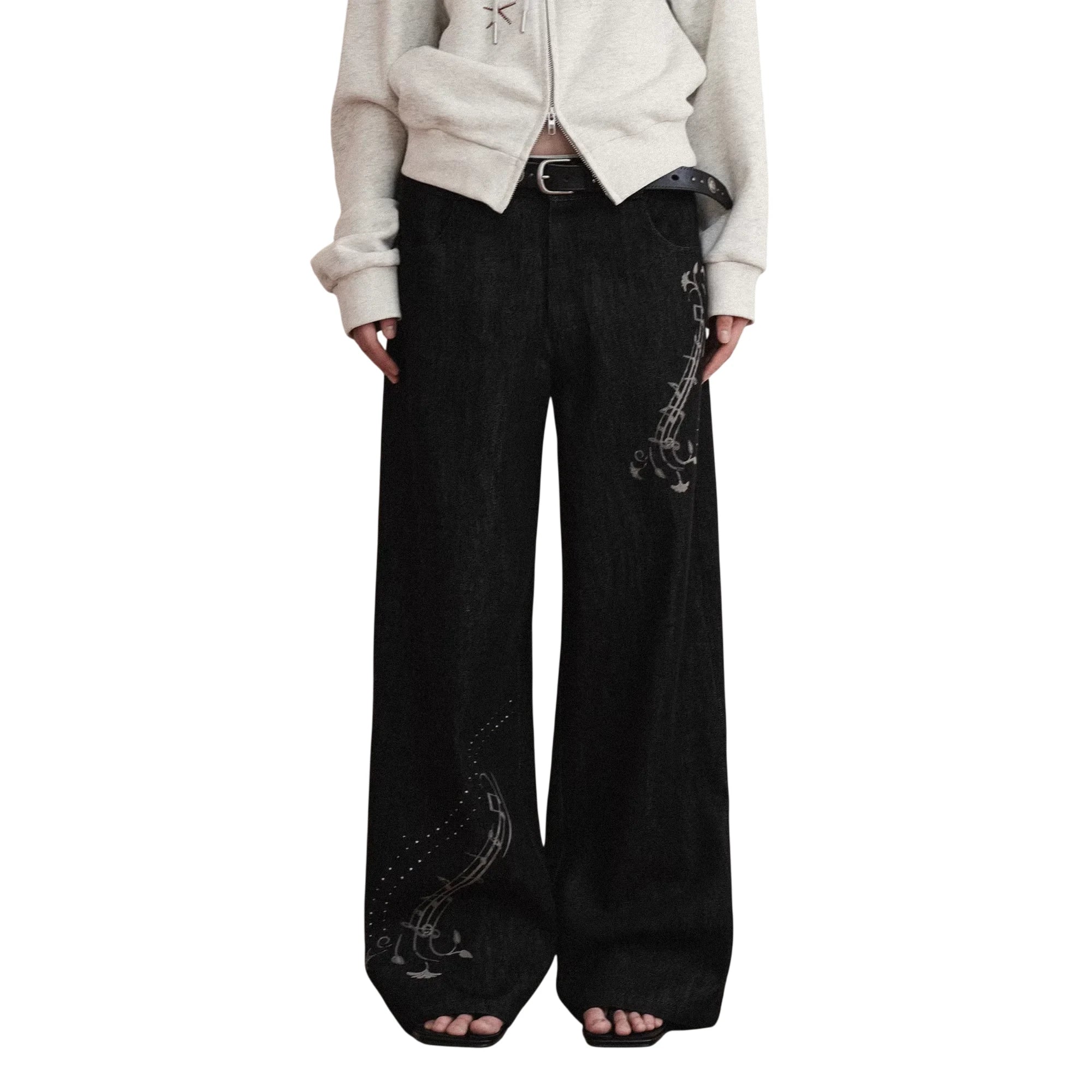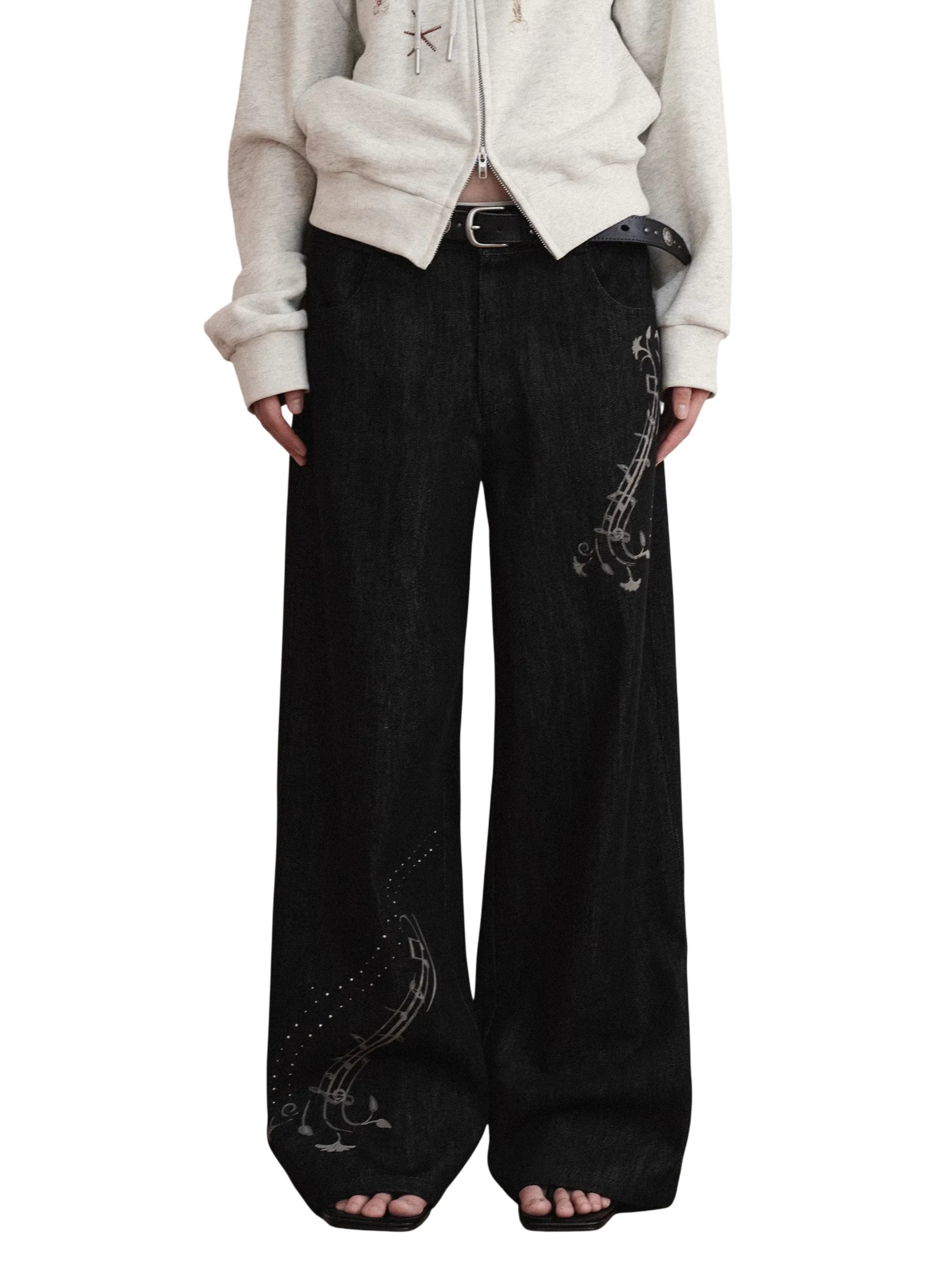 THELIGHT OFFICIAL Women's Black Wide-Leg Jeans with Music Note Print