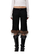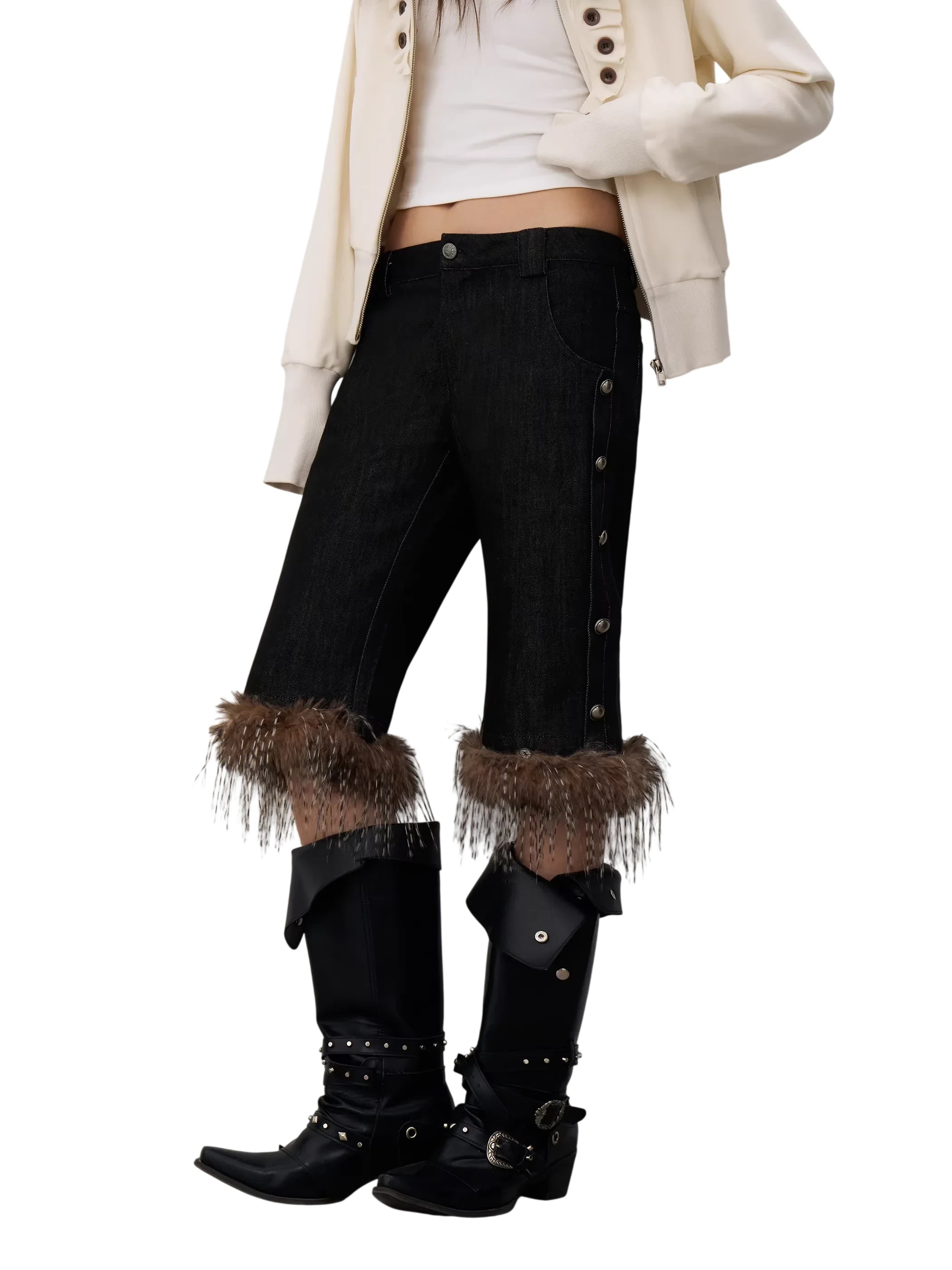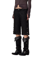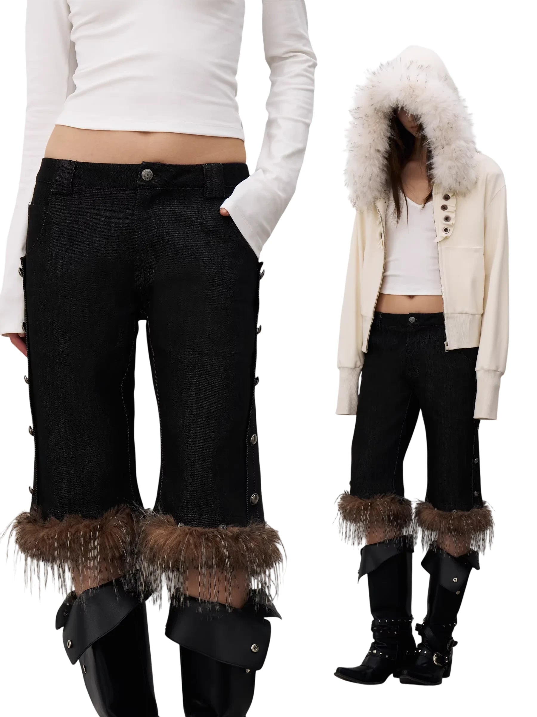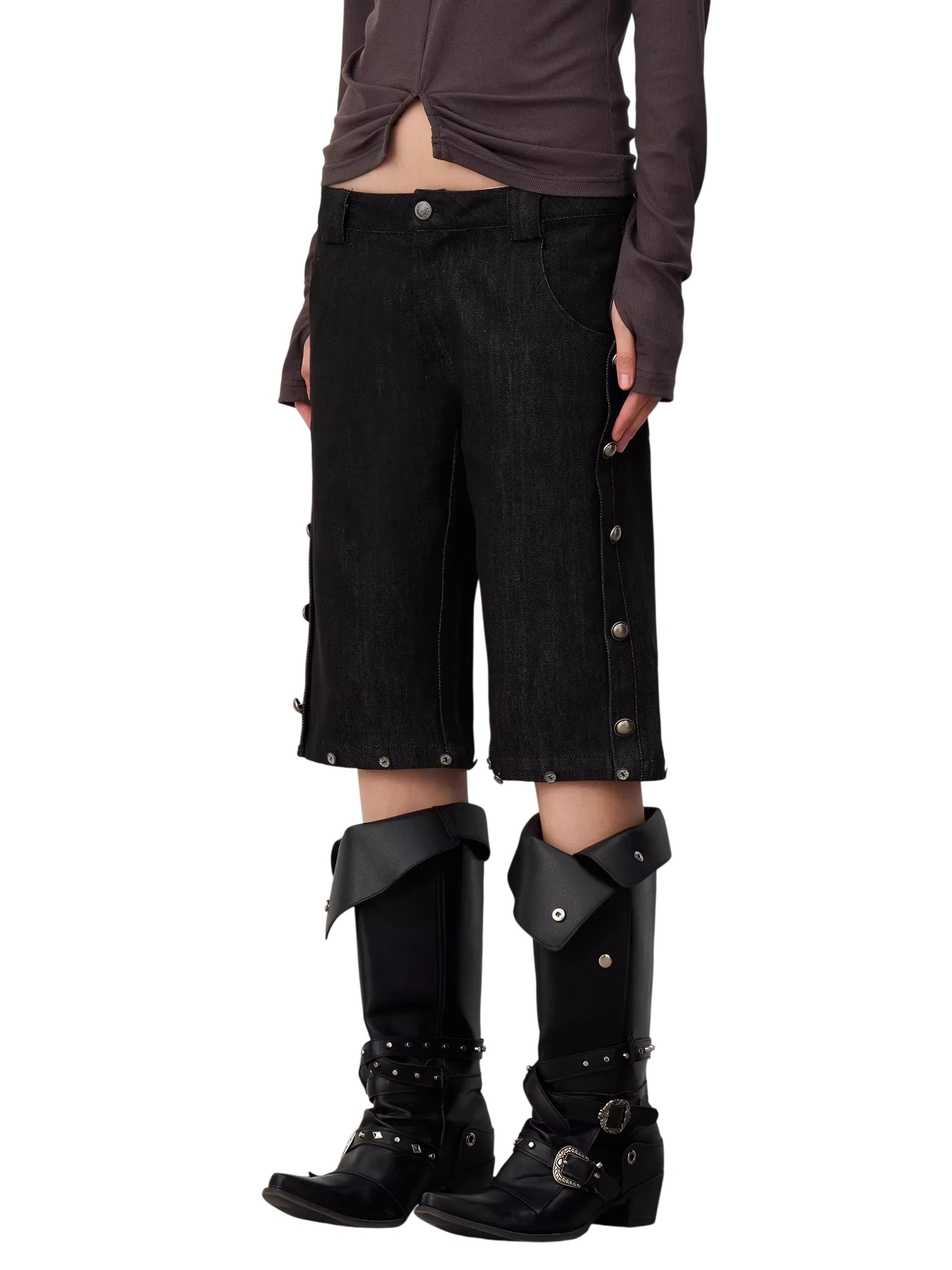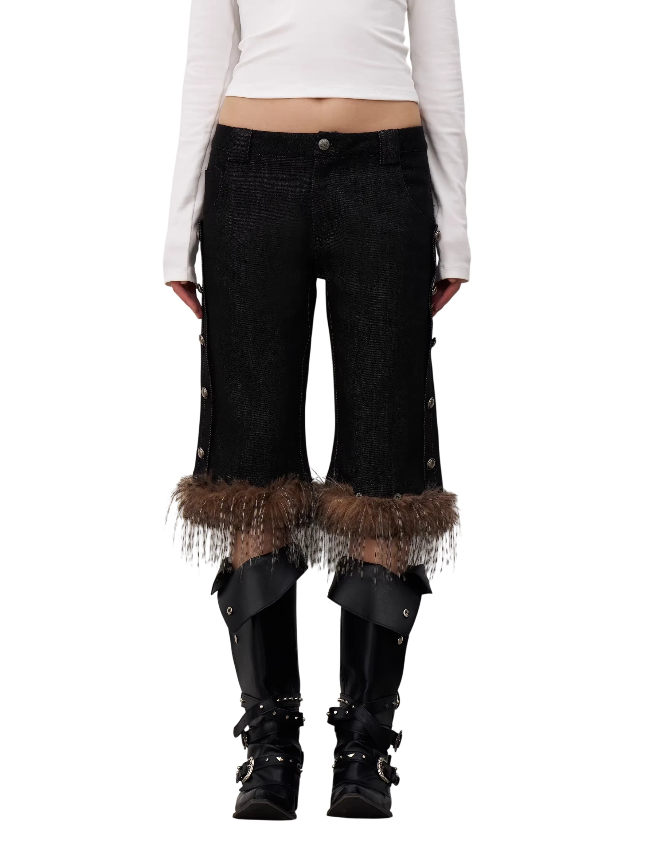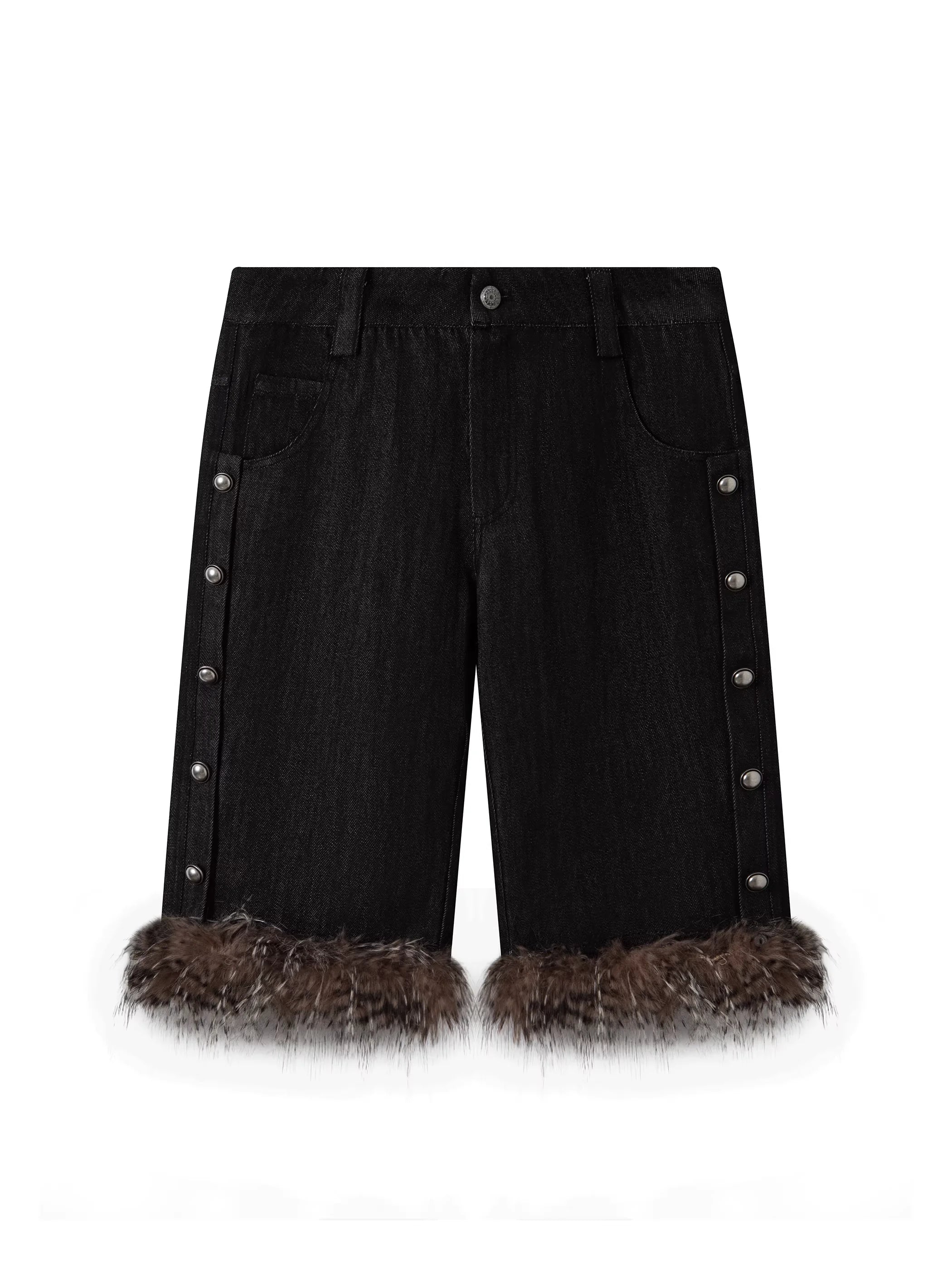 Make a bold fashion statement with these avant-garde women's Bermuda shorts, crafted from heavyweight raw denim. Designed for autumn and winter, these mid-rise shorts feature a unique two-way wear design with detachable plush trim along the hem, giving the garment a dramatic and edgy twist. Decorative button closures run down the outer side seams, adding visual interest to the silhouette. Ideal for layering, style them with boots and tops for a contemporary streetwear look.