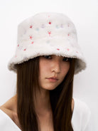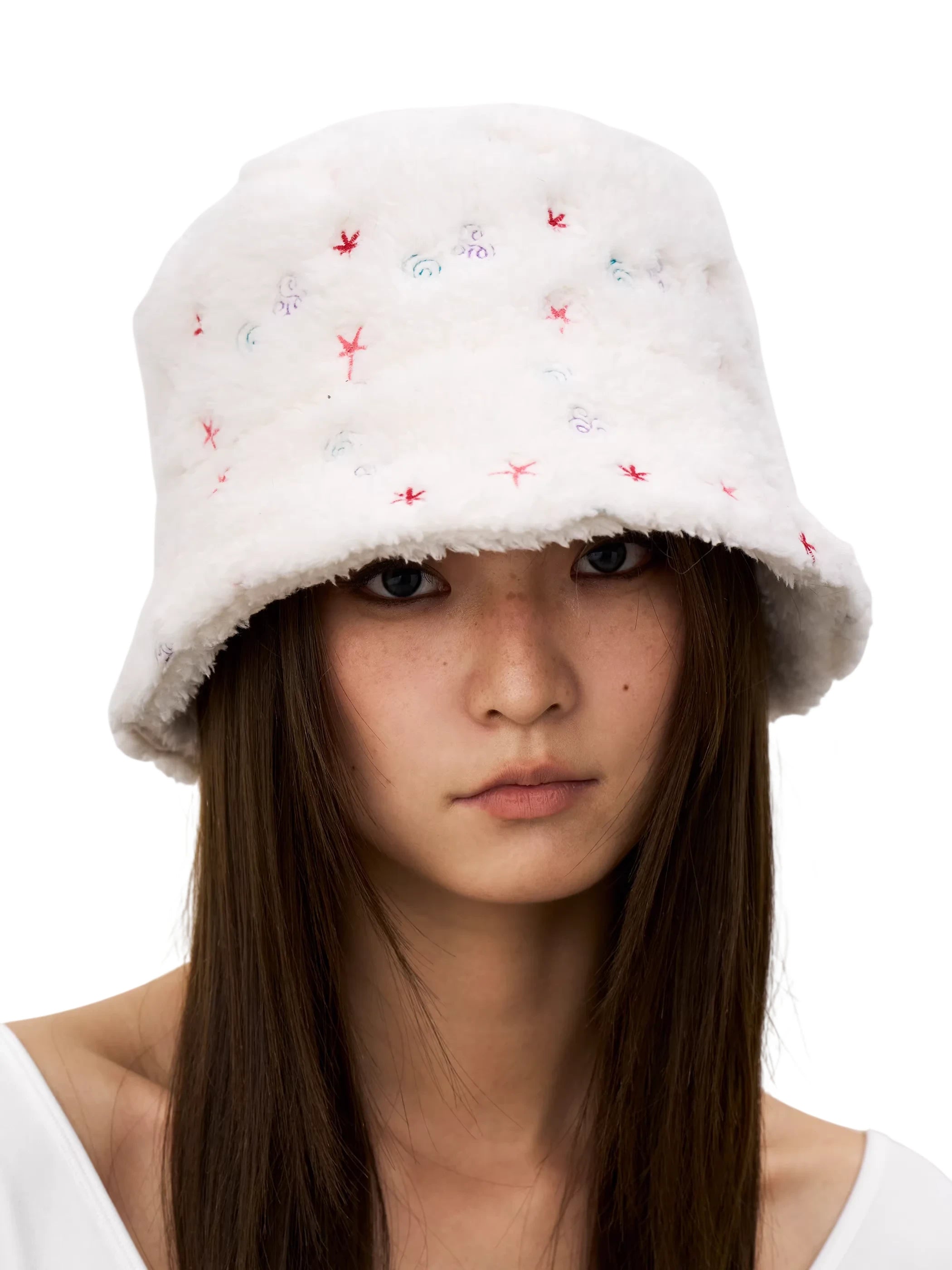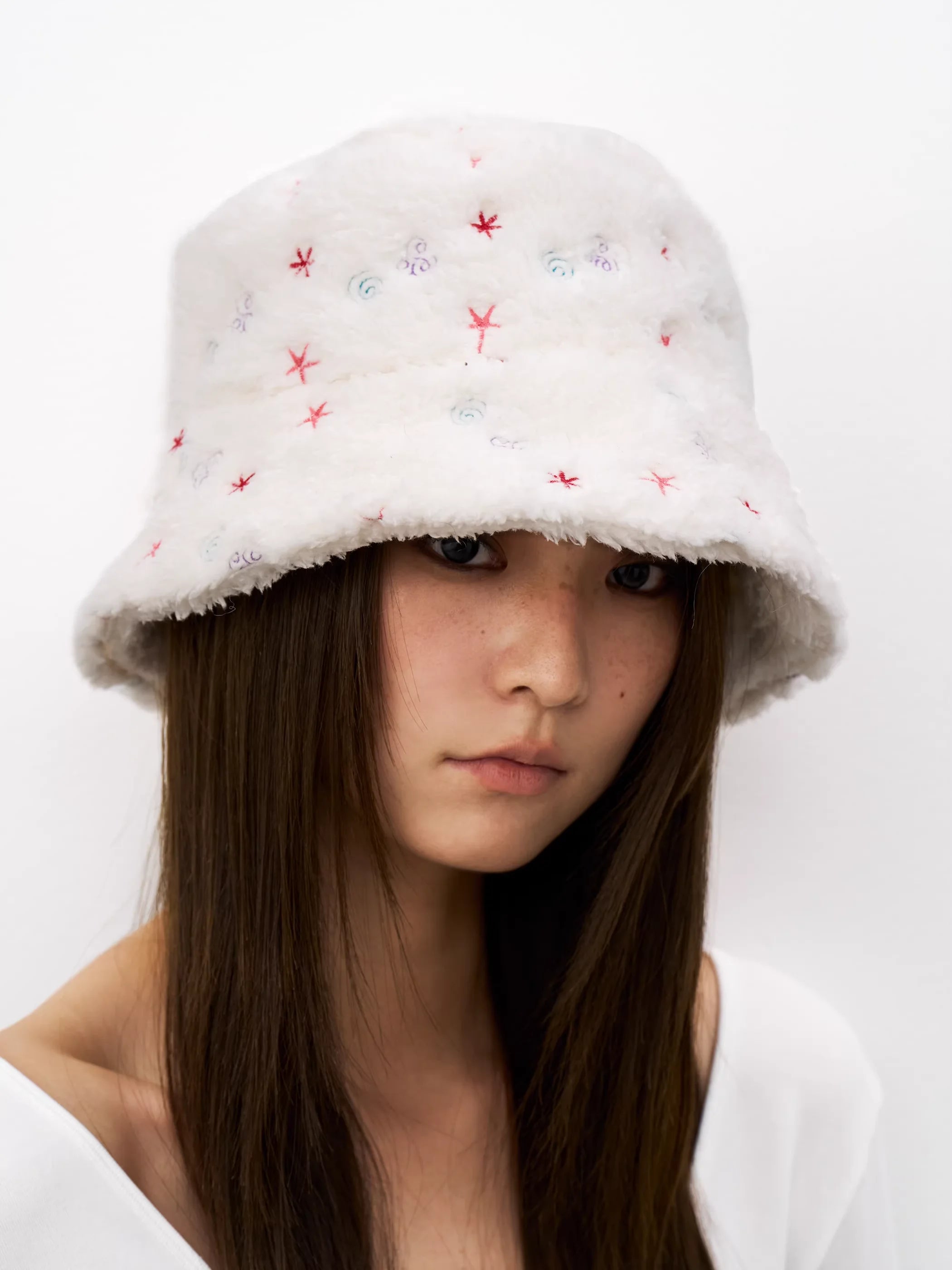 Stay warm and stylish with this cozy women's bucket hat, featuring a plush, fuzzy texture perfect for winter wear. The soft white design is accented with delicate star embroidery in red, pale blue, and purple, adding a whimsical touch to your cold-weather look. Crafted for both comfort and fashion, this hat also offers a face-slimming effect, making it a flattering accessory for chilly days.