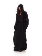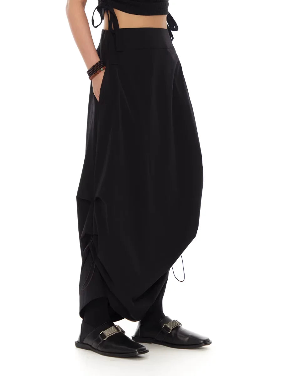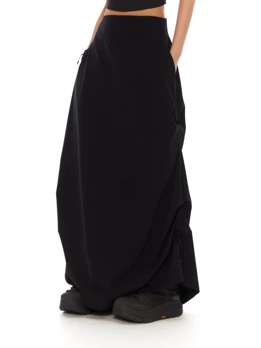 This women's high-waisted maxi skirt features a dramatic A-line silhouette with a unique draped and asymmetrically gathered design at one side. Crafted from structured fabric, it offers a sculptural volume that adds dimension and movement to any outfit. The skirt is designed with a flattering high waist, ankle-length hem, and side seam pockets for added practicality. A drawstring provides adjustable styling options, making it a versatile piece for multiple looks. Ideal for creating a modern, fashion-forward ensemble.