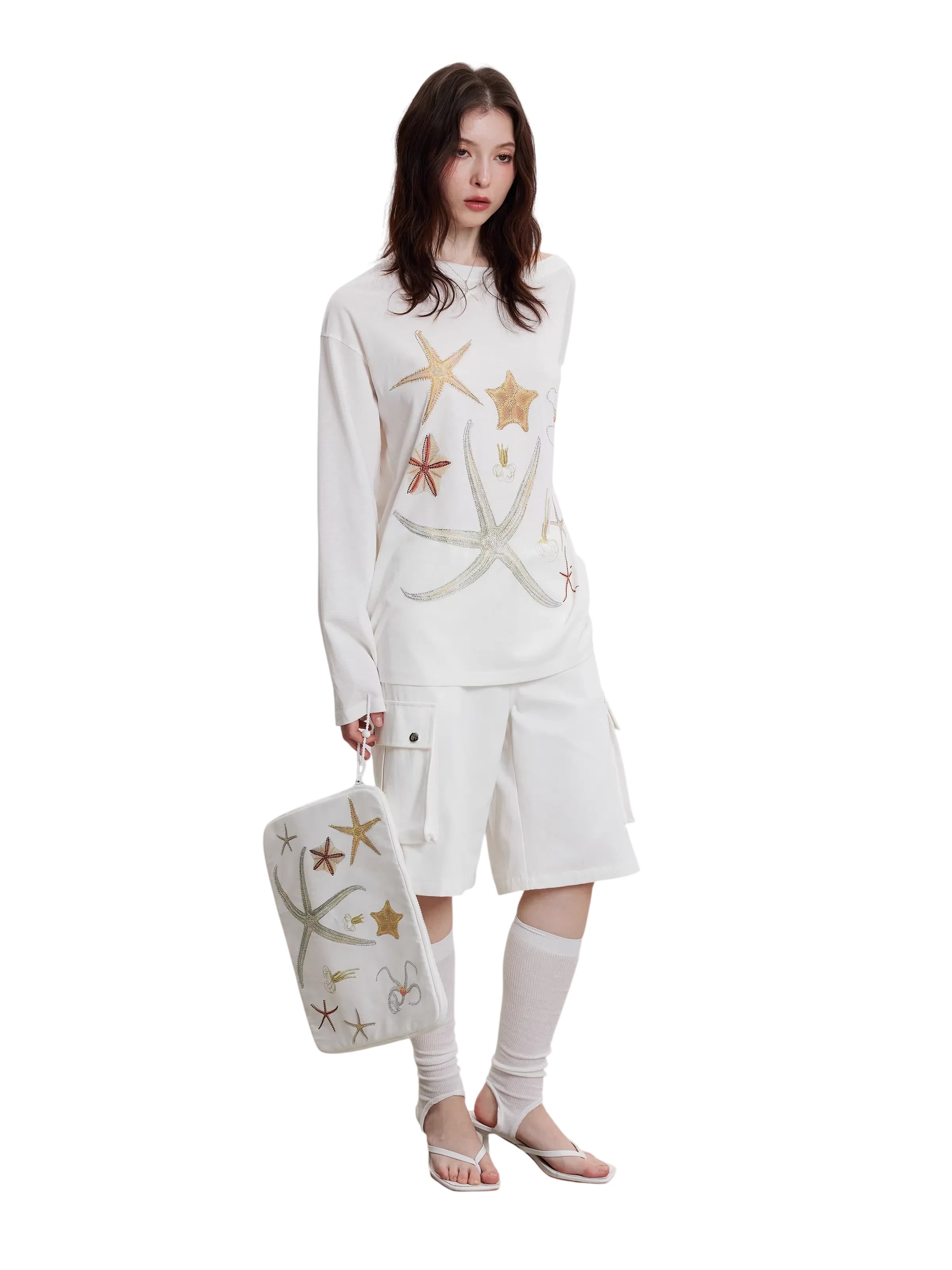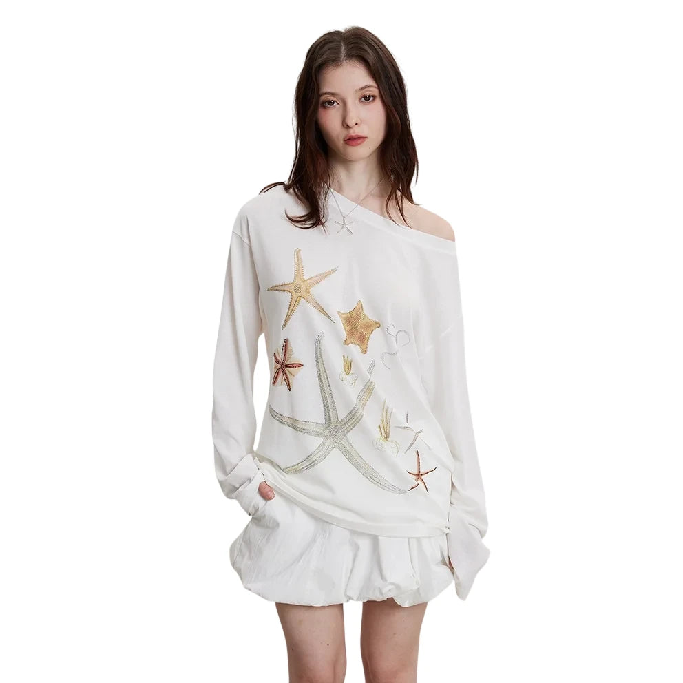Embrace a breezy summer look with this women's off-shoulder long sleeve top. Featuring a wide neckline that effortlessly drapes over the shoulder, this lightweight top is designed with colorful embroidered starfish and sea-inspired patterns for a playful coastal vibe. The relaxed, oversized fit and cool-touch lyocell fabric make it perfect for layering in air-conditioned settings or enjoying warm-weather outings.