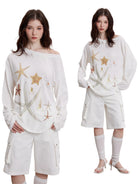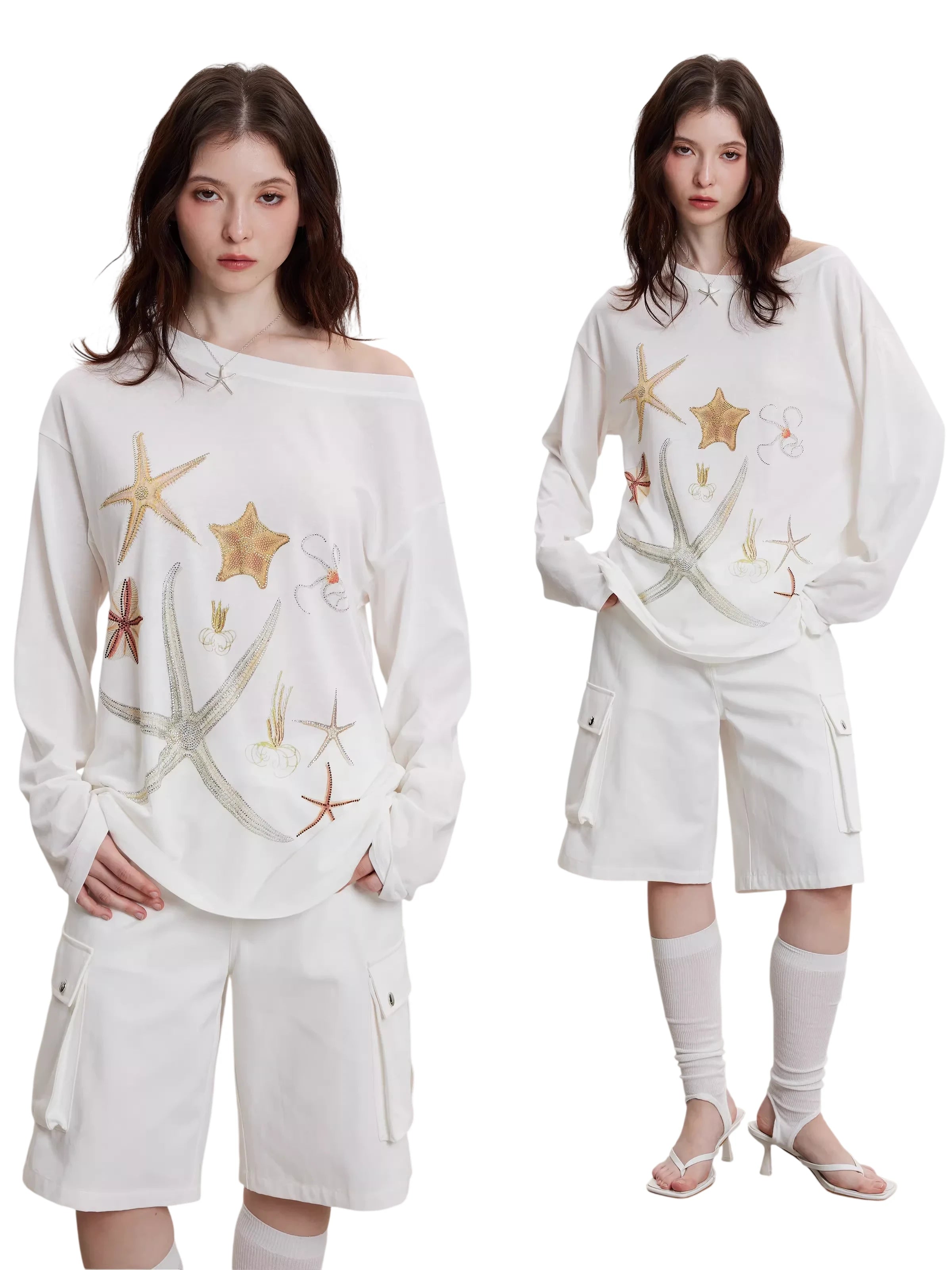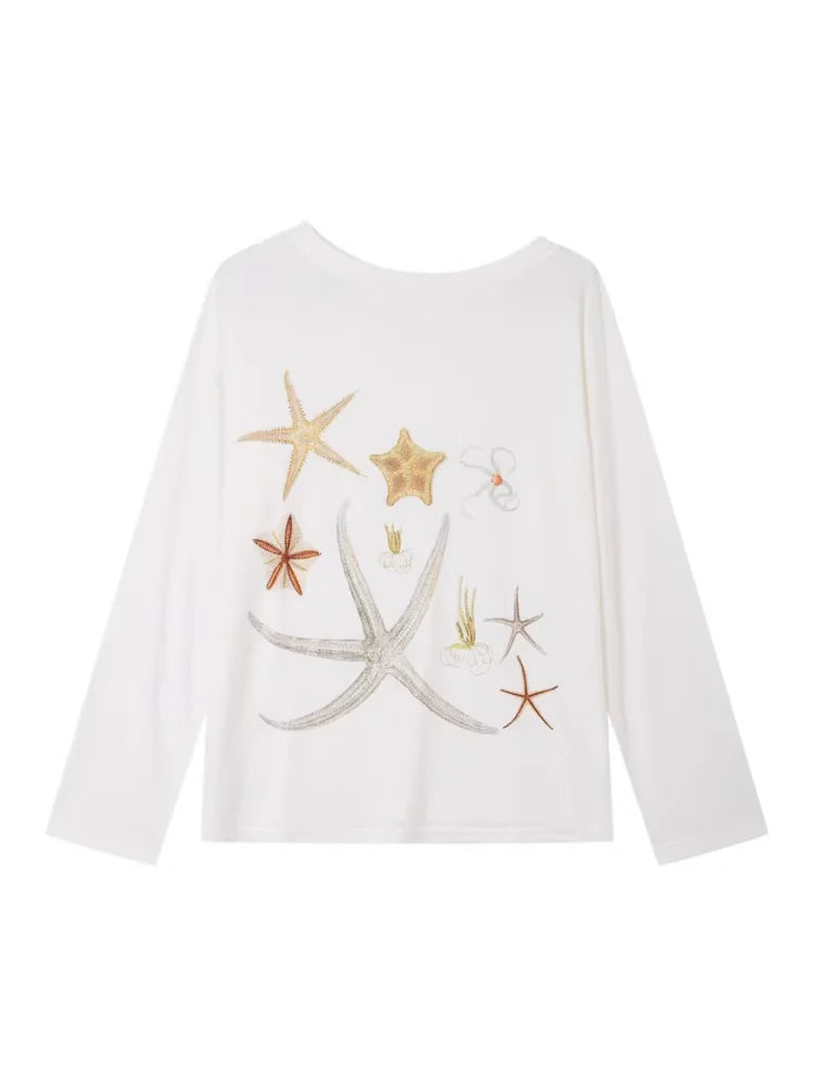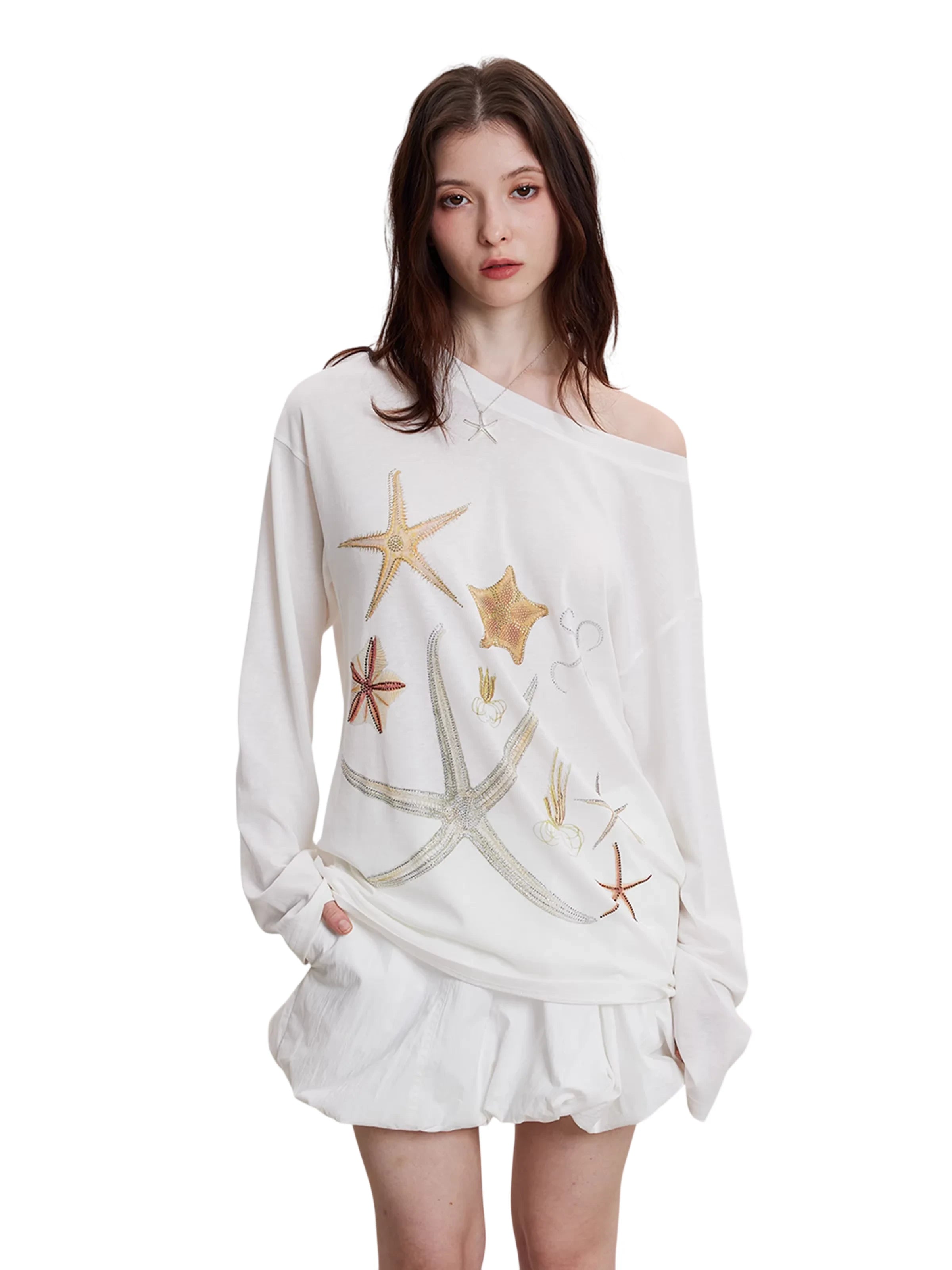 THELIGHT OFFICIAL Women's Off-Shoulder Starfish Print Lightweight Long Sleeve Top