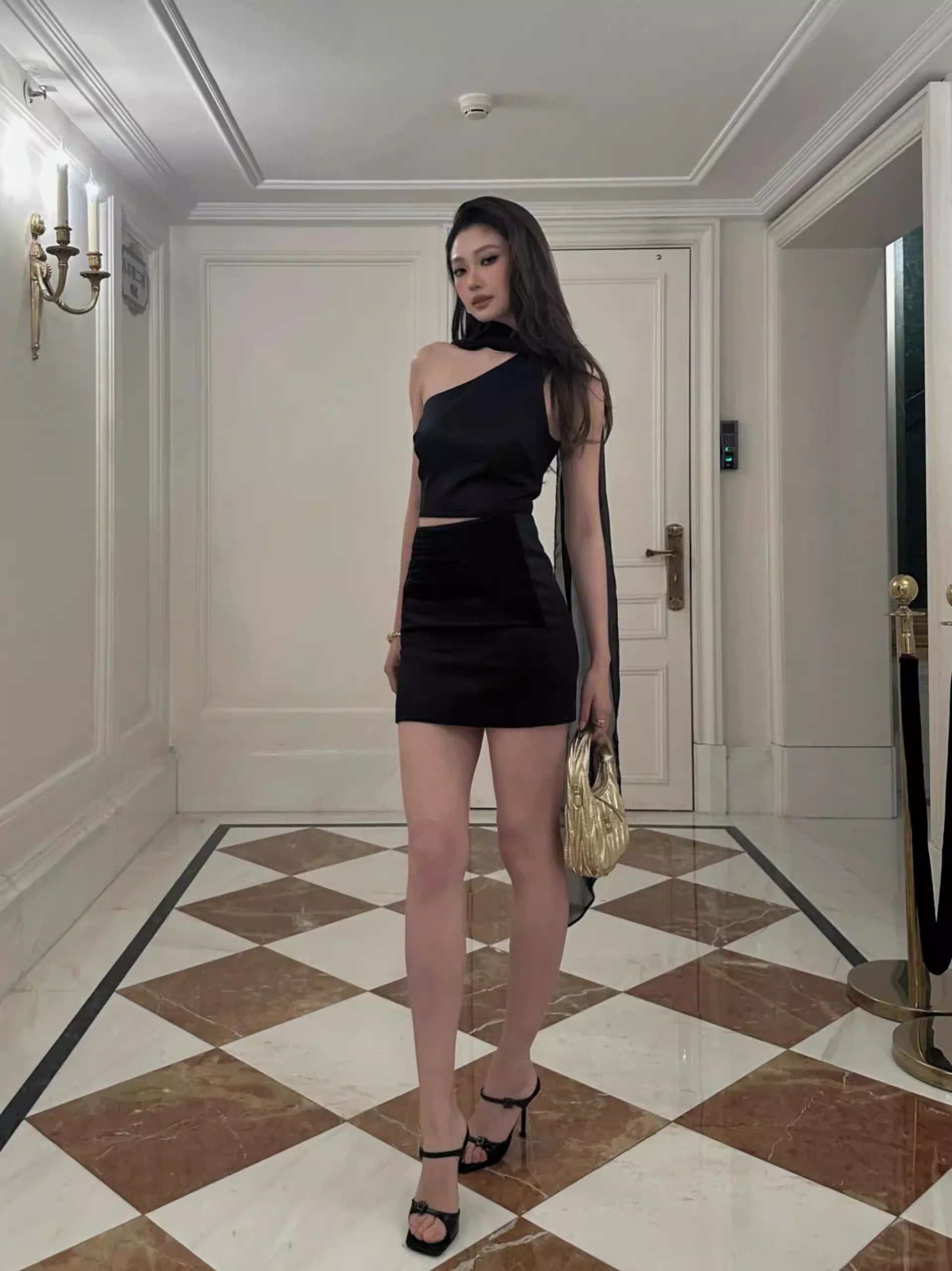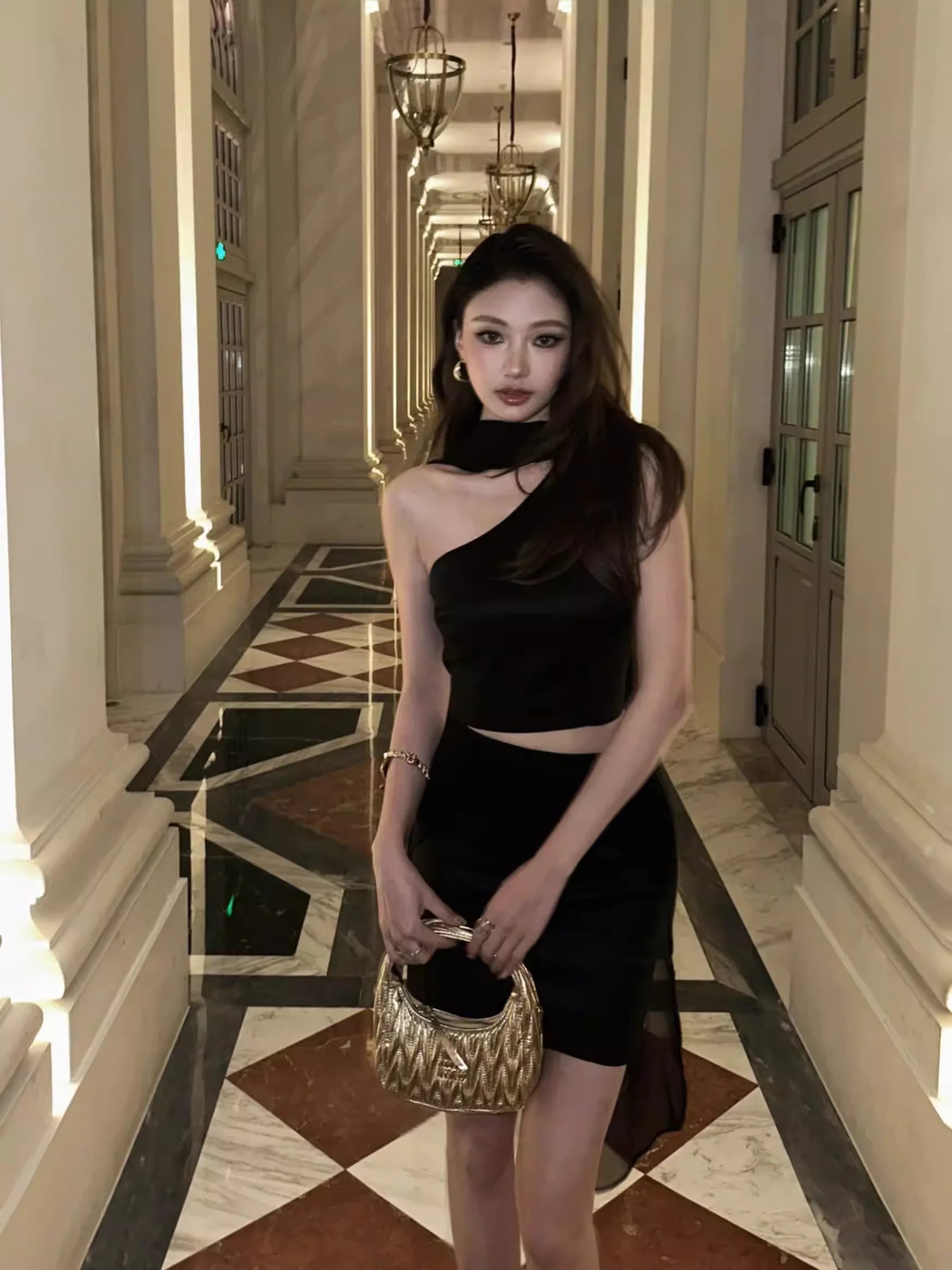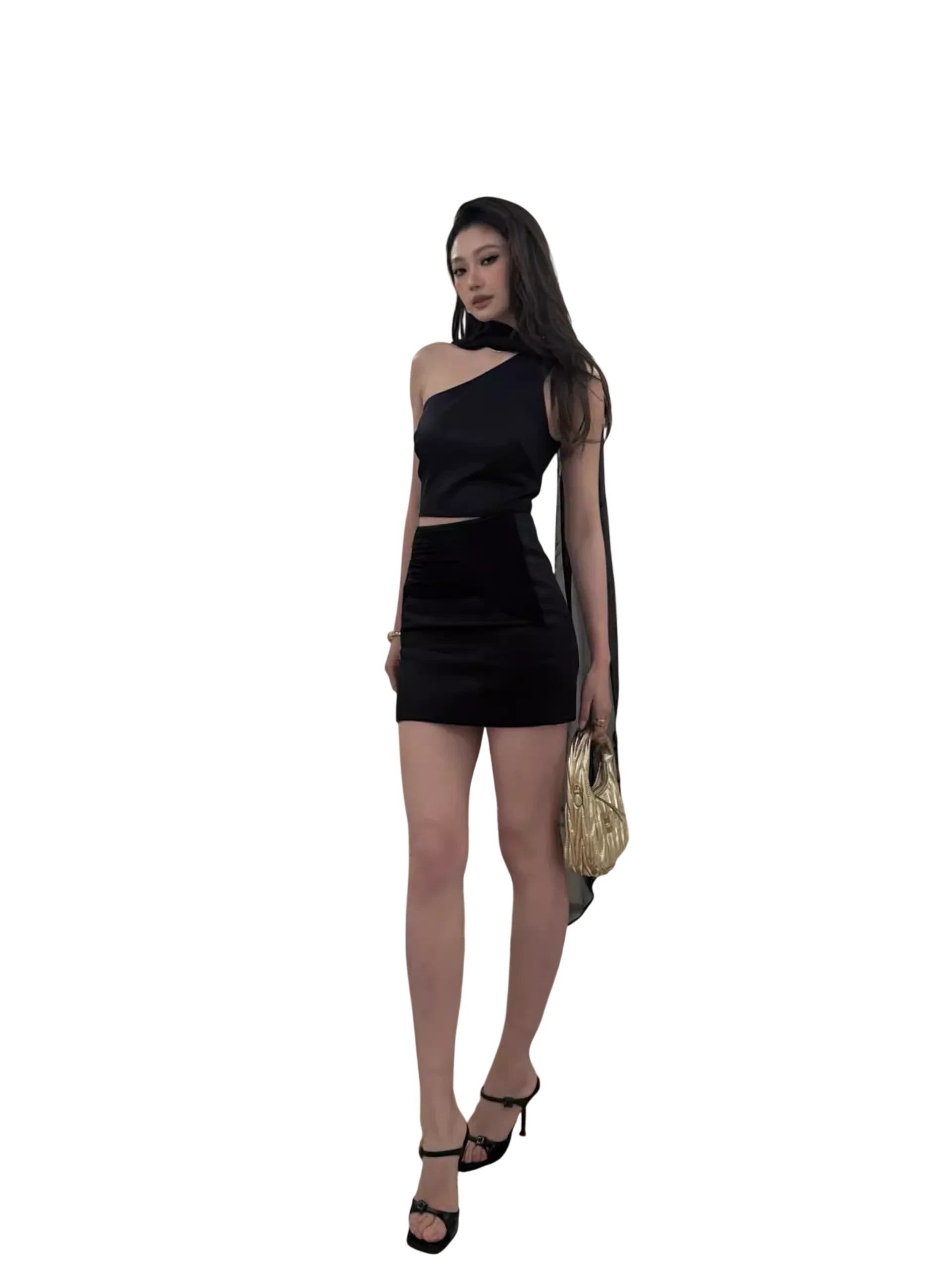 This elegant black mini dress is designed for women and features a contemporary one-shoulder silhouette. It showcases an asymmetrical neckline complemented by a long flowing ribbon draped from the neck, adding a graceful and stylish element. A sheer panel at the waist creates a subtle cut-out effect, enhancing the dress’s modern allure. Crafted in a rich satin or velvet-like fabric, the dress offers a luxurious sheen and texture. Perfect for sophisticated evening occasions, this look is completed with a contrast gold handbag for an added touch of glamour.