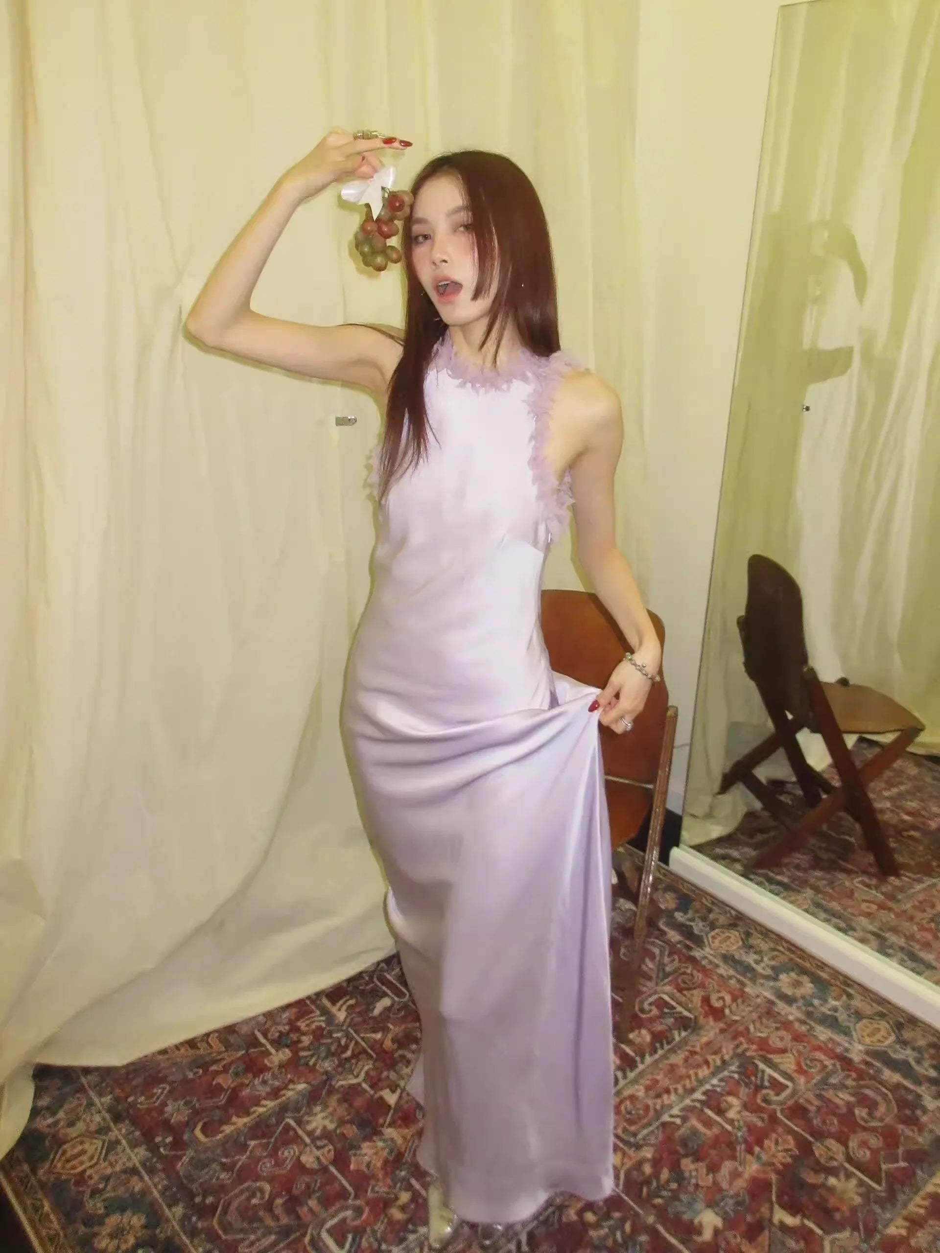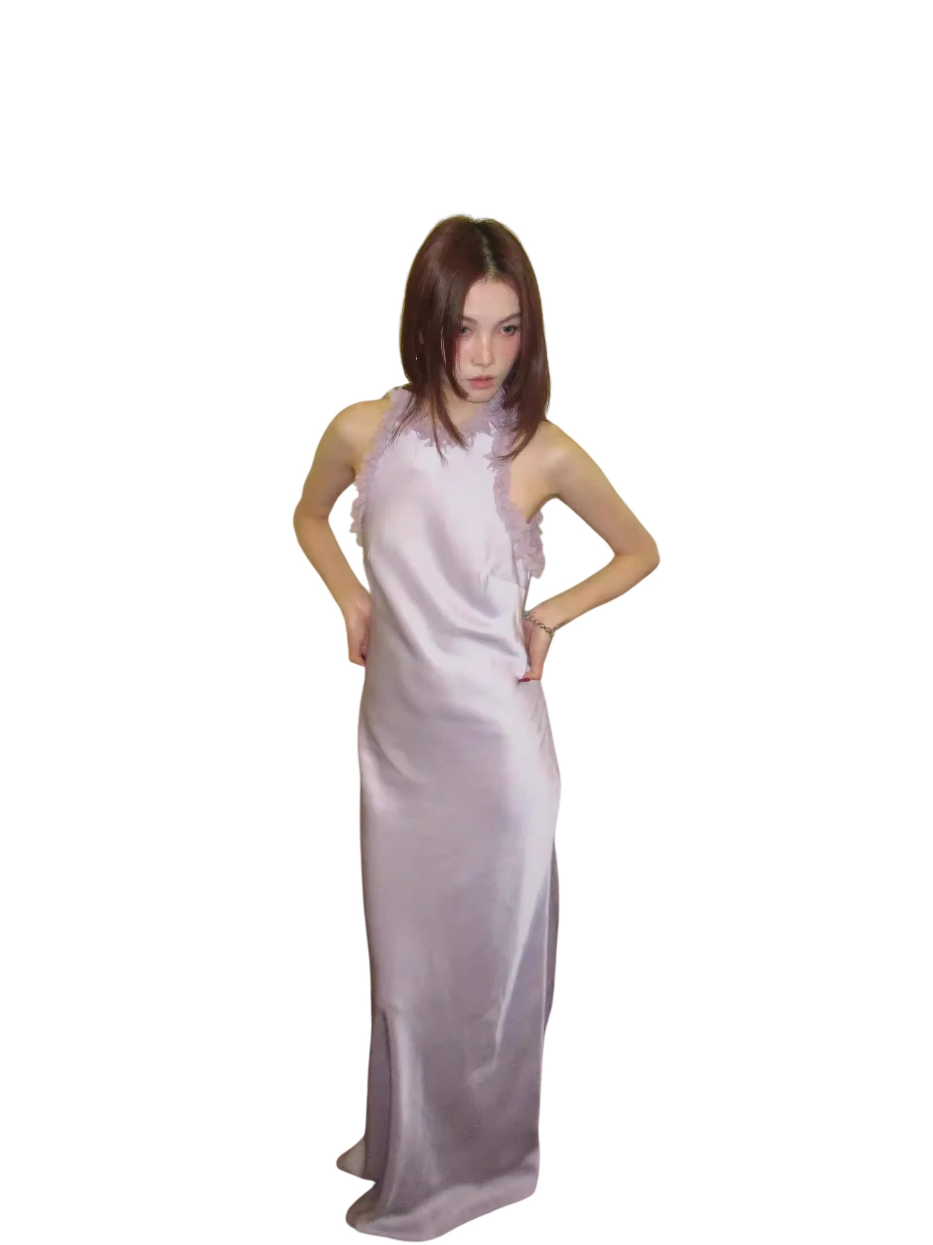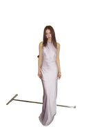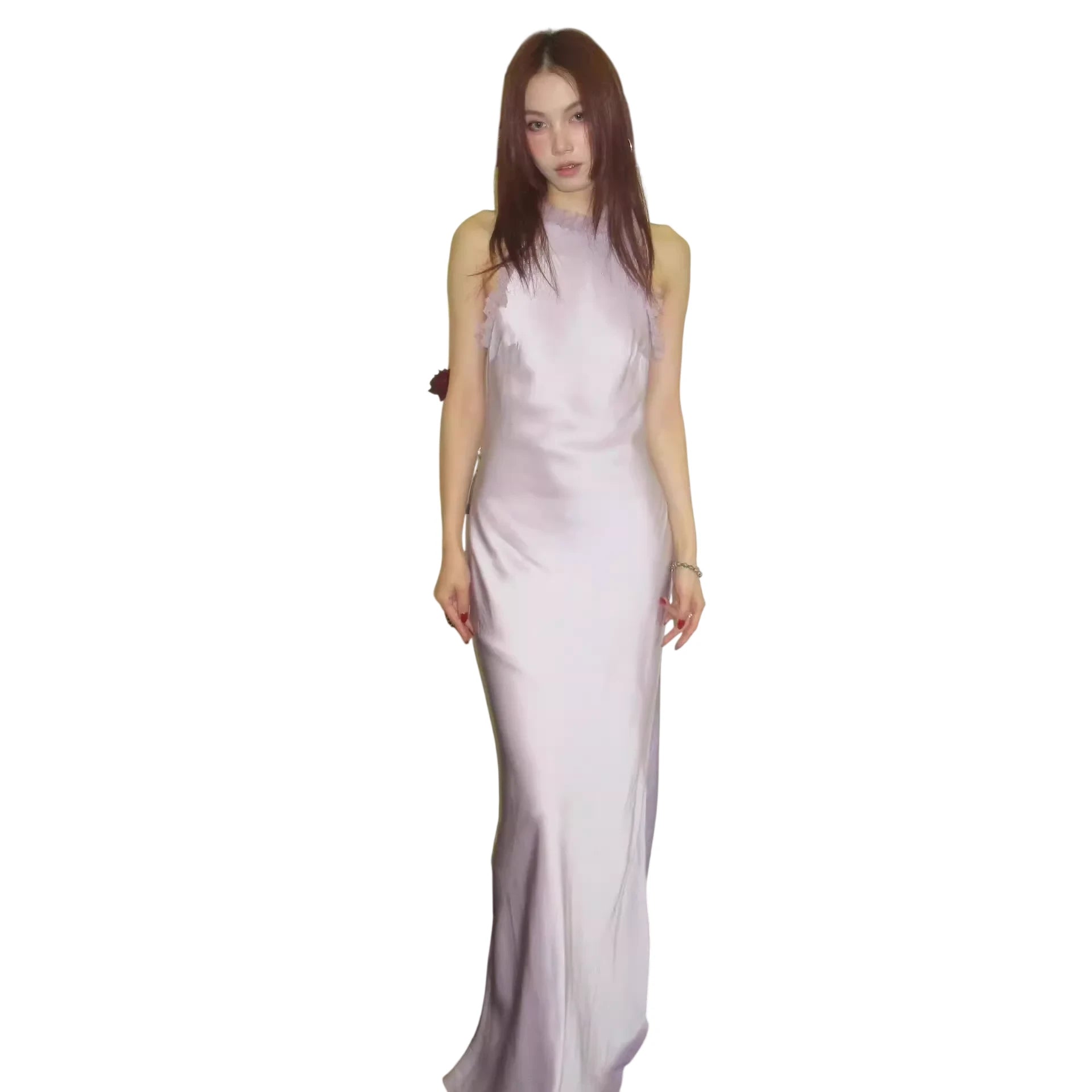 Elevate your special occasion look with this elegant lavender evening dress. Designed in a luxurious satin fabric, this floor-length gown features a sleeveless halter neckline that flatters the shoulders and neckline. The silhouette is subtly fitted through the bodice and hips before gently flaring at the hem, offering graceful movement and a timeless aesthetic. Perfect for exhibitions, birthday parties, and beachside events, this women's dress combines simplicity with refined sophistication.