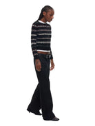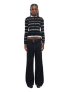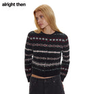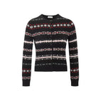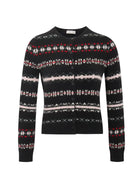 This women's knit cardigan features a cozy Icelandic-inspired design, perfect for colder seasons. Crafted in a dark base color, it showcases festive fair isle motifs in red, white, green, and gray across the entire garment. The cardigan includes a round neckline, long sleeves, and a button-up front, with a ribbed hem that sits comfortably at the waist. Ideal for casual wear, it pairs effortlessly with jeans for a relaxed winter look.