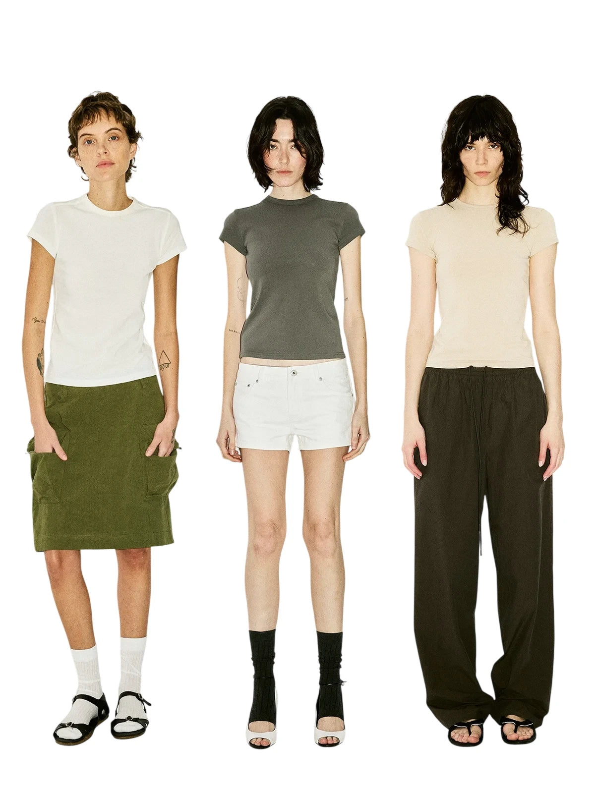 Available in a range of solid colors including white, olive green, black, beige, dark brown, and gray, it pairs effortlessly with jeans, shorts, skirts, or trousers for a clean, modern look. A timeless essential for any wardrobe.