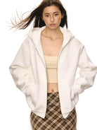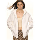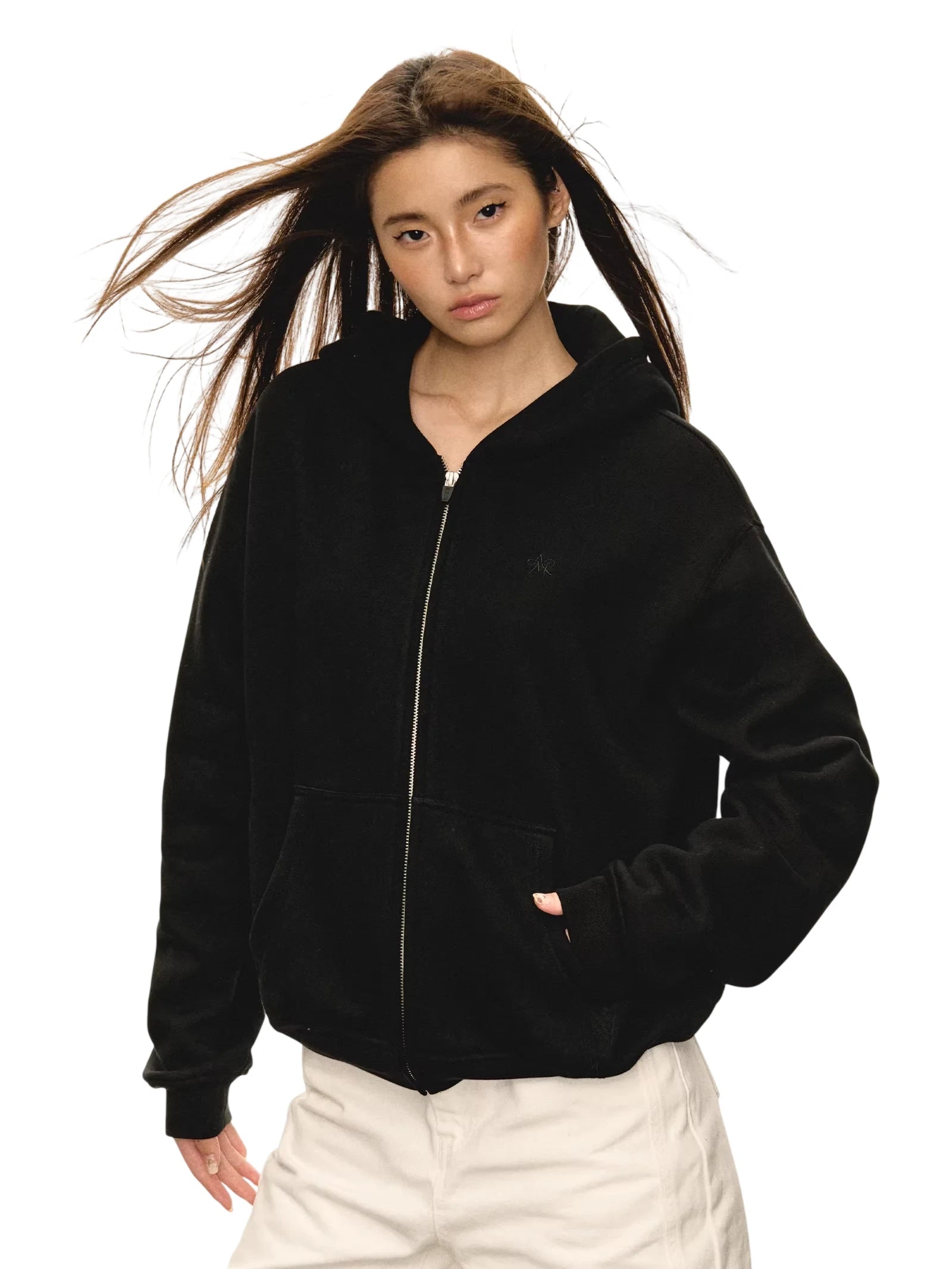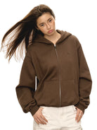 Stay cozy and stylish this fall with this women's relaxed fit zip-up hoodie. Designed with a lightweight and comfortable silhouette, it features a subtle embroidered chest logo, front pockets, and a hood for added warmth. Offered in four versatile color options—black, white, light gray, and brown—this hoodie is perfect for layering over your favorite crop tops or tees.