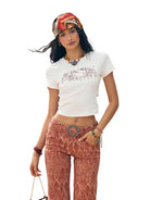 Elevate your summer wardrobe with this solid color crop top featuring a beautifully embroidered elephant graphic. Designed for women, this short-sleeve top includes stylish cutout and backless detailing, perfect for warm weather and festival-inspired looks. Pair it effortlessly with cargo shorts or printed bell-bottoms for a chic, boho aesthetic.