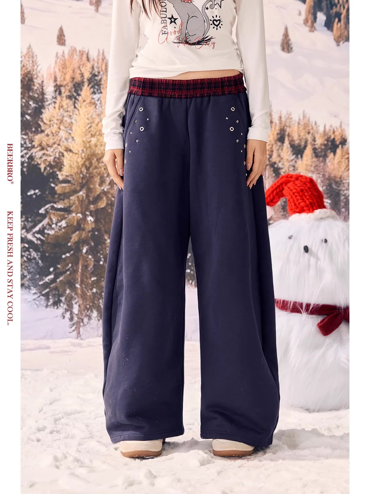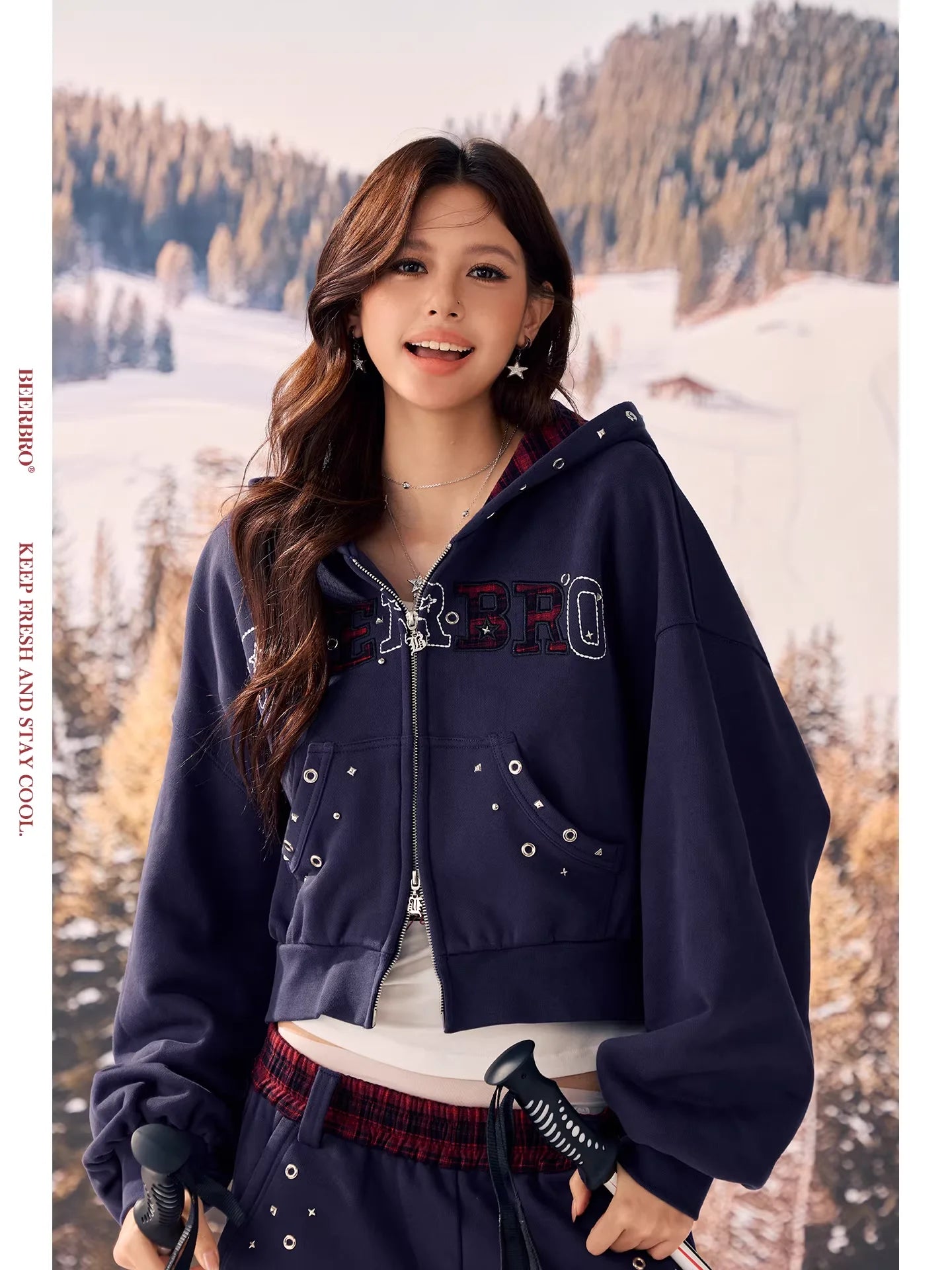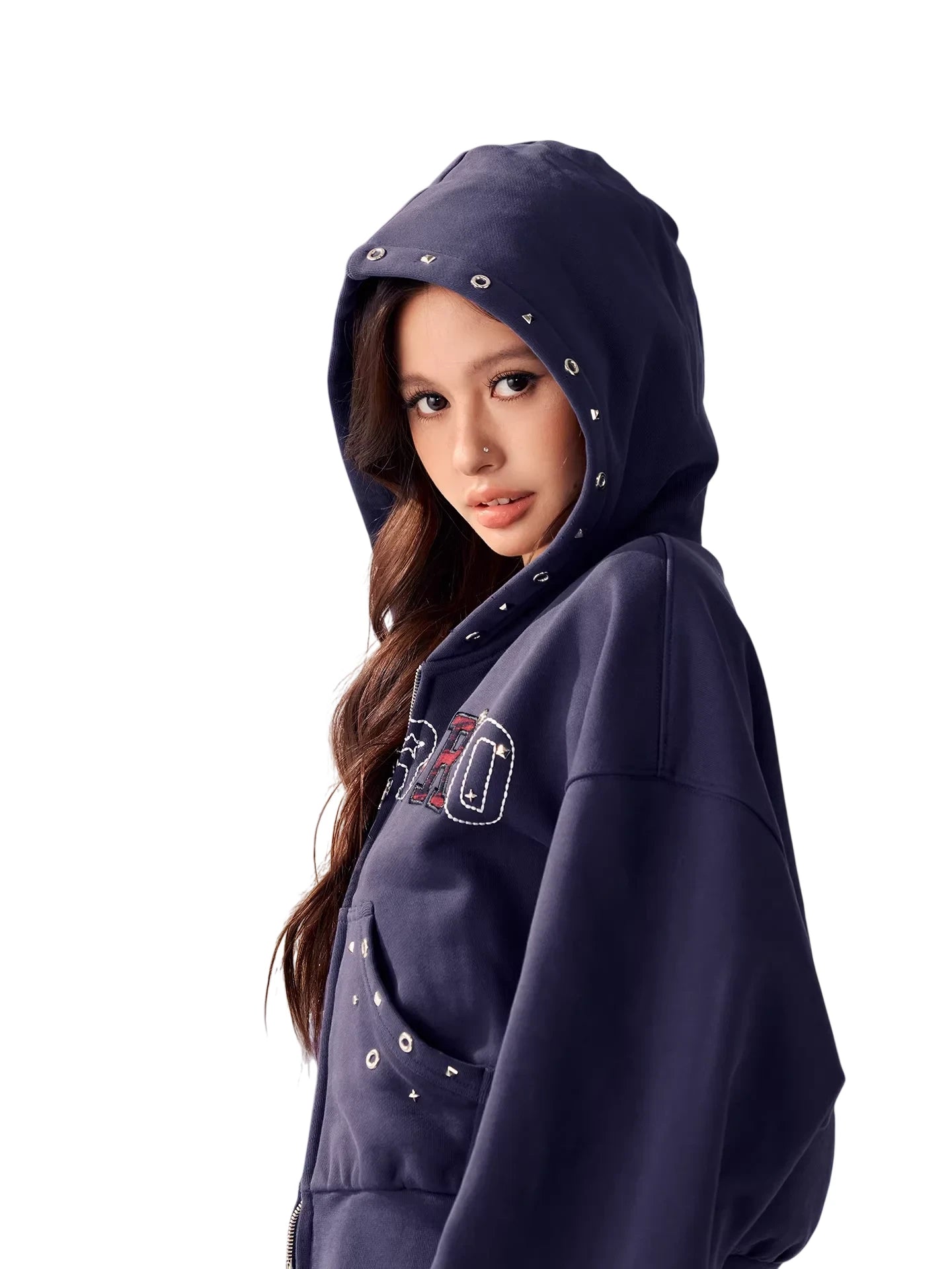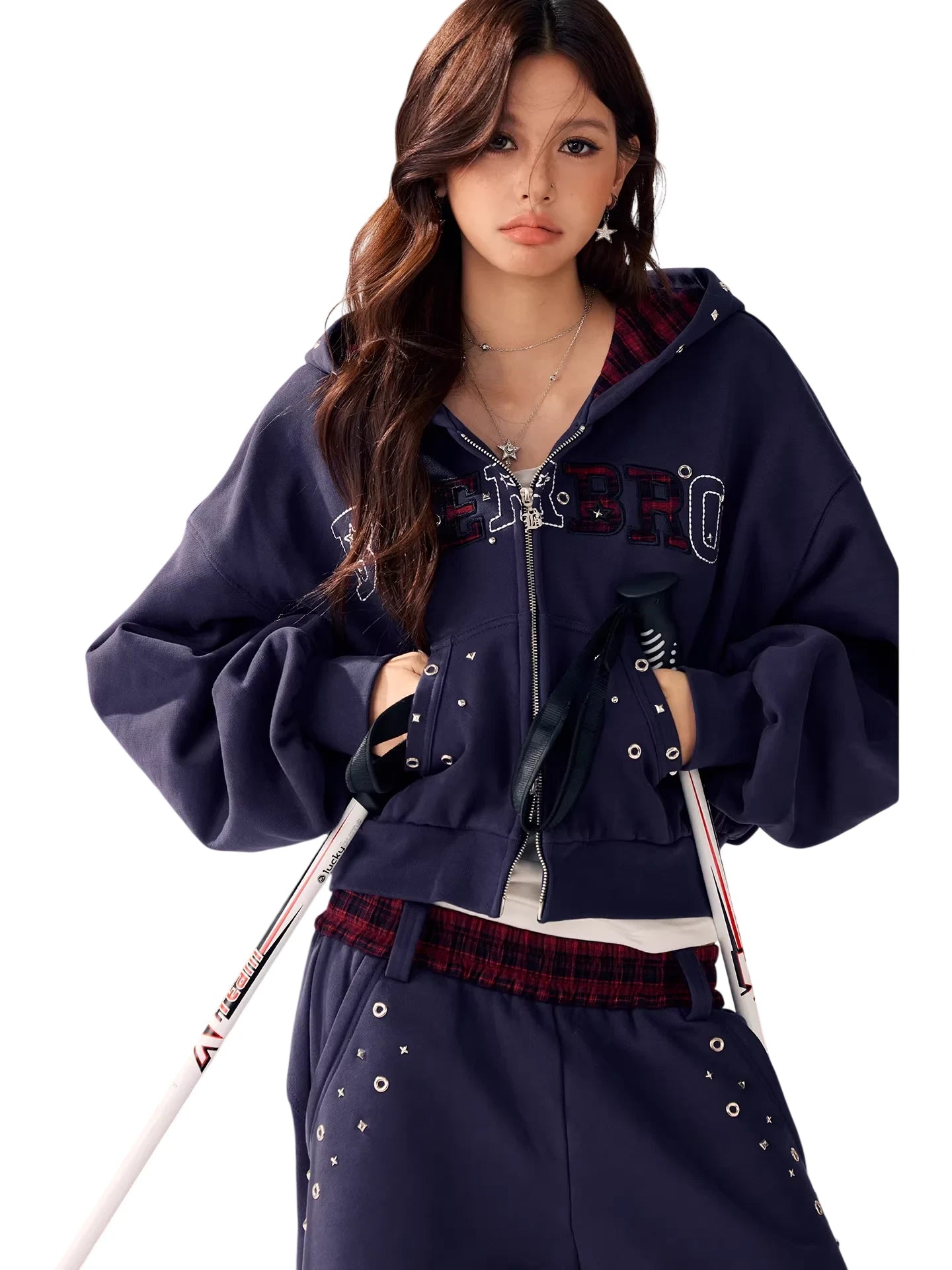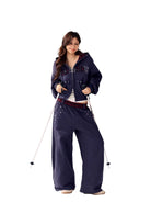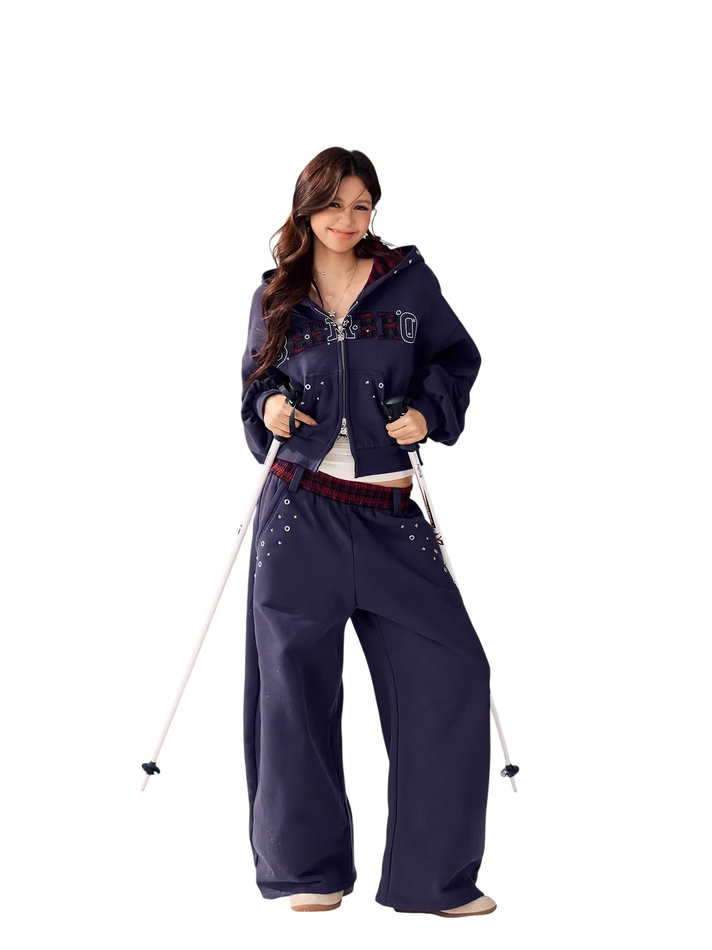 Perfect for casual wear, the set includes a cropped zip-up hoodie with decorative eyelets and studs on the front pockets and chest area, along with a drawstring hood for added warmth. A bold stitched logo across the chest adds visual contrast and flair. Ideal for young women seeking a blend of function and fashion in their winter wardrobe.
