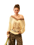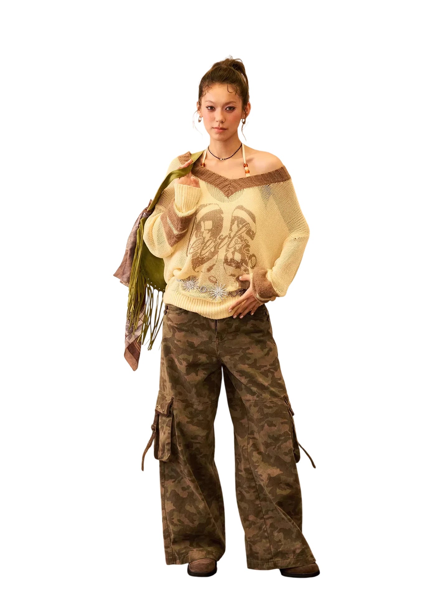 This women's loose knit cardigan sweater features a casual, comfortable fit with a deep V-neckline. The light beige base is accented with brown trim along the neckline and cuffs, adding a touch of contrast. A whimsical printed design of two Santa hat-wearing characters decorates the front, complemented by floral-style embroidery detail near the hem. Perfect for a playful, relaxed look, this cardigan pairs effortlessly with street-style staples like camouflage pants.