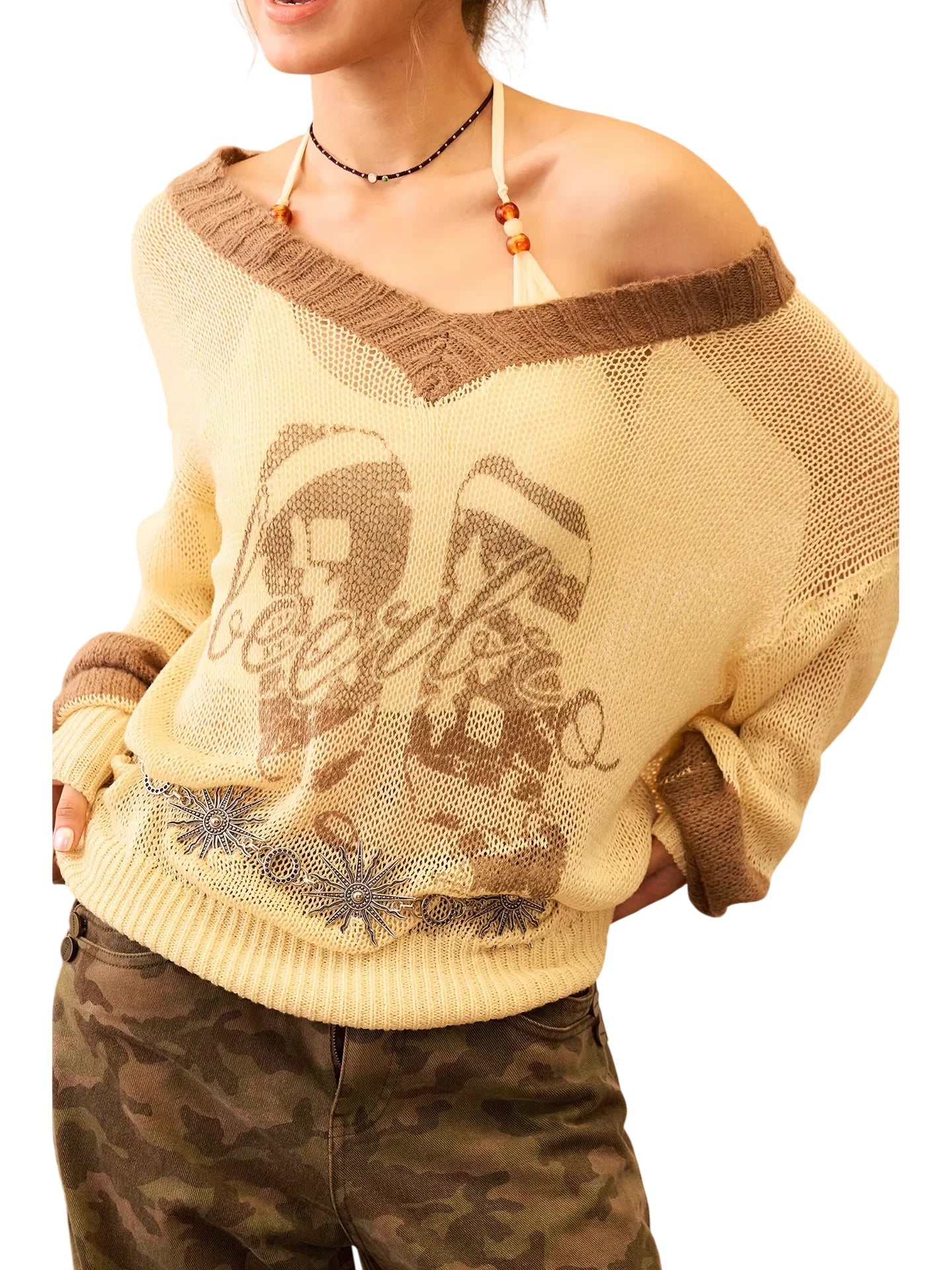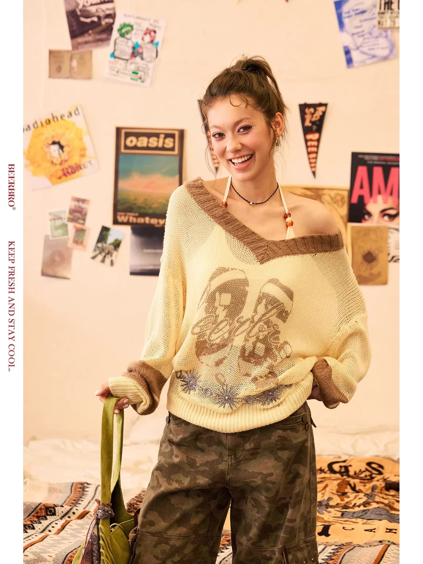 BeerBro Loose Knit Graphic V-Neck Cardigan Sweater