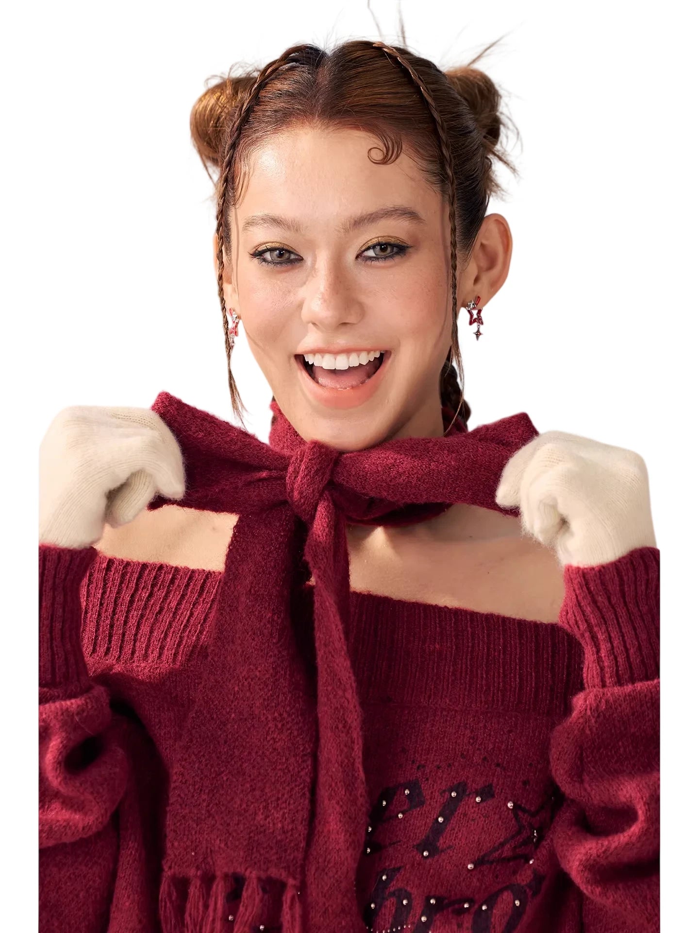 This women's off-shoulder pullover sweater is crafted from soft and comfortable Merino wool, offering a cozy and stylish fit perfect for cooler seasons. Featuring a festive burgundy hue and textured knit design, it includes ribbed cuffs and long sleeves for added warmth. Subtle letter embellishments on the front add a playful touch, while the off-shoulder cut and coordinating long scarf tied in a bow lend a charming, holiday-ready look. Ideal for seasonal gatherings or cozy winter outings.