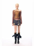 Make a bold statement with this off-shoulder mesh long sleeve top featuring a stylish snake print design and gradient color effect. Designed with a faux two-piece look, it includes an asymmetrical sheer overlay that exudes edgy, streetwear-inspired vibes. The raw hem and one-shoulder silhouette create a grunge aesthetic, while the distressed details add texture and modern flair. A matching tank underneath displays a playful slogan, enhancing the layered style. Perfect for the fashion-forward woman seeking a unique urban look.