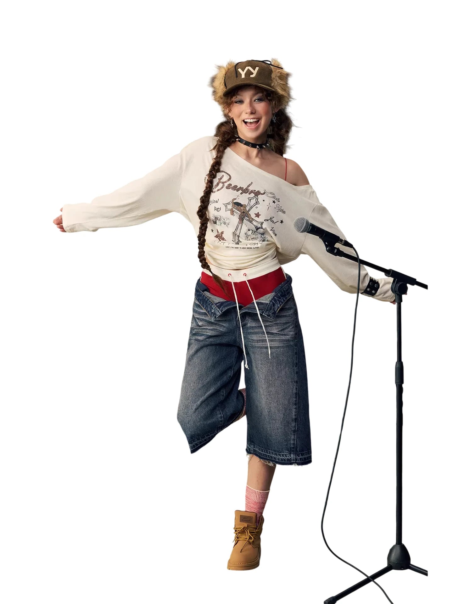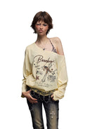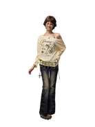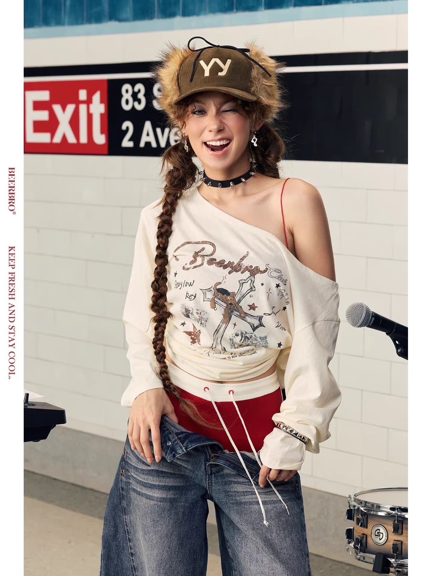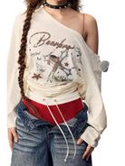 Make a bold statement with this women's off-shoulder oversized T-shirt, featuring a distressed cross graphic and edgy rock-inspired design. Crafted in a soft cream shade, it offers a relaxed fit for ultimate comfort while embracing a rebellious aesthetic. The drawstring waist cinches gently for added style, complemented by long sleeves with printed details near the cuffs. Pair it with your favorite denim and accessories to complete your street-style look.