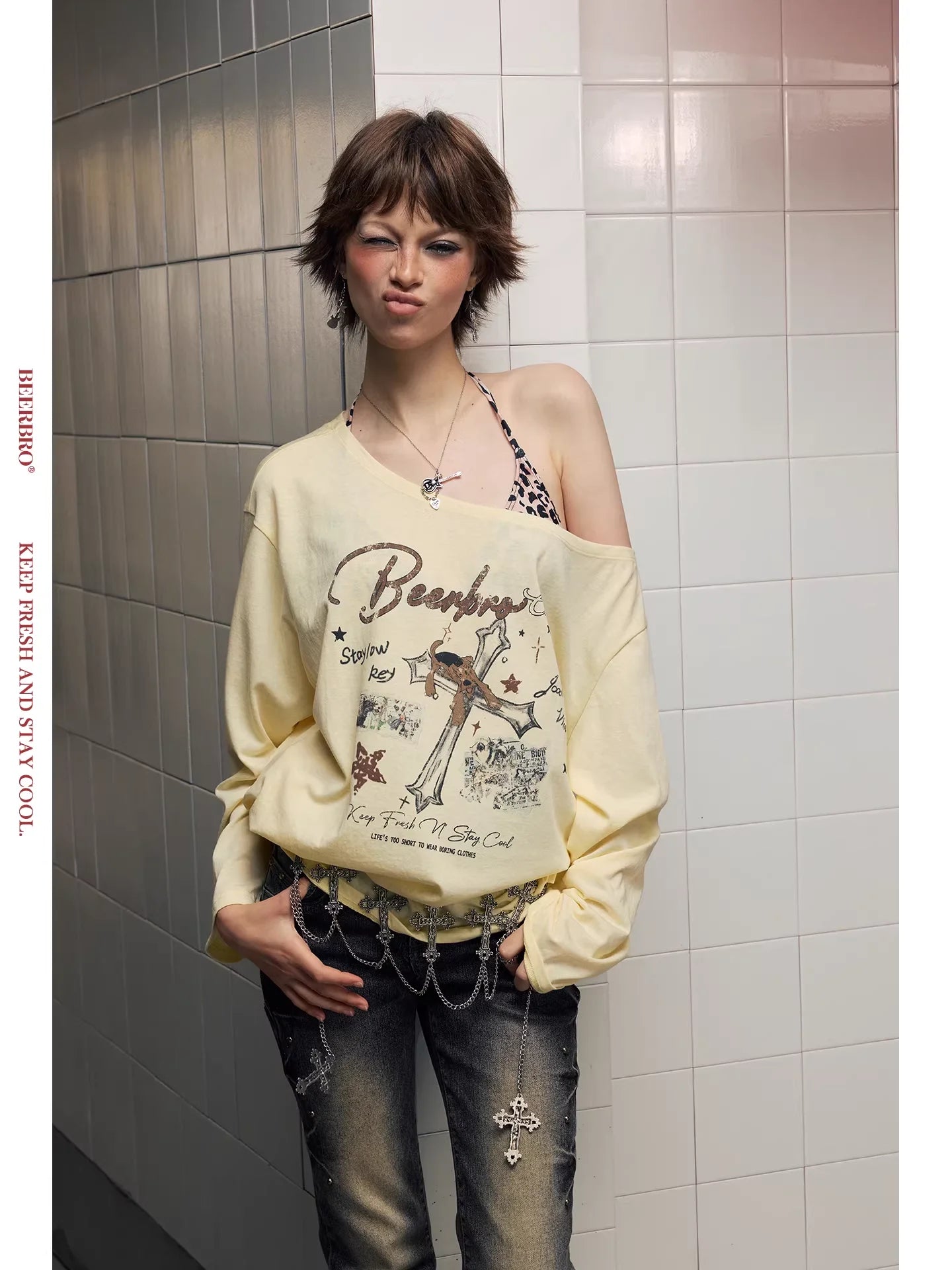 BeerBro Off-Shoulder Punk Oversized T-Shirt with Distressed Cross Graphic