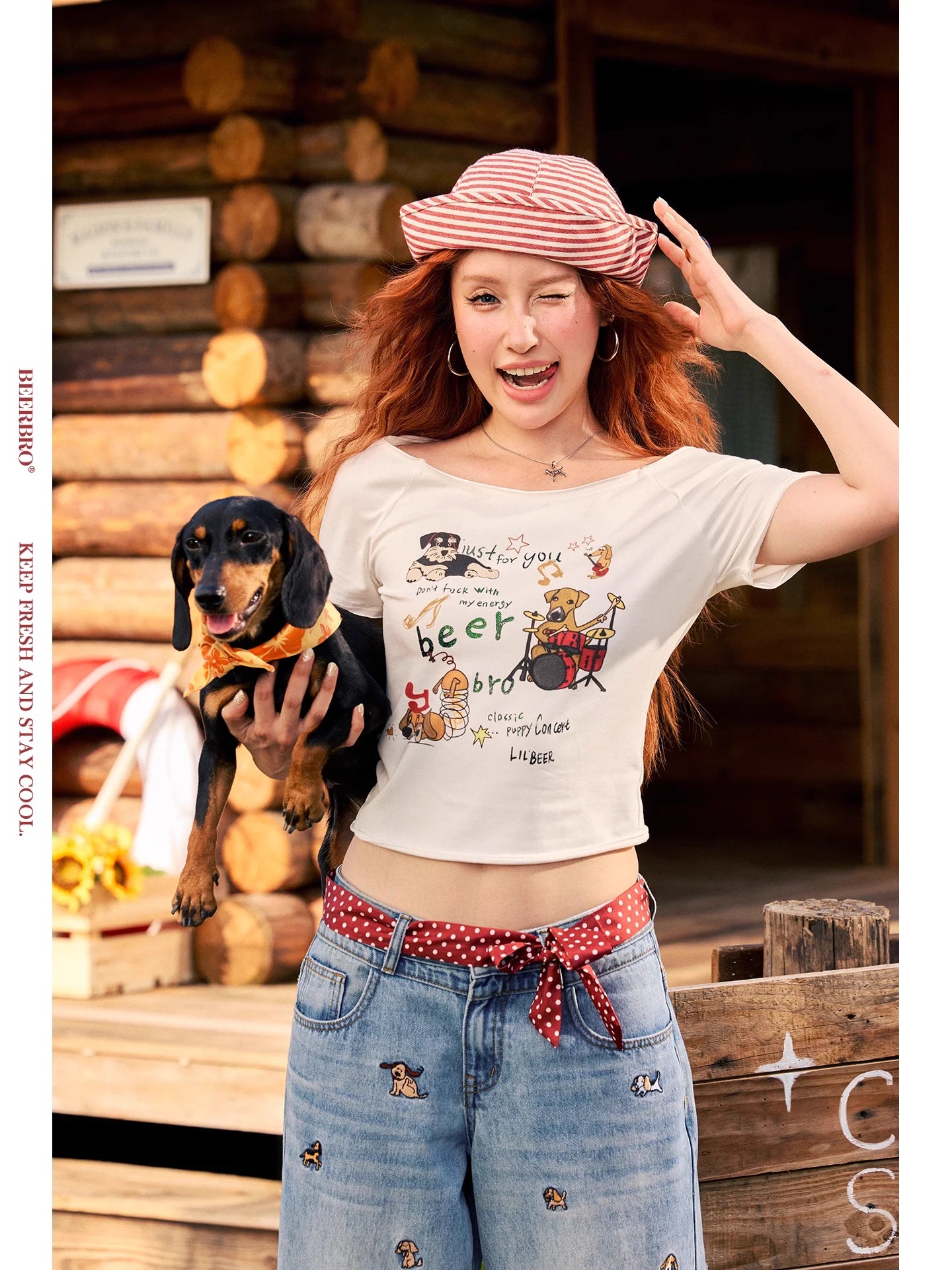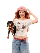 BeerBro Off-Shoulder Slim Fit T-Shirt with Cartoon Print for Women