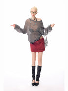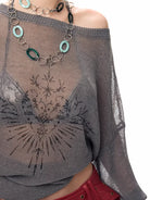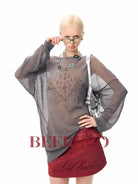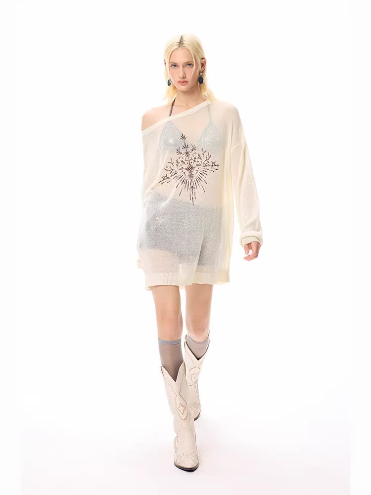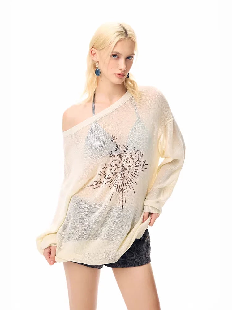 This women's sheer knit cover-up top features a lightweight imitation linen fabric with silver threading, offering the perfect blend of elegance and ease. Designed with the flexibility to be styled off-the-shoulder or with an asymmetrical neckline, the top presents an effortlessly chic silhouette. The subtle center print adds artistic detail, while the transparent texture allows for stylish layering. Ideal for casual outings or beachwear, this oversized long-sleeve top brings a modern, fashion-forward flair to any look.