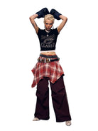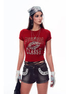 This women's slim fit crop T-shirt combines comfort with bold streetwear style. Made from a skin-friendly fabric, it features metallic-text rhinestone details and a standout graphic print on the front. Designed for a flattering fit, it pairs perfectly with cargo pants for a trendy, urban look. Ideal for fashion-forward individuals looking to make a statement.