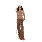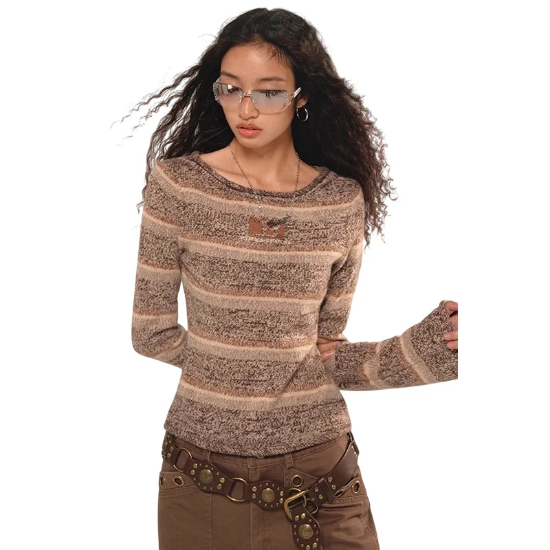 This women's slim-fit knit sweater features a classic striped pattern in warm beige and brown tones, ideal for fall and winter styles. The soft, textured fabric offers comfort, while the long sleeves flare subtly at the cuffs for a relaxed, bohemian touch. A boat neckline completes the casual yet stylish look, perfect for pairing with a variety of bottoms for everyday wear.