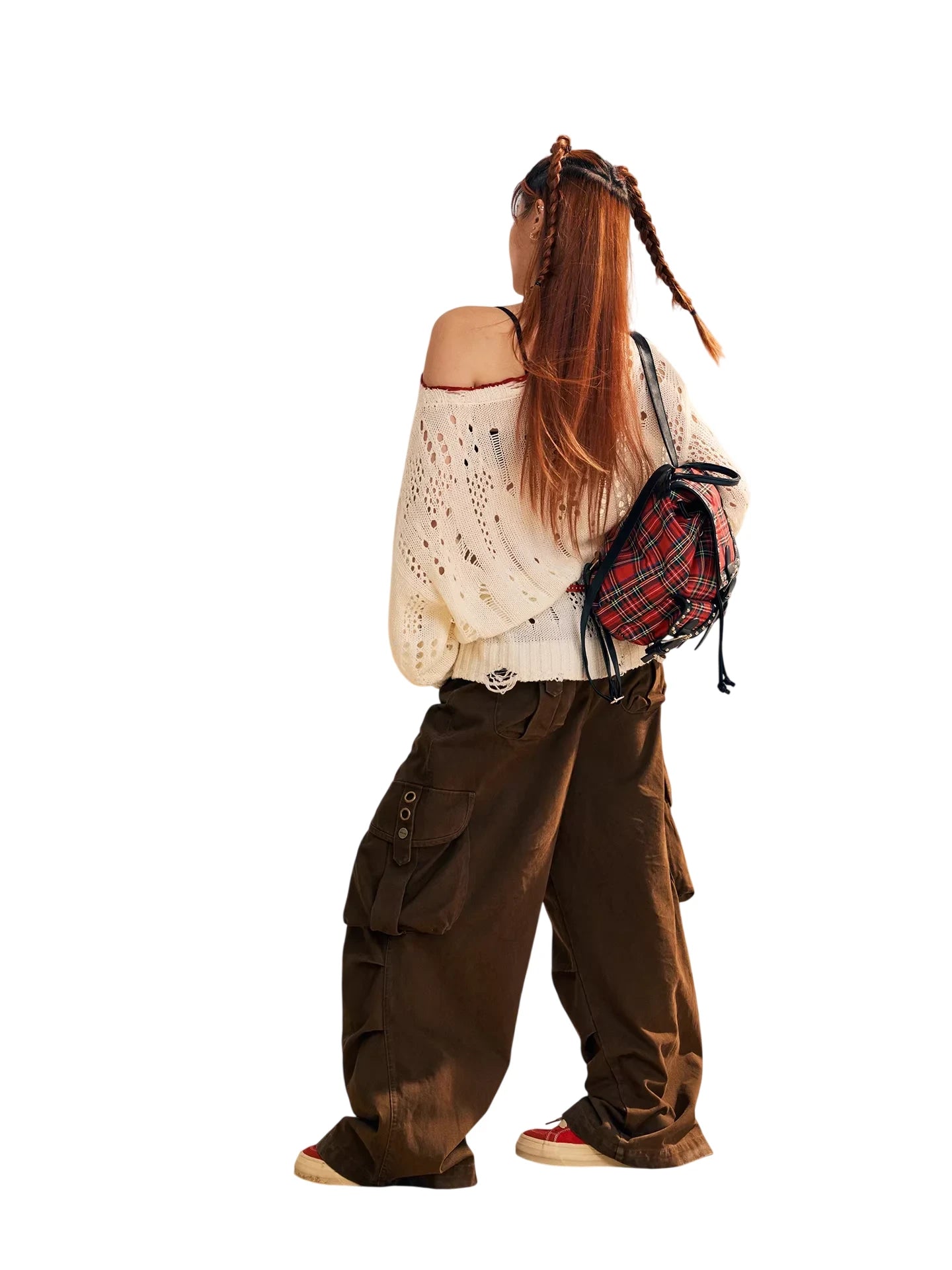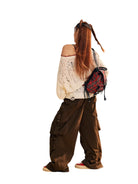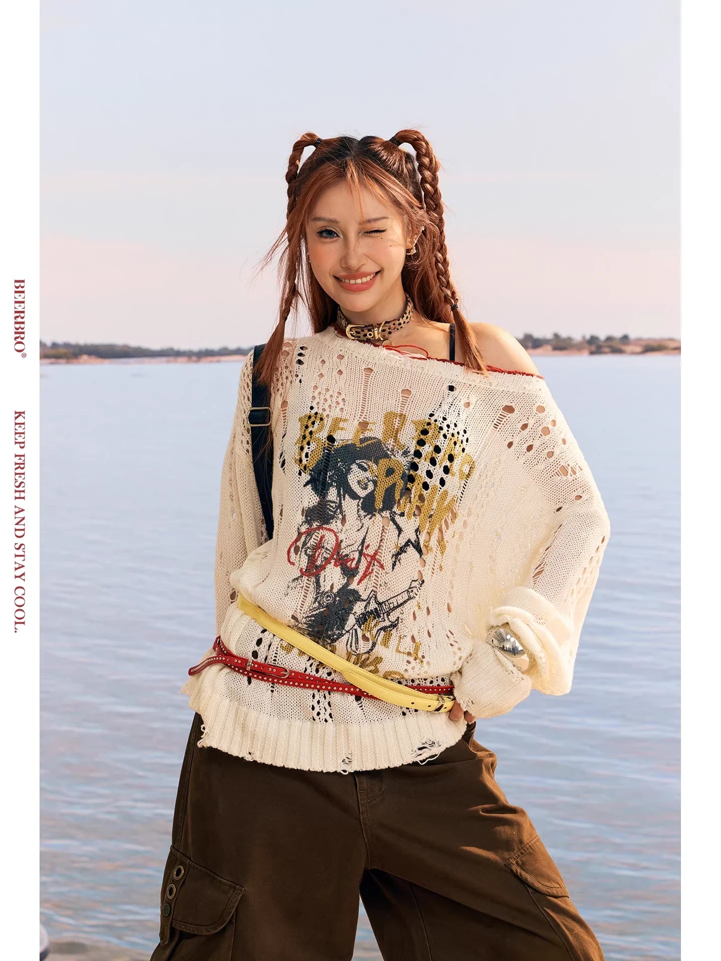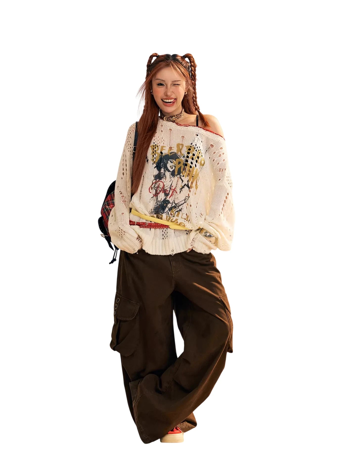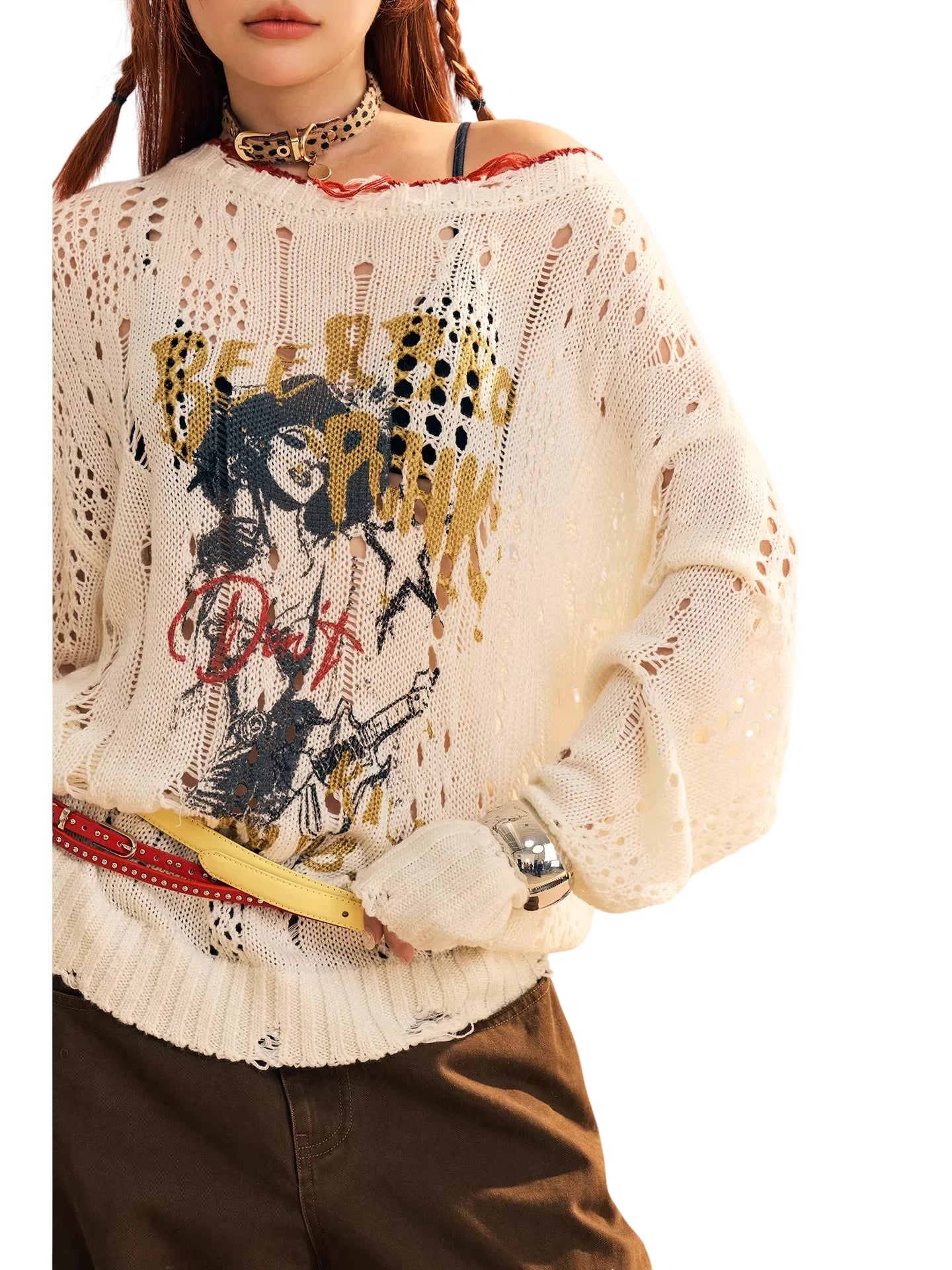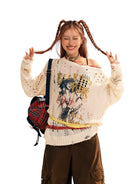 Stay cozy and stylish with this women's merino wool knit sweater, perfect for the autumn and winter seasons. Featuring a loose, oversized fit with an off-shoulder design, this cream-colored sweater offers both comfort and trend-forward appeal. The hollow knit pattern and distressed detailing add a touch of edge, while the bold printed graphic and text artwork on the front create a statement look. Finished with a street-style flair and ideal for layering, this piece effortlessly combines softness with individuality.