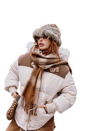 Stay warm and stylish with this women's colorblock puffer jacket, perfect for winter weather. Designed with a thick, padded construction and a loose fit, this jacket offers both comfort and insulation during colder months. The jacket features a cozy hood trimmed with soft faux fur and a bold embroidered chest logo for added flair. The color combination of off-white and brown adds a trendy street-style edge, ideal for urban wear. Pair it with your favorite scarf and bag for a complete winter look.