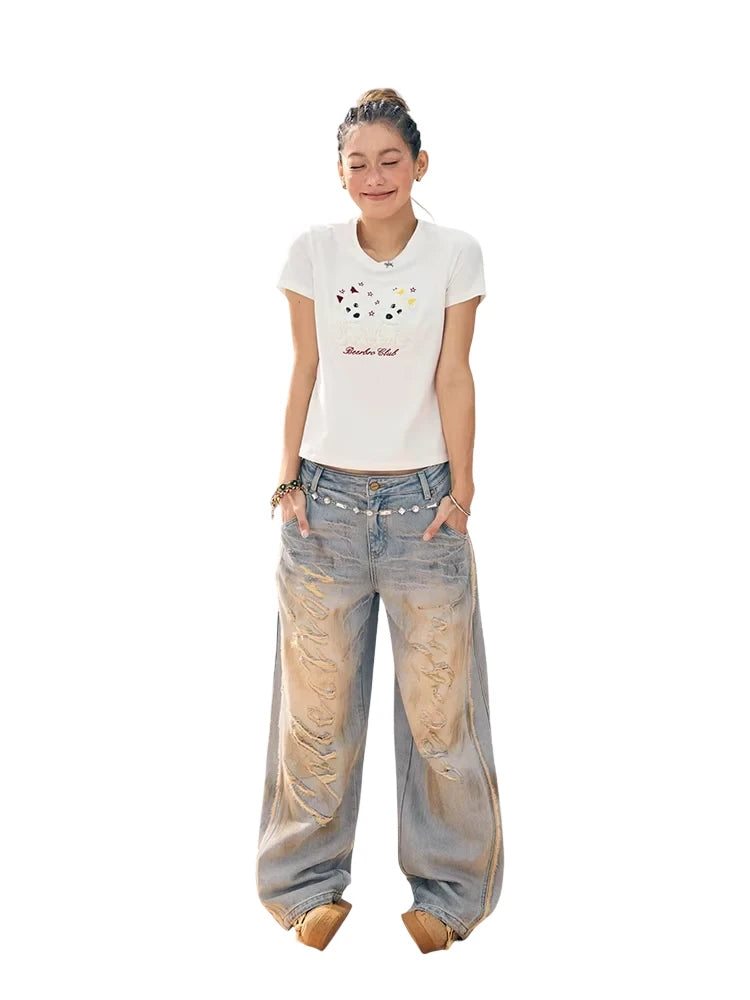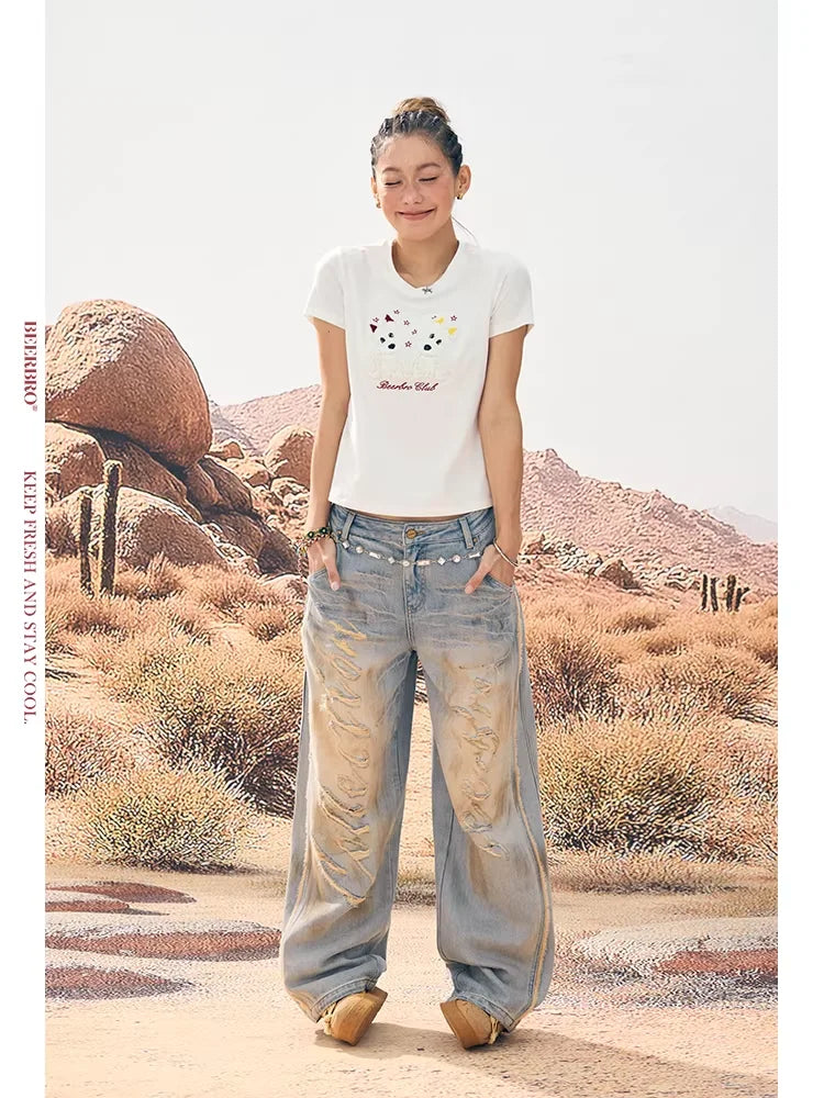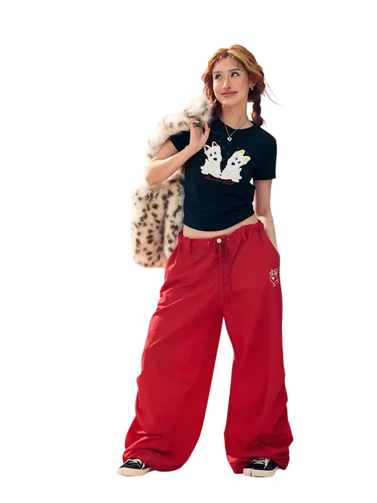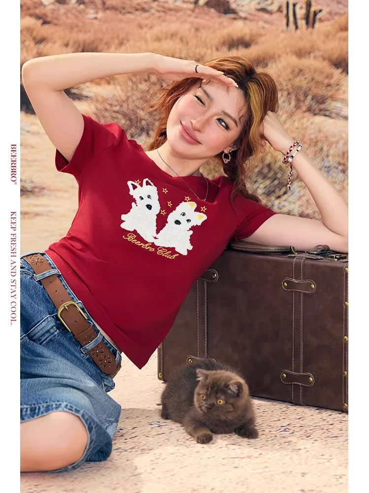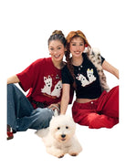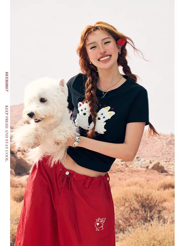 This women's short sleeve crop top features a playful embroidered design of two schnauzer puppies on the front, adding a touch of charm to your summer wardrobe. Designed with a relaxed drop shoulder fit and soft towel-style embroidery, it's perfect for casual days. The stylish black color pairs effortlessly with a variety of bottoms, while the lightweight fabric ensures comfort during warm weather.