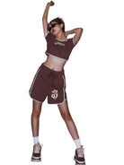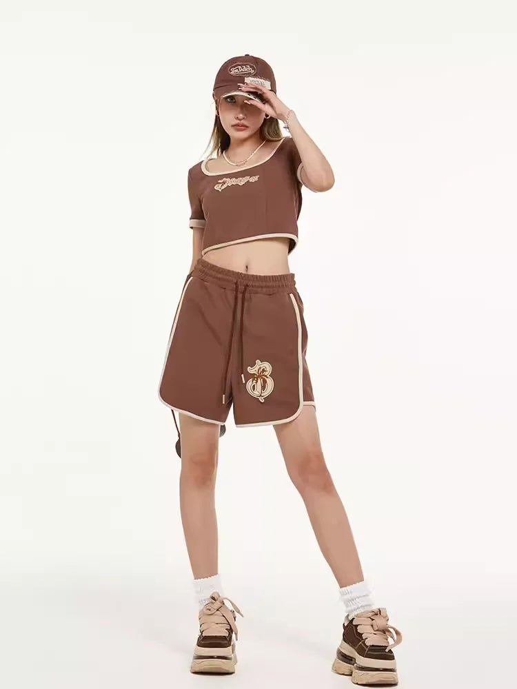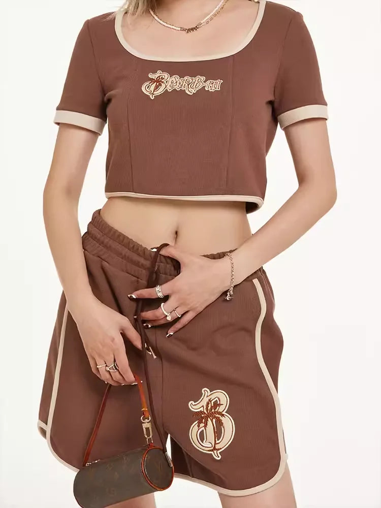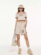 Stay stylish and comfortable in this women's casual two-piece set, featuring a cropped short-sleeve top and matching drawstring shorts. The outfit is designed in a soft beige color with contrasting dark brown trim along the sleeves, neckline, and hems for a sporty retro vibe. The embroidered U-neck crop top includes a chest graphic, while the shorts are accented with a bold decorative design on one leg. Perfect for lounging or casual outings, this set combines fashion and ease in one coordinated look.