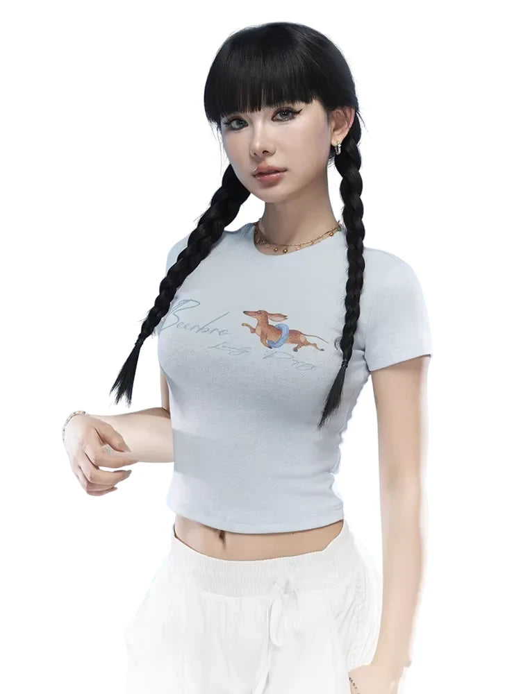 Stay stylish and cool this summer with this slim fit cropped t-shirt for women. Designed with a round neckline and short sleeves, this top features a playful dachshund illustration with summer-themed elements. Perfect for casual outings, it offers a flattering fit and a fun, youthful look.