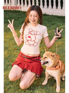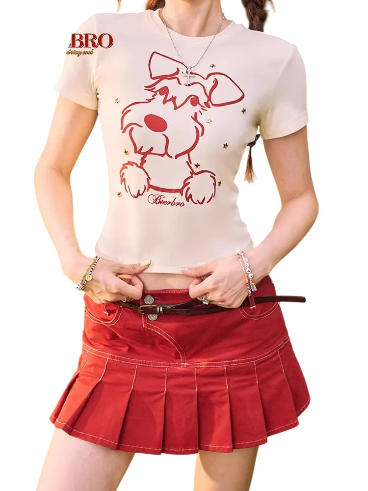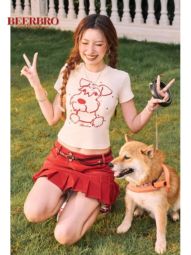 This women's summer t-shirt offers a slim fit and features a charming red line-art graphic of a dog with a bow and playful lettering on the chest. Made with short sleeves, it's perfect for warm weather and casual outings. The soft material and fitted cut make it a stylish and comfortable choice for dog lovers looking to showcase personality in their wardrobe.