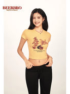 Embrace a stylish and youthful look with this women's slim fit crop top. Designed with short sleeves and a flattering silhouette, this top features a tropical floral print with pink blooms and figs. The graphic includes the phrases "CLASSY & FABULOUS" and "BEERBRO," adding a trendy and playful touch. Perfect for summer days, it pairs effortlessly with any high-waisted bottoms for an edgy and modern ensemble.