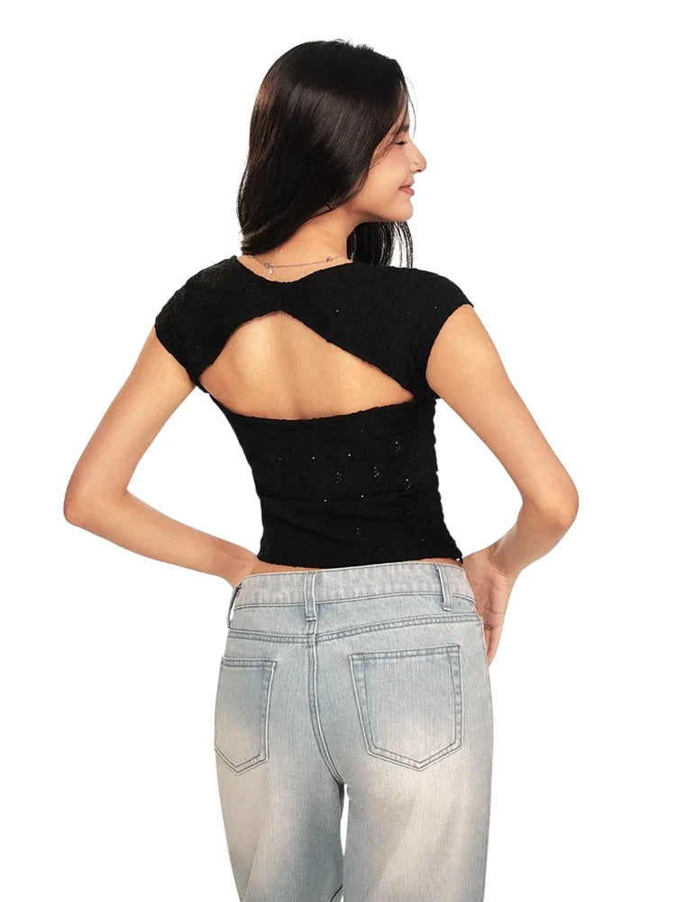 Elevate your summer wardrobe with this elegant and feminine short sleeve top. Designed with a sweetheart neckline, delicate lace fabric, and ruched detailing, this top provides a charming blend of sweet and spicy style. The button accents down the front add a vintage touch, while the backless design keeps it fresh for warm weather wear. Perfectly paired with skirts or jeans, this top is ideal for casual outings or dressed-up occasions.