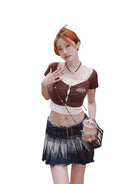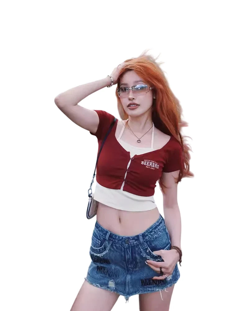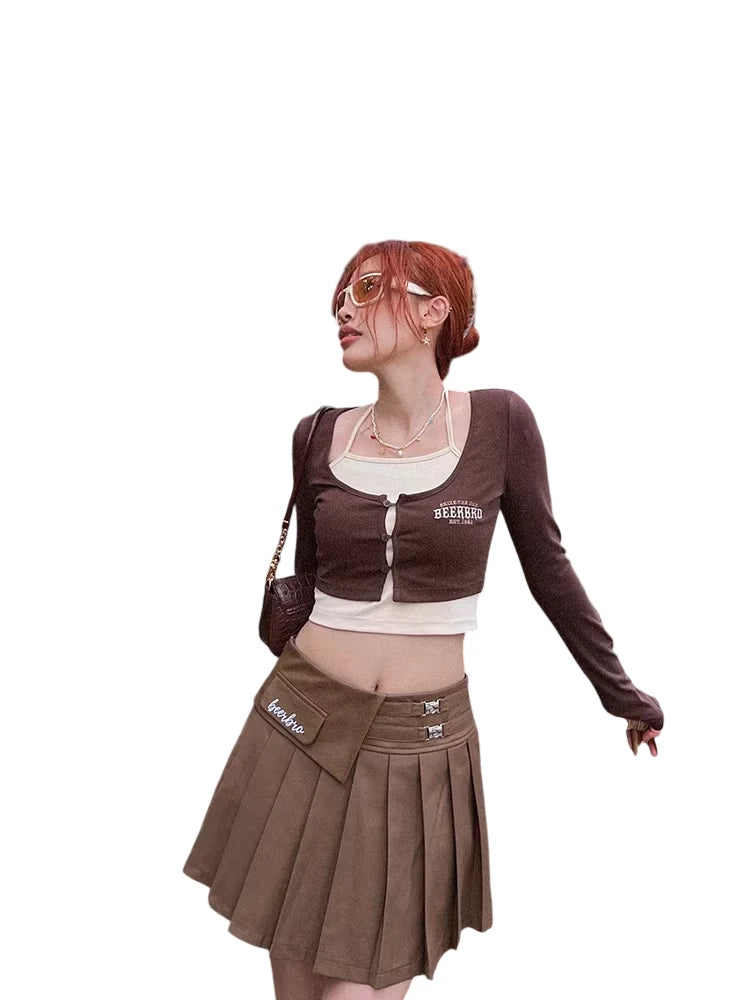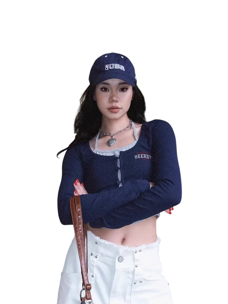 Elevate your streetwear game with this American-inspired women's long sleeve top featuring a trendy faux two-piece design. Ideal for spring and autumn, this slim-fit cropped cardigan effortlessly blends casual and chic with its layered look and button-up front. The contrasting underlayer creates a stylish illusion of multiple pieces, making it a versatile wardrobe staple for transitional weather.