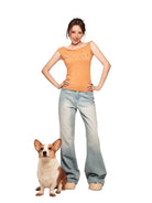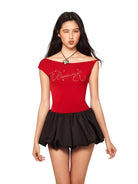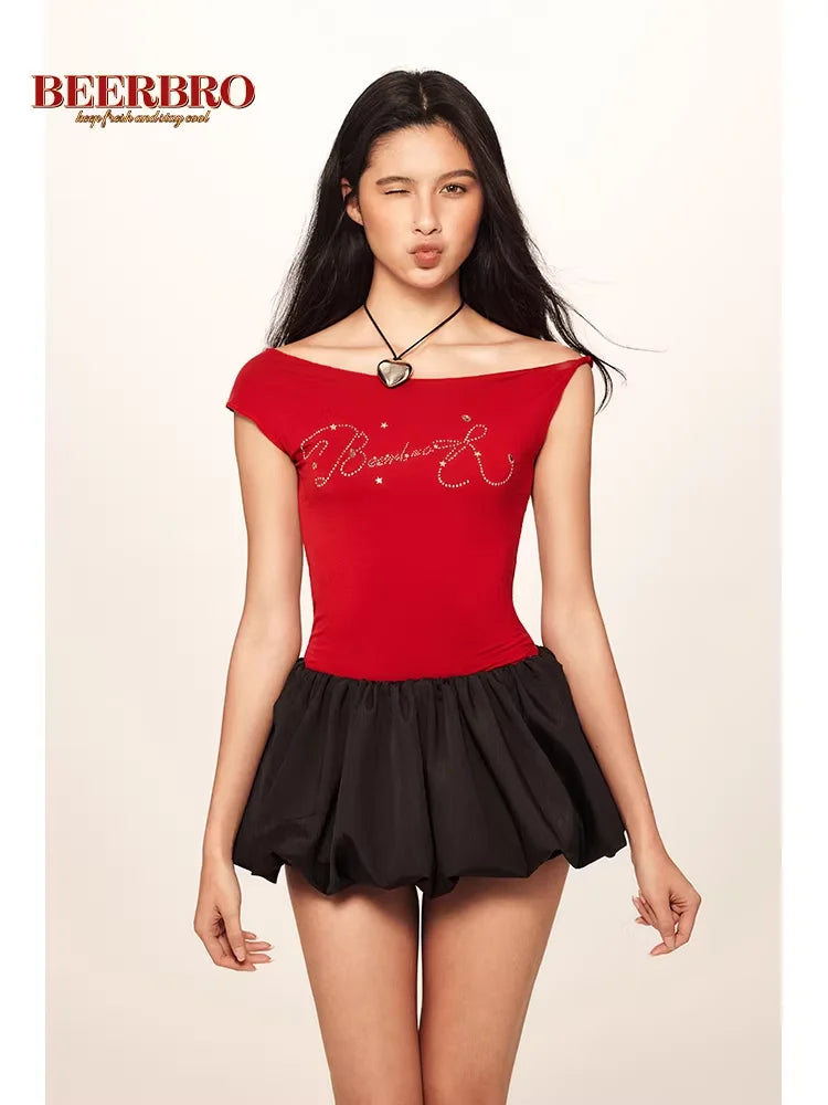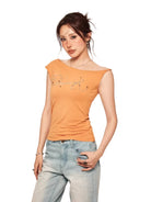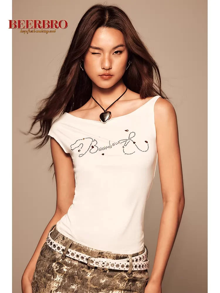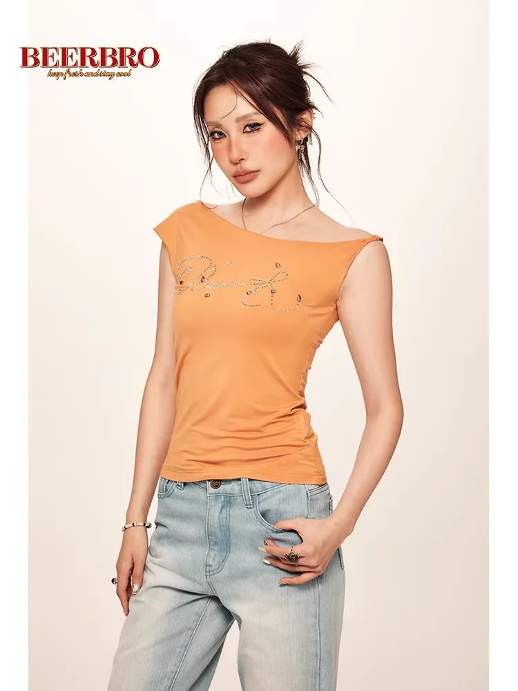 BeerBro Y2K Asymmetrical Off-Shoulder Rhinestone T-Shirt