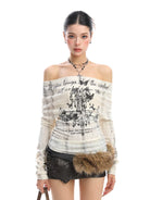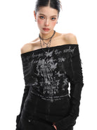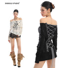 This women's off-shoulder long sleeve t-shirt blends Asian-inspired graffiti elements with a modern darkwear edge, perfect for autumn layering. The front features vintage-style graphic prints, while the standout back design includes a lace-up corset-style tie with silver grommets for added detail. The shirt is shown in two striking variations: a light beige version paired with asymmetrical shorts and brown suede boots for a relaxed look, and a sleek black version that highlights the dramatic back tie detail. An ideal piece for those seeking statement streetwear with an edgy twist.