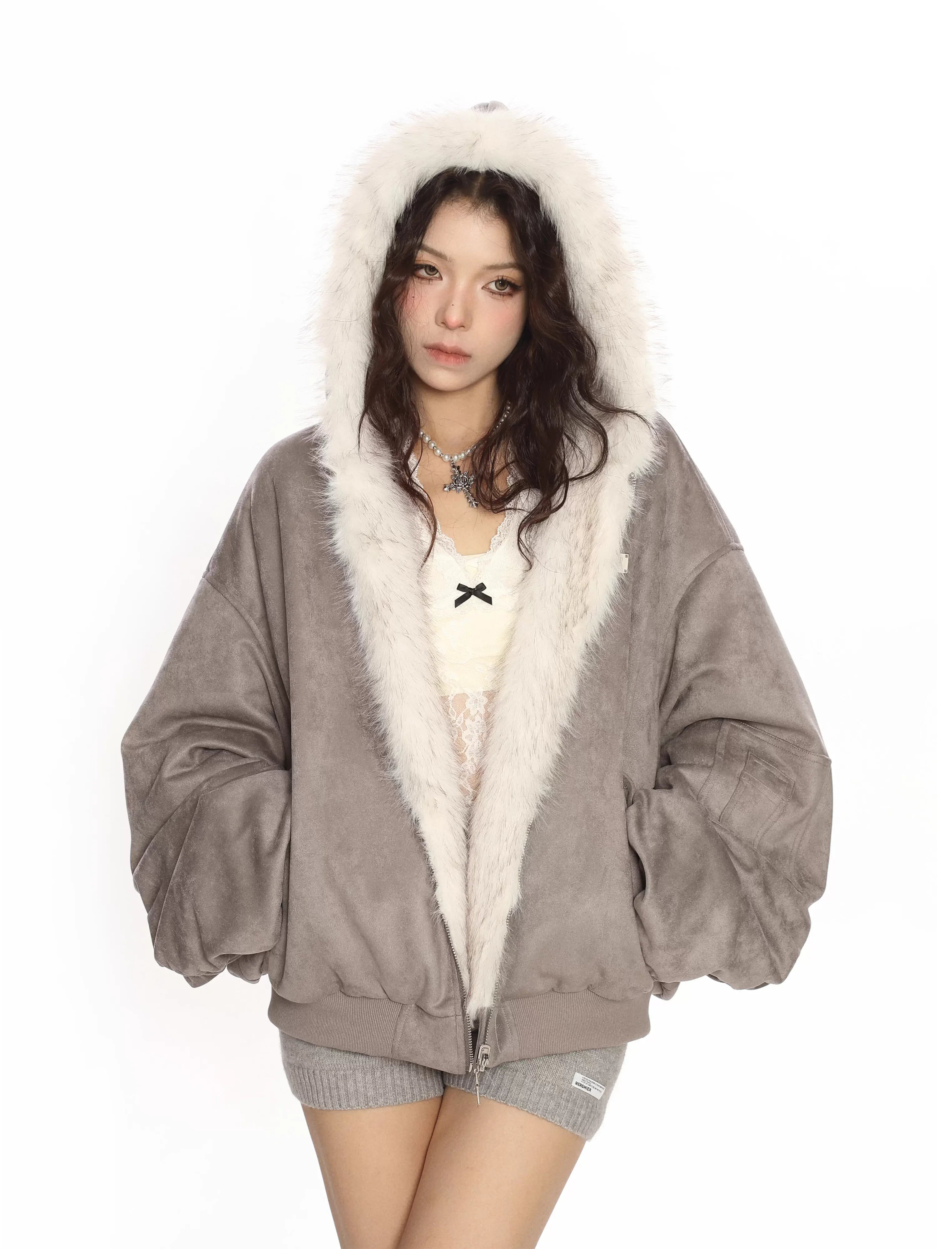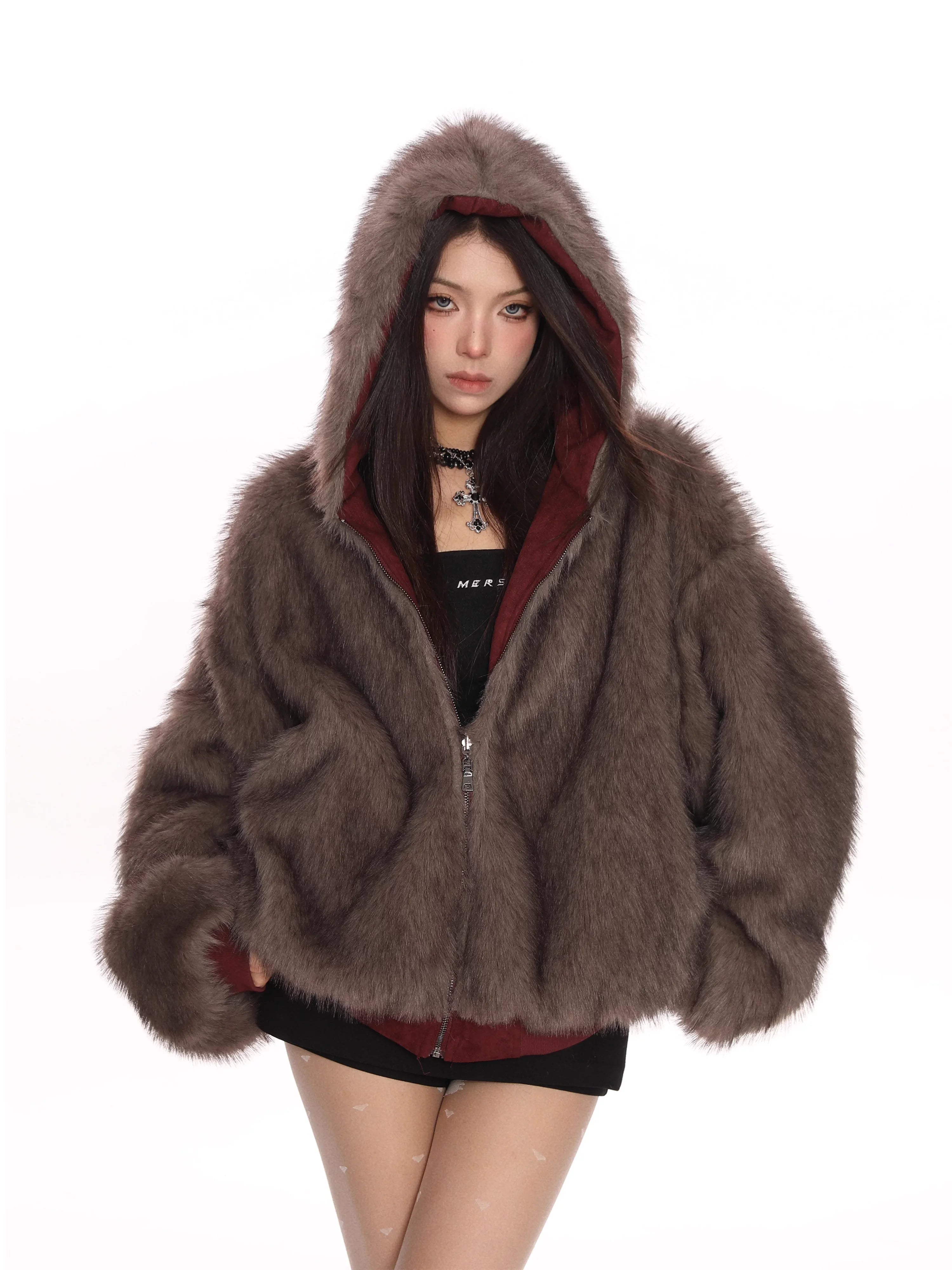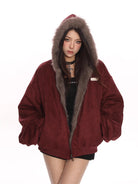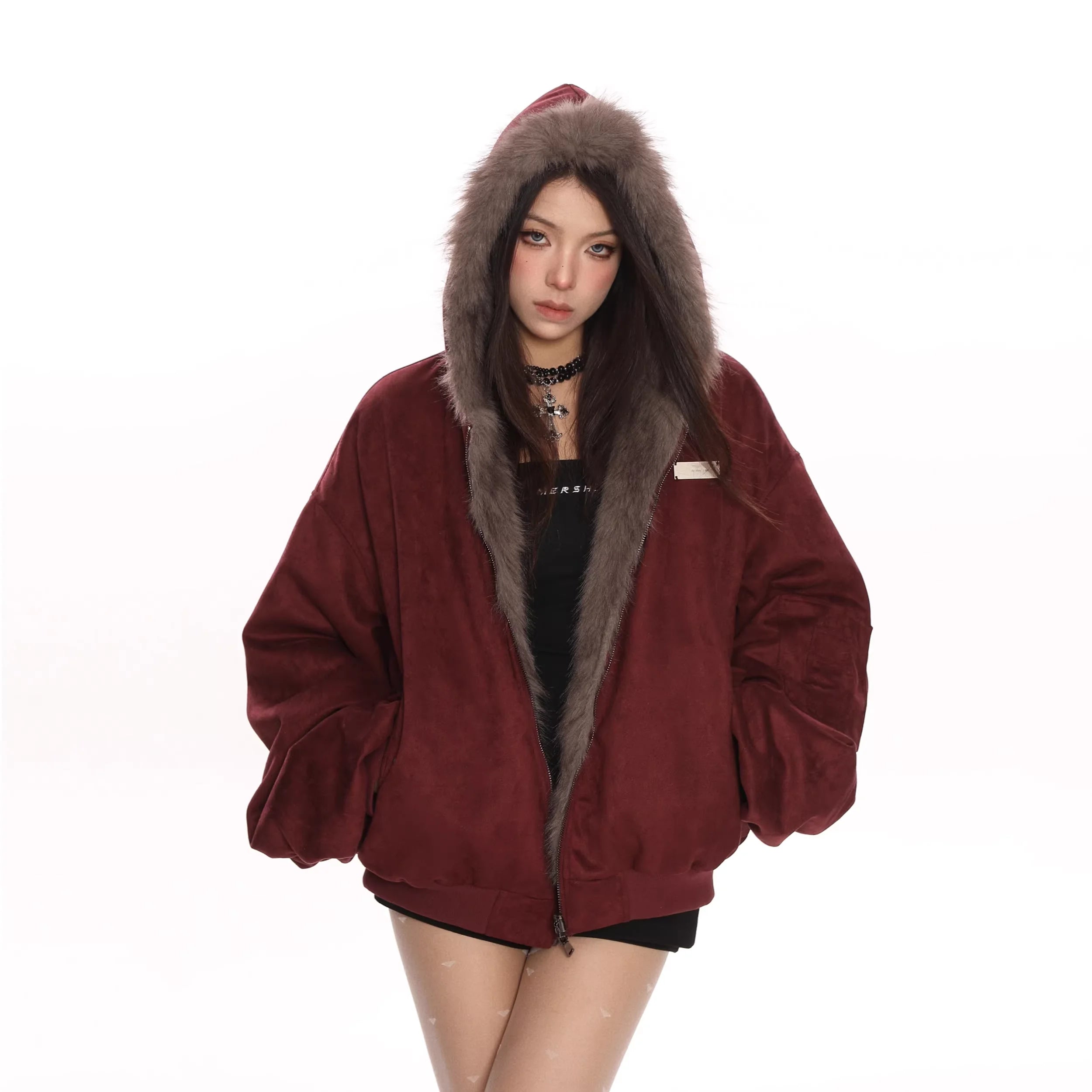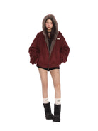 Stay stylish and warm with this wine red reversible winter coat designed for women. Crafted with a soft suede-like exterior and lined with plush grey faux fur, this oversized hooded jacket offers both comfort and versatile fashion. The cotton-padded interior provides added insulation, making it ideal for colder weather. Featuring dropped shoulders, roomy long sleeves with gathered cuffs, and a convenient zip-up front closure, this coat brings a modern street-style appeal to any casual outfit.