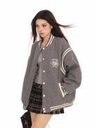 Embrace timeless college-inspired fashion with this women's colorblock varsity jacket. Featuring a stand collar and classic snap-button front, the jacket showcases white striped detailing on the collar, cuffs, and hem for a sporty finish. A crest-style embroidery on the chest adds a traditional academic touch.