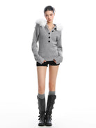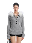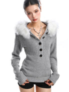 Elevate your autumn wardrobe with this stylish women's Henley knit sweater, blending cozy comfort with on-trend Korean fashion. Featuring a deep V-neckline with five button accents and a detachable white faux fur collar, this sweater adds a luxurious texture to your seasonal look. Long sleeves with ribbed cuffs and a ribbed hem ensure a snug and flattering fit, while the waist-cinching design with hood enhances your silhouette. Perfect for layering or making a statement on its own.