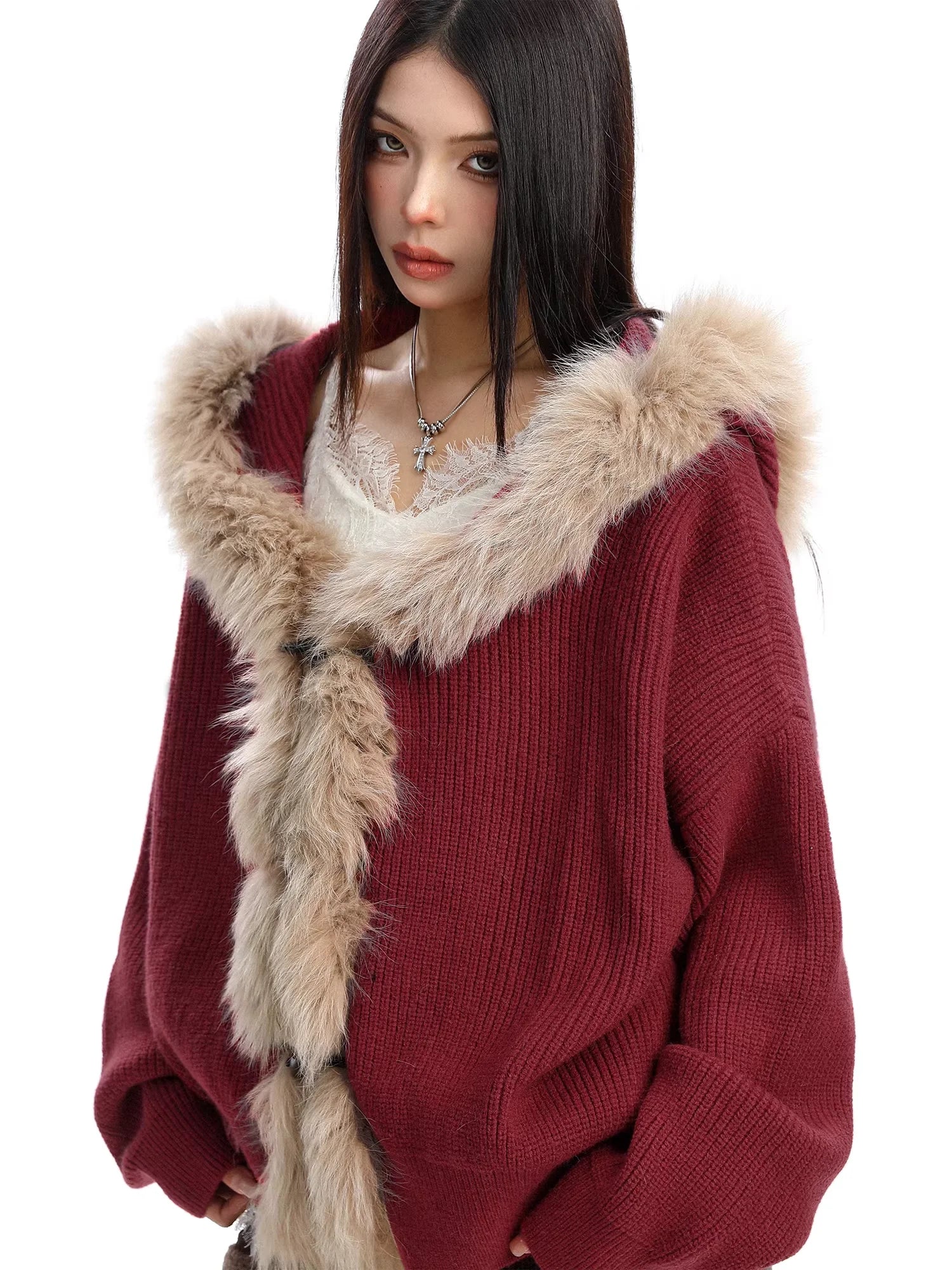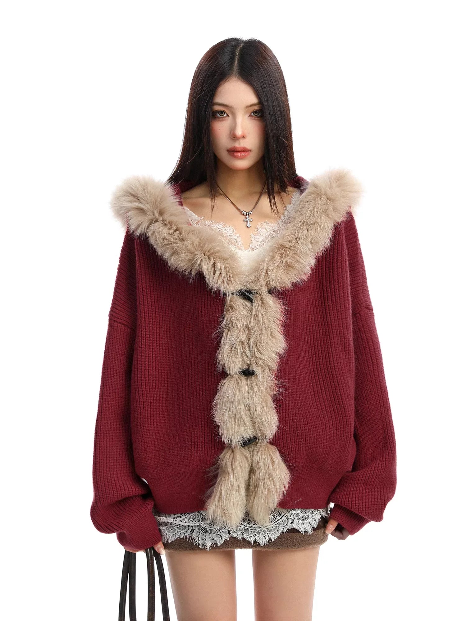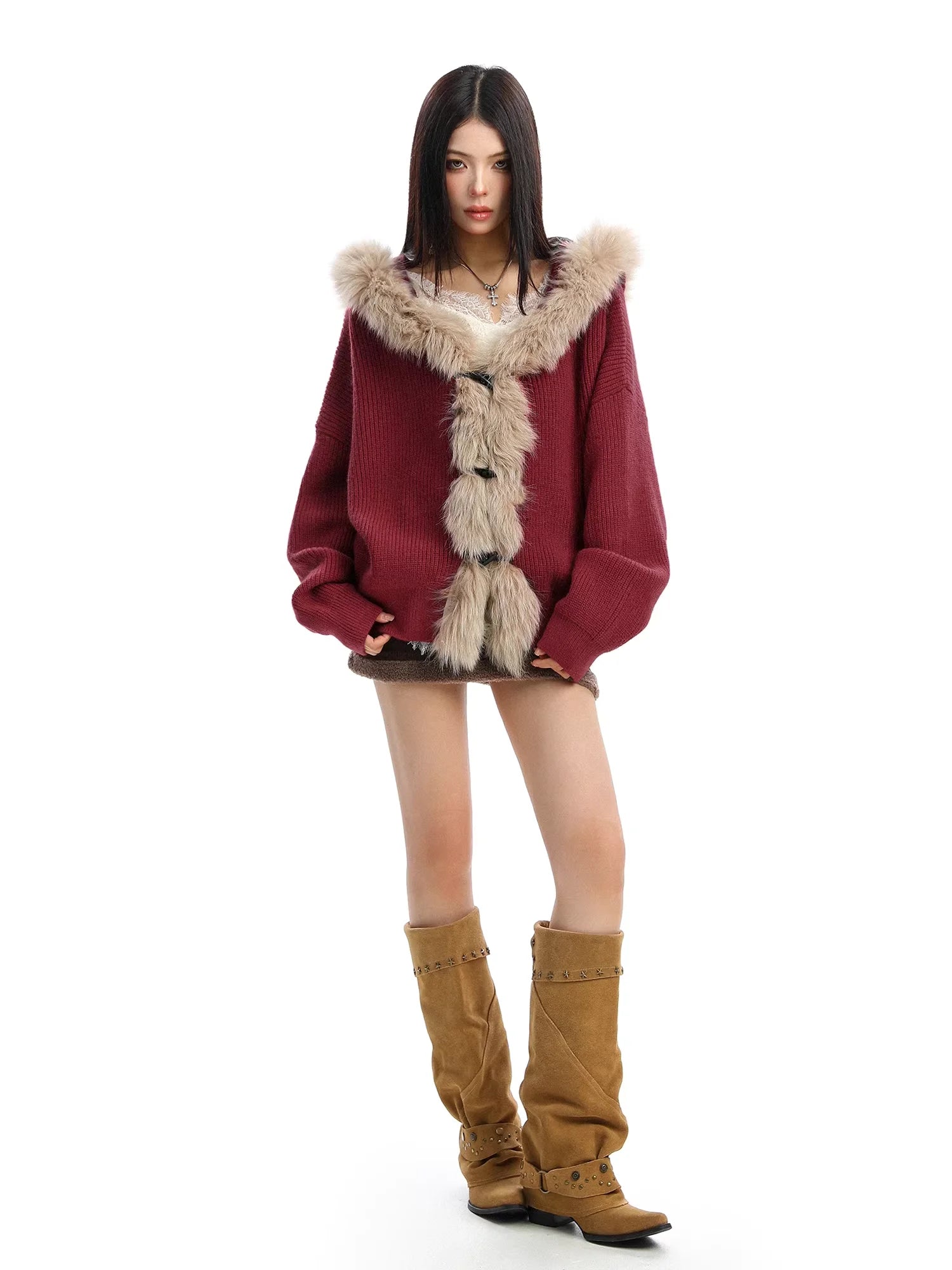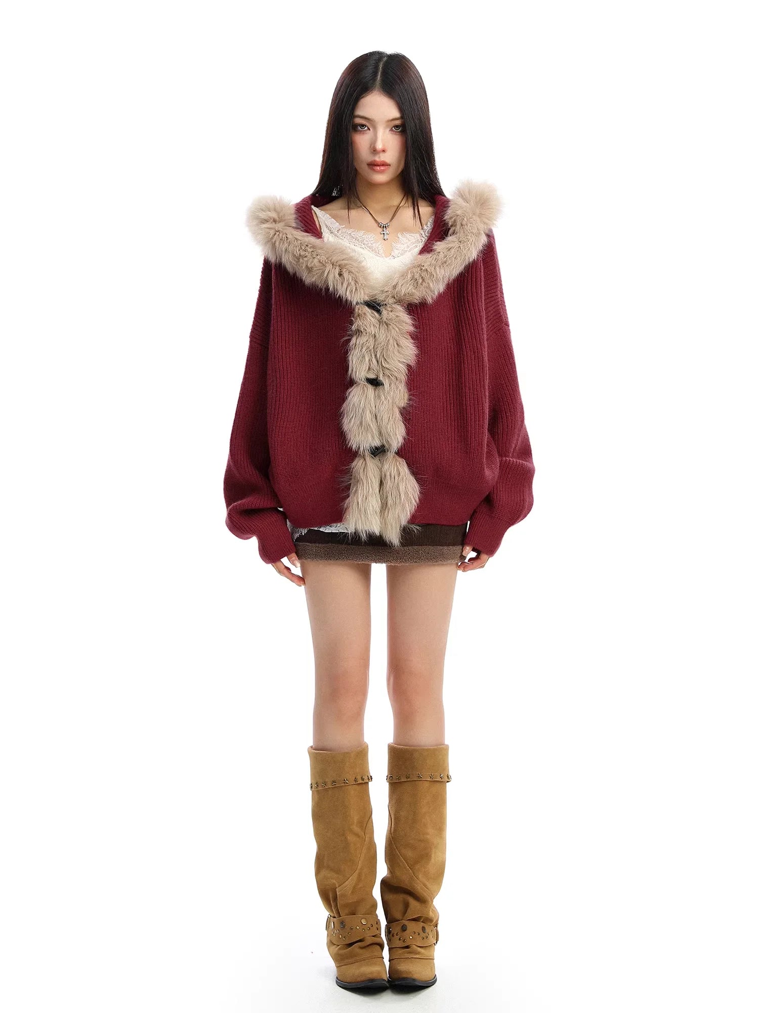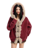 BIGGOLD STUDIO Women's Hooded Knit Cardigan with Faux Fur Trim